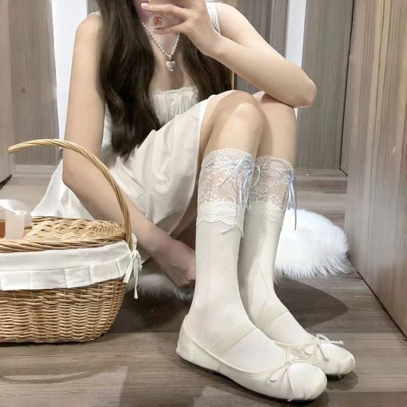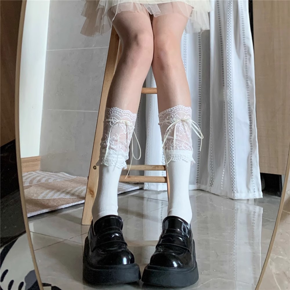 일본식 흰색 레이스 레이스 튜브 양말 여성용 로리타 스타일 리본 묶음 무릎 위 양말 땀 흡수 및 미끄럼 방지스토어 가기