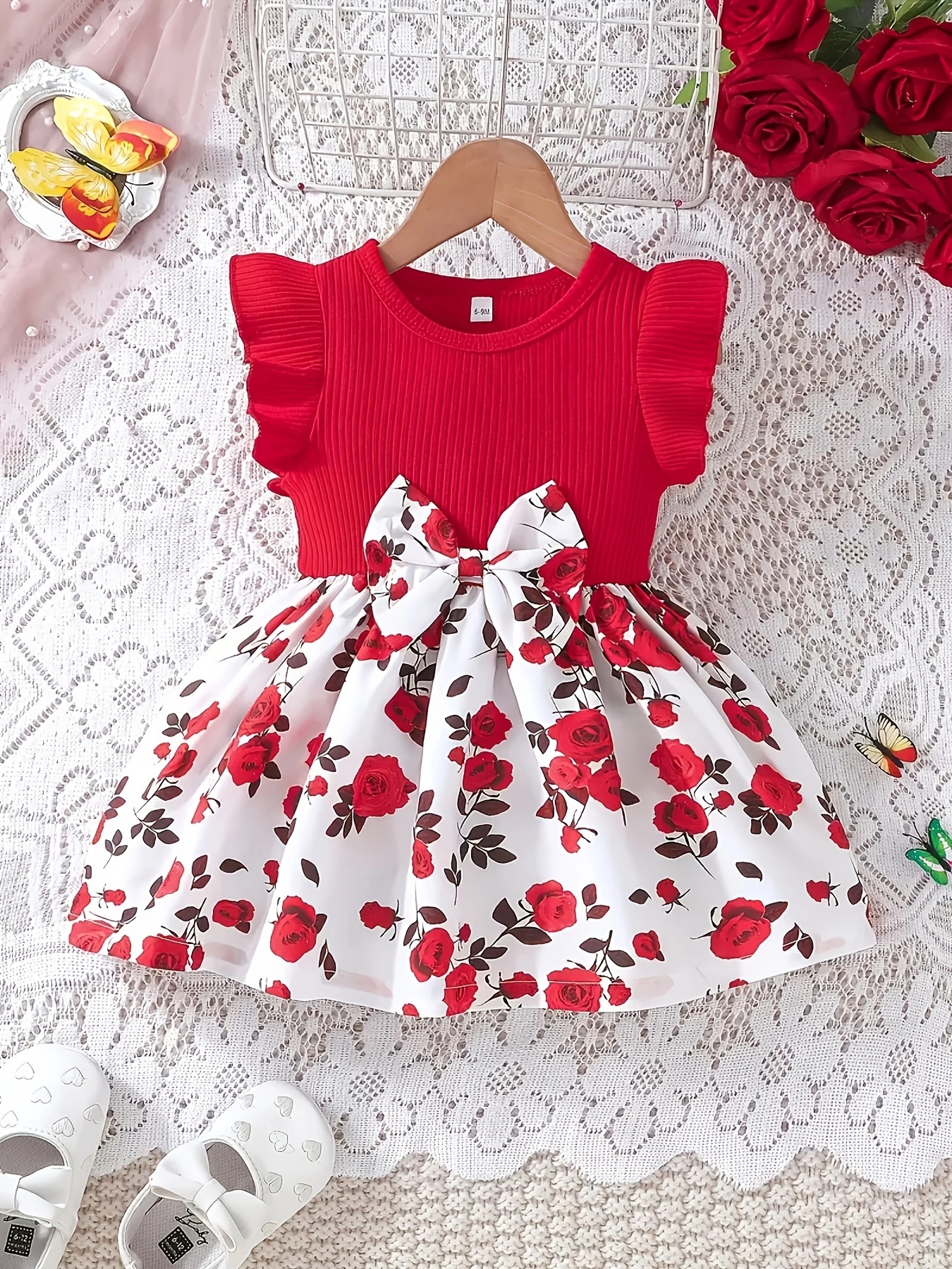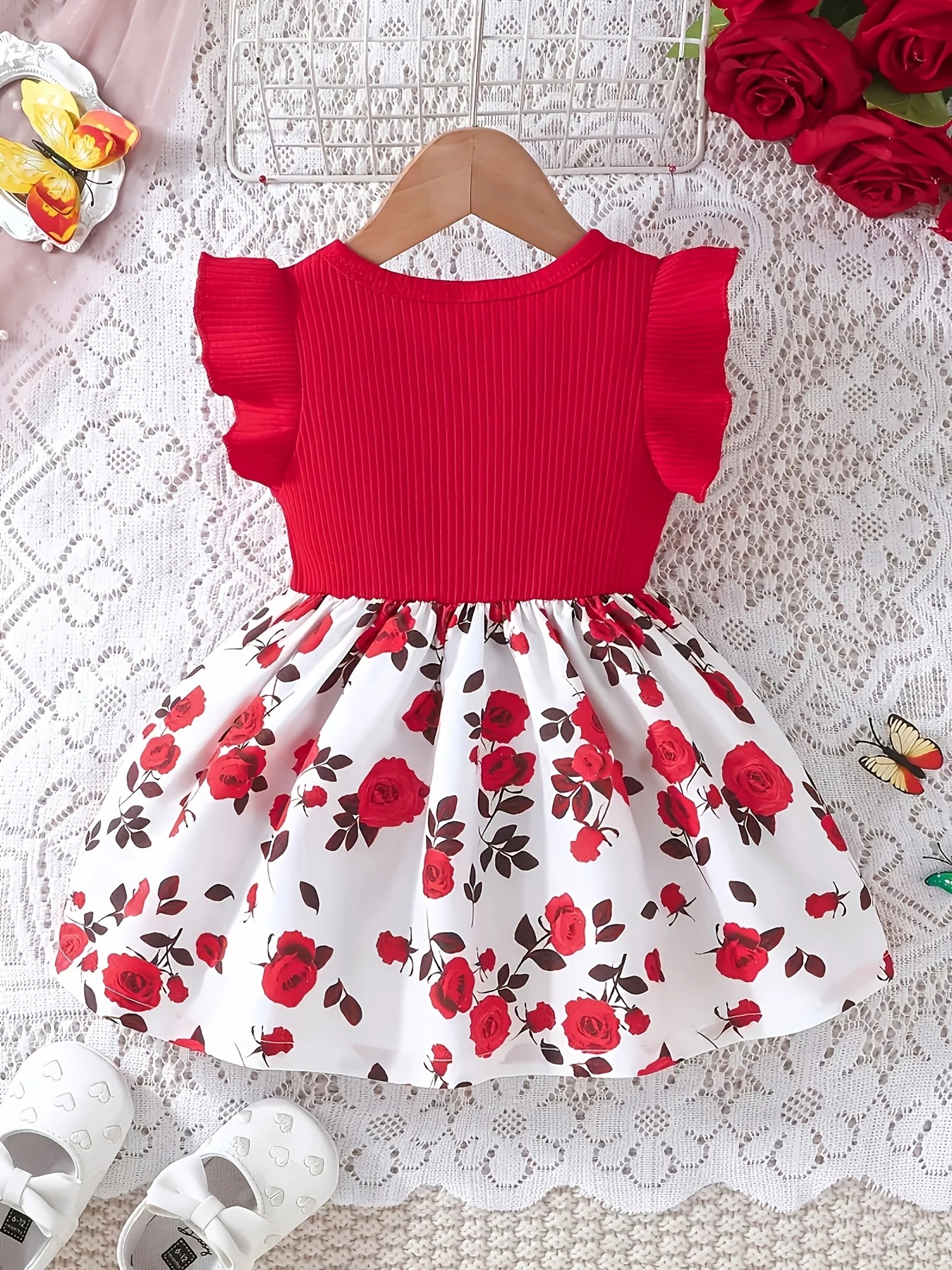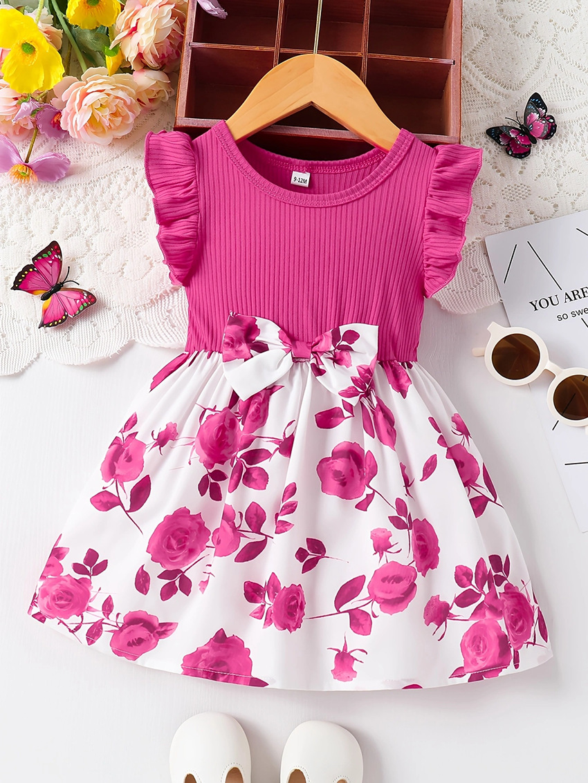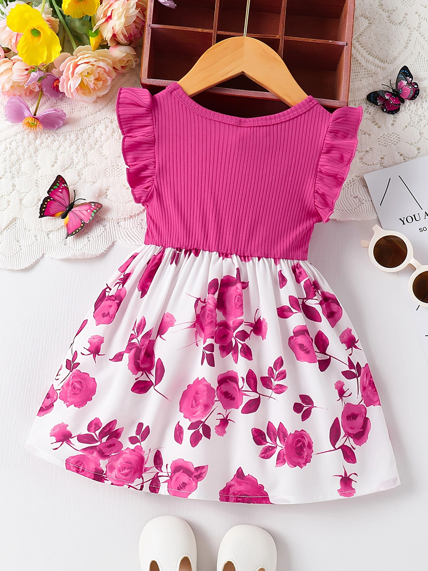 국경 INS 아기 소녀 아기 여름 비행 소매 활 바느질 장미 인쇄 원피스 트렌디