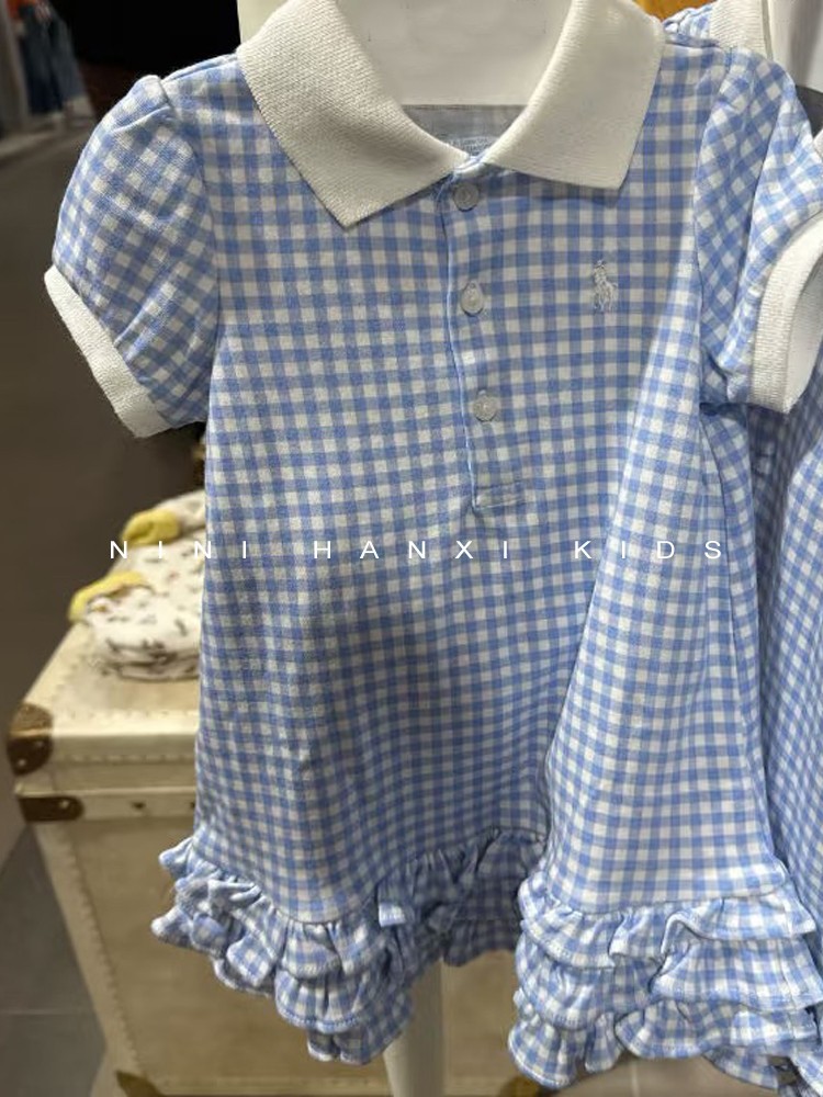 스위트 스몰 사이즈 아동복 여아 블루 체크 레이스 공주 드레스 신상 여름 여아 패셔너블한 독특한 폴로 칼라 원피스스토어 가기