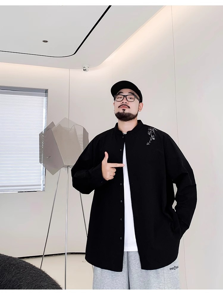 Guofeng 수 놓은 긴팔 셔츠 남성 봄과 가을 패션 브랜드 캐주얼 올 매치 느슨한 수직 칼라 지방 플러스 사이즈 셔츠스토어 가기