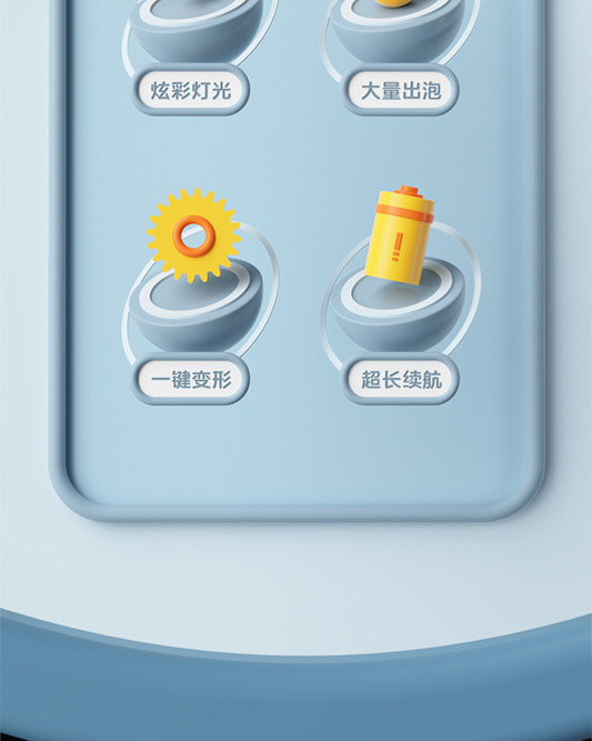 • 변형된 이중 기능 버블 머신(파란색)에는 배터리 4개가 함께 제공됩니다.