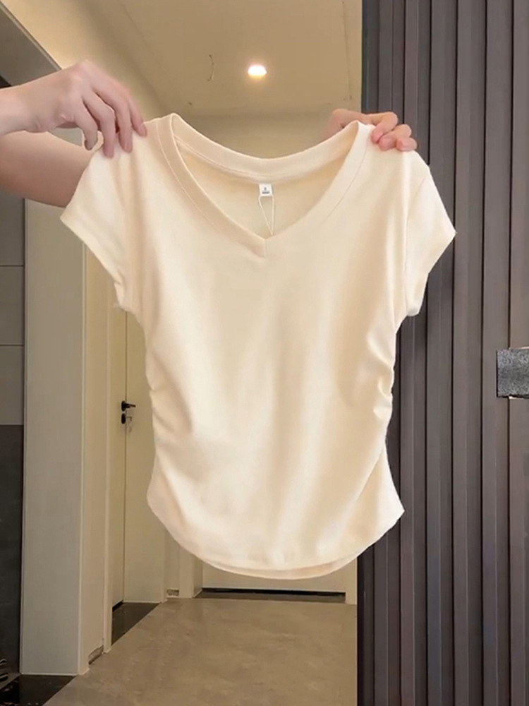 원피스 핫한 소녀 짧은 반팔 티셔츠 여성용 카드 허리 핀치 플리츠 바닥 디자인 이너 탑