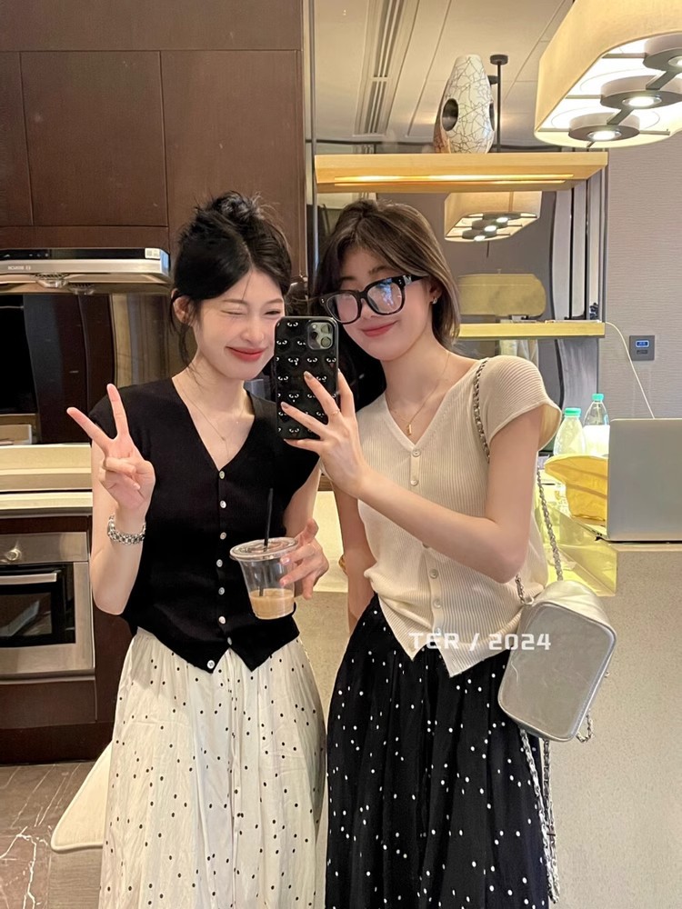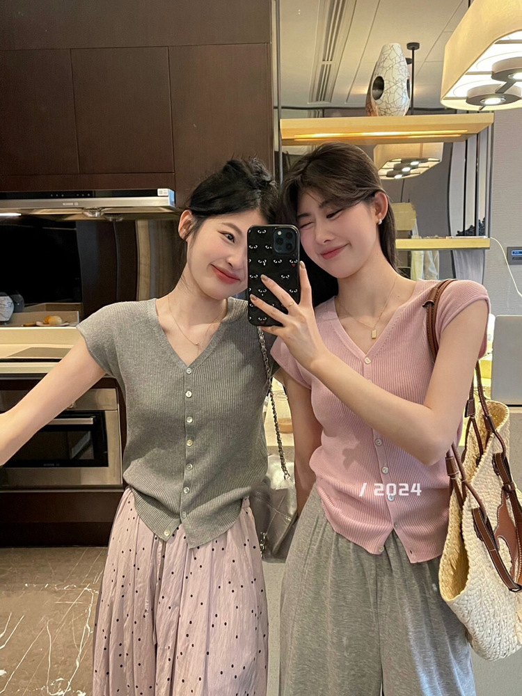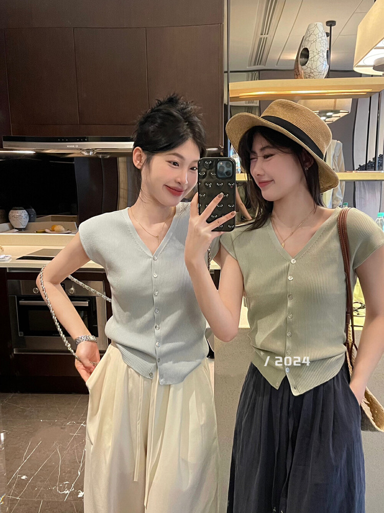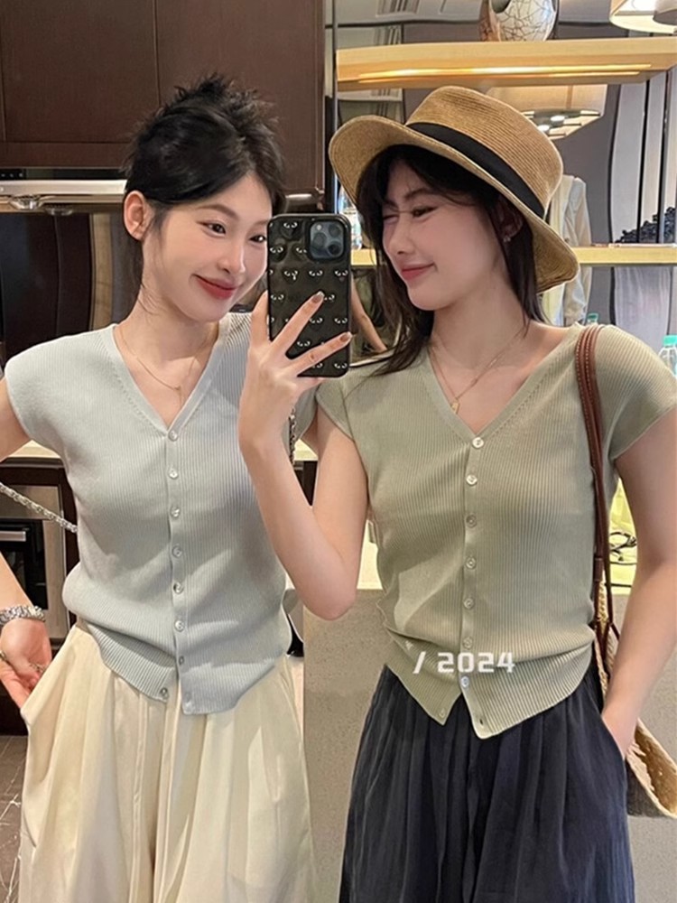 한국 스타일 작은 비행 소매 V-목 아이스 실크 니트 카디건 여성 여름 얇은 슬림 핏 슬리밍 니트 외부 착용 반팔 옷스토어 가기