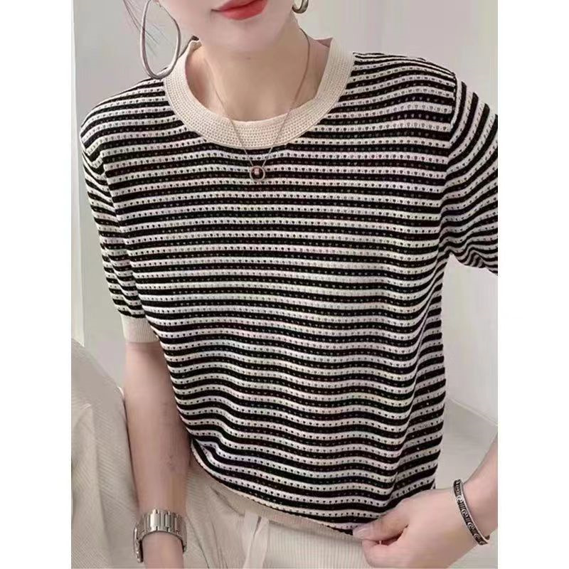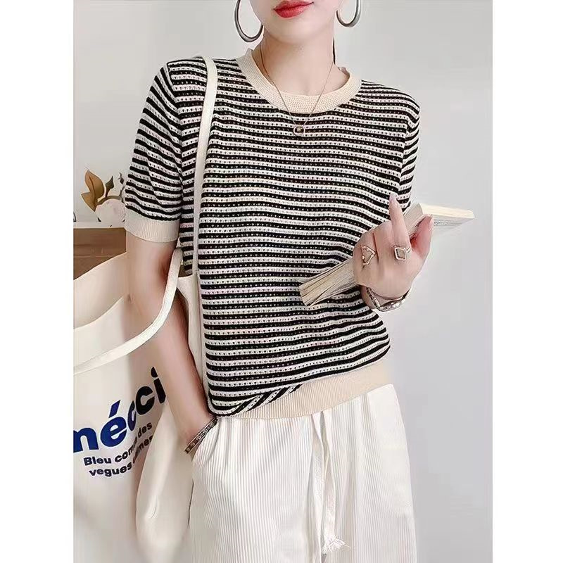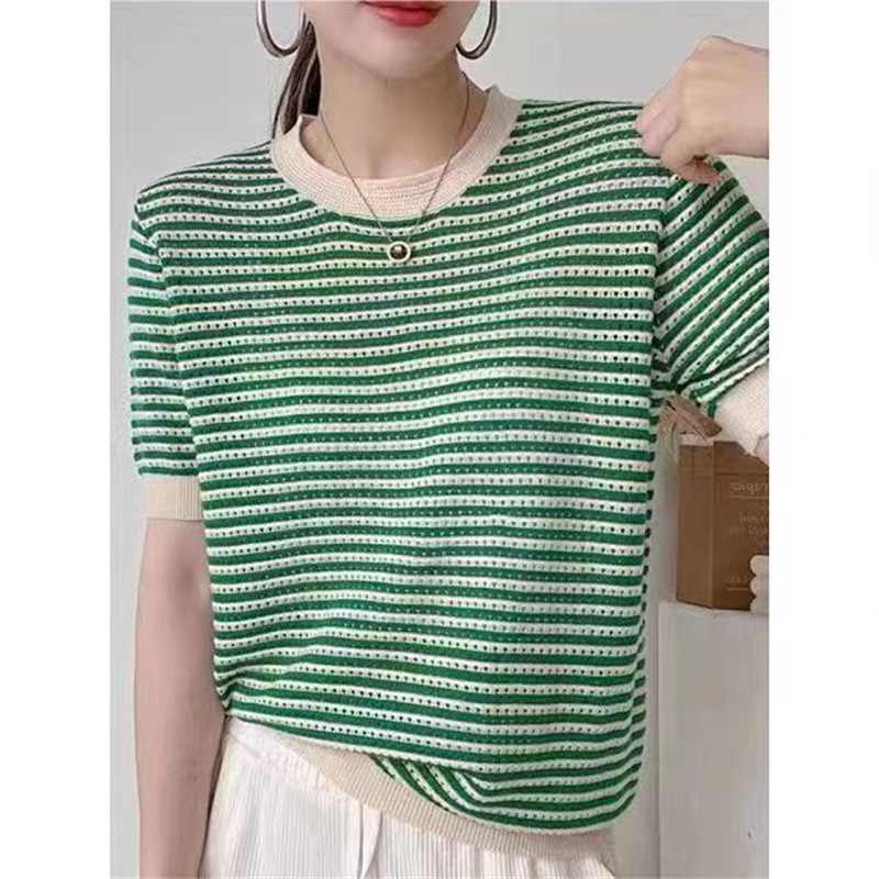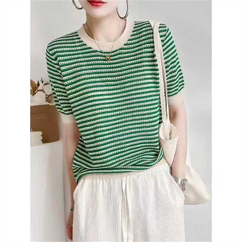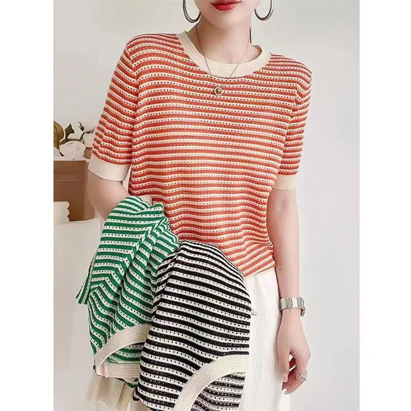 2025 봄 여름 신상 니트 스웨터, 라운드넥 풀오버, 빈티지 스트라이프 배색, 아이스 린넨 소재, 루즈핏 얇은 중간 소매 여성 상의