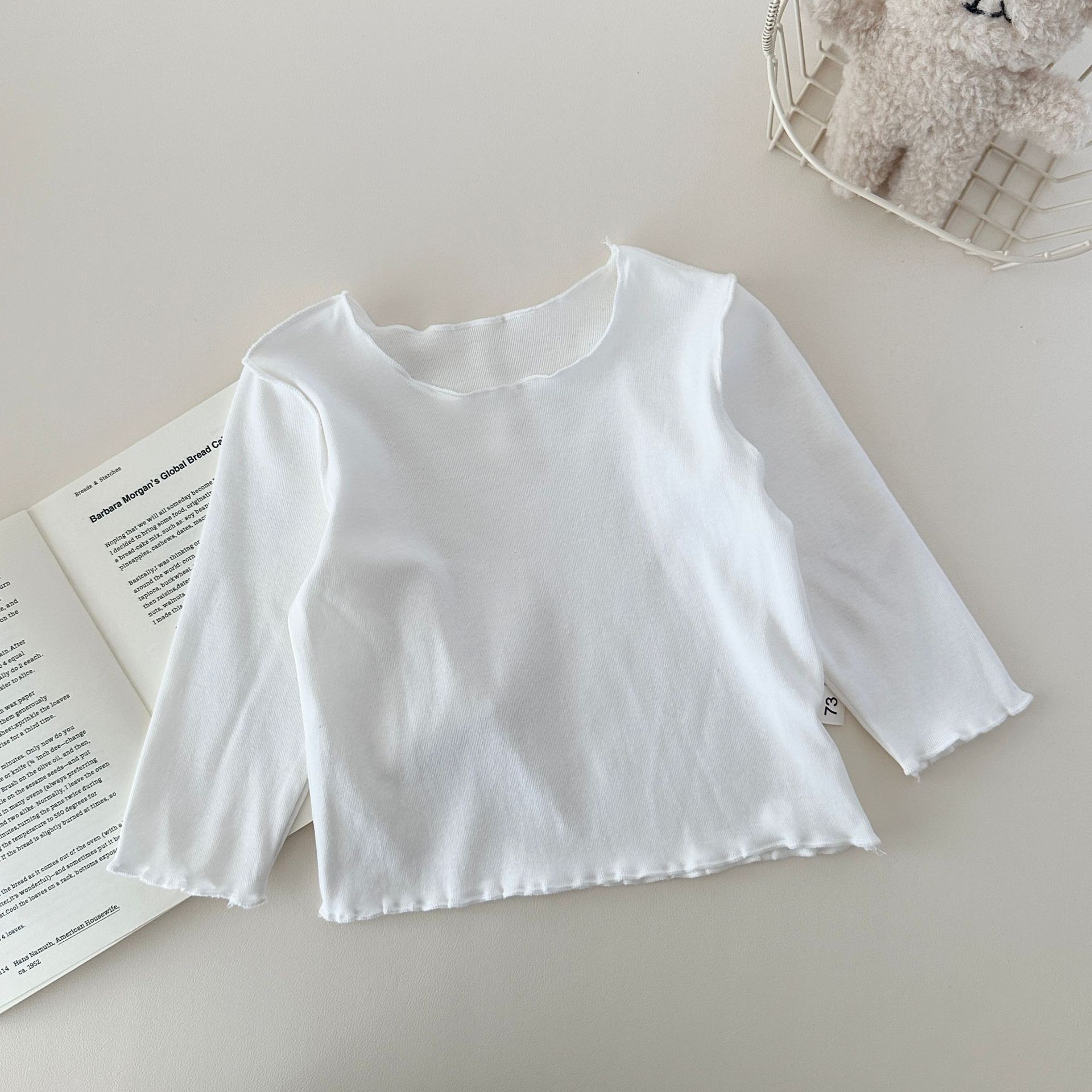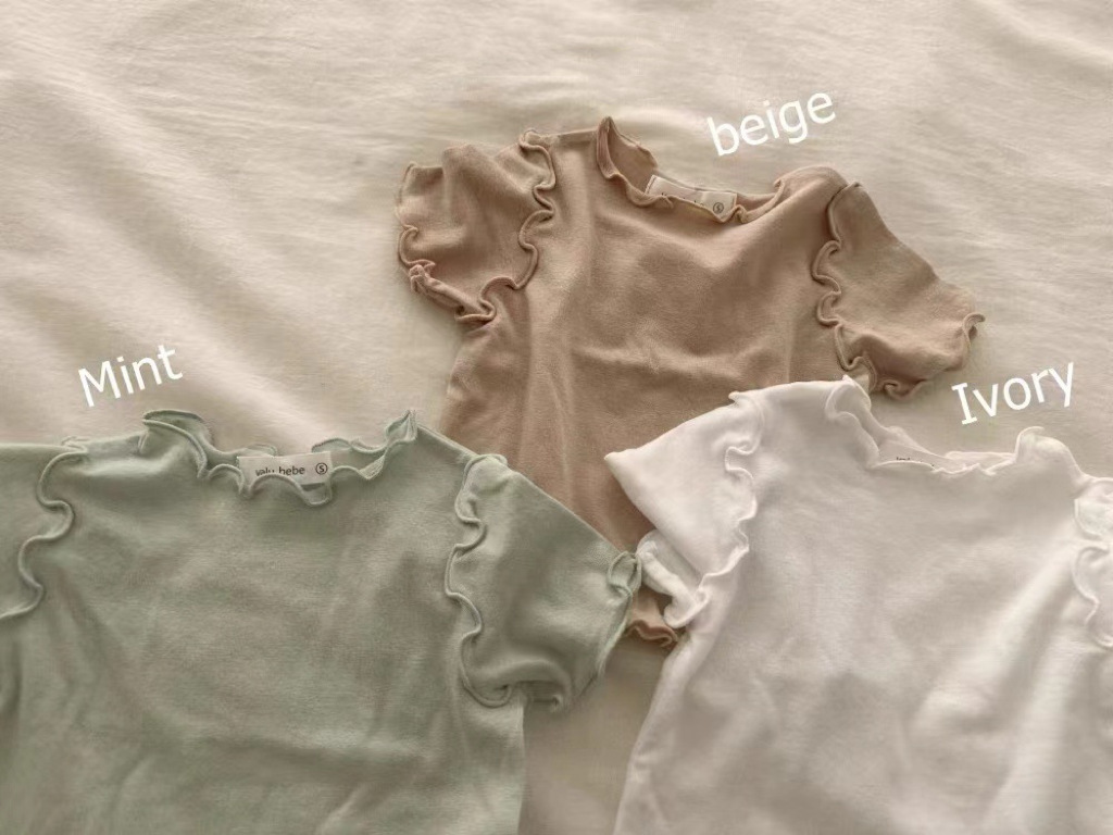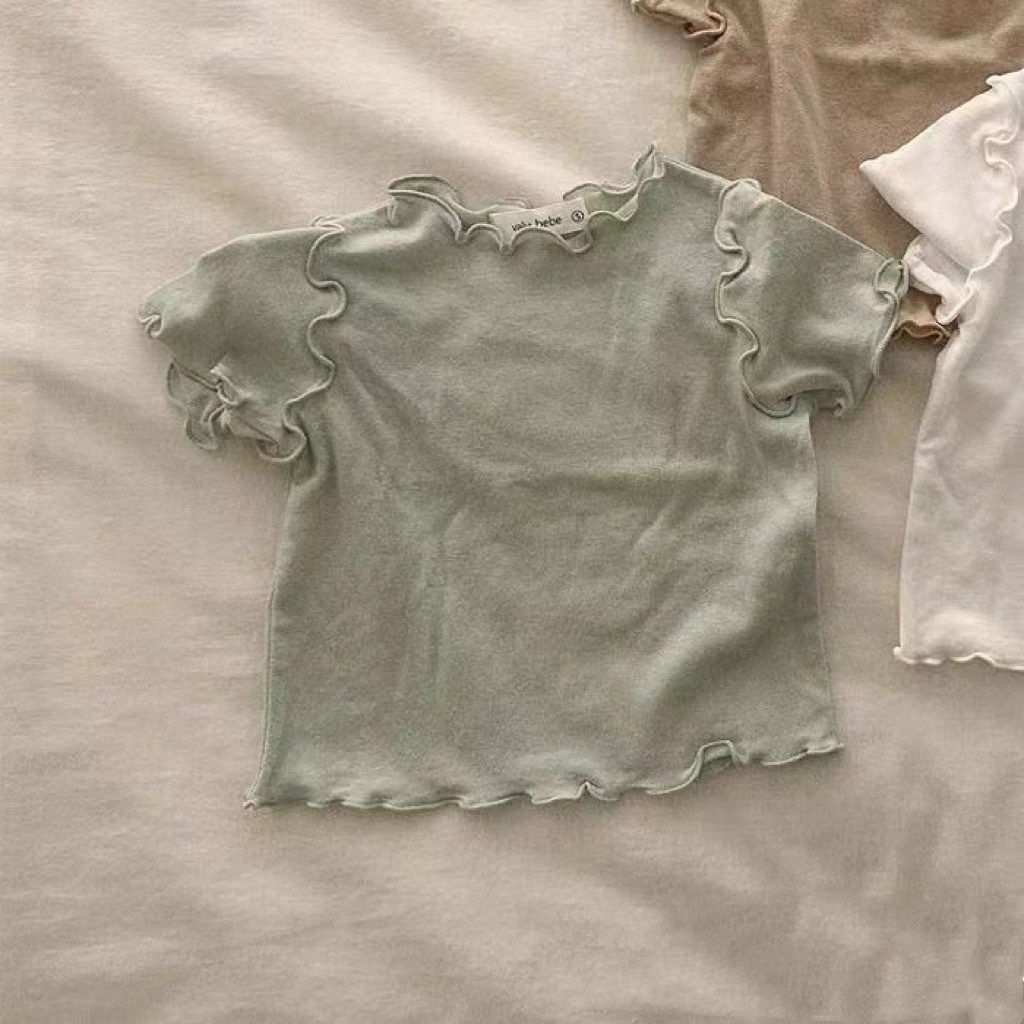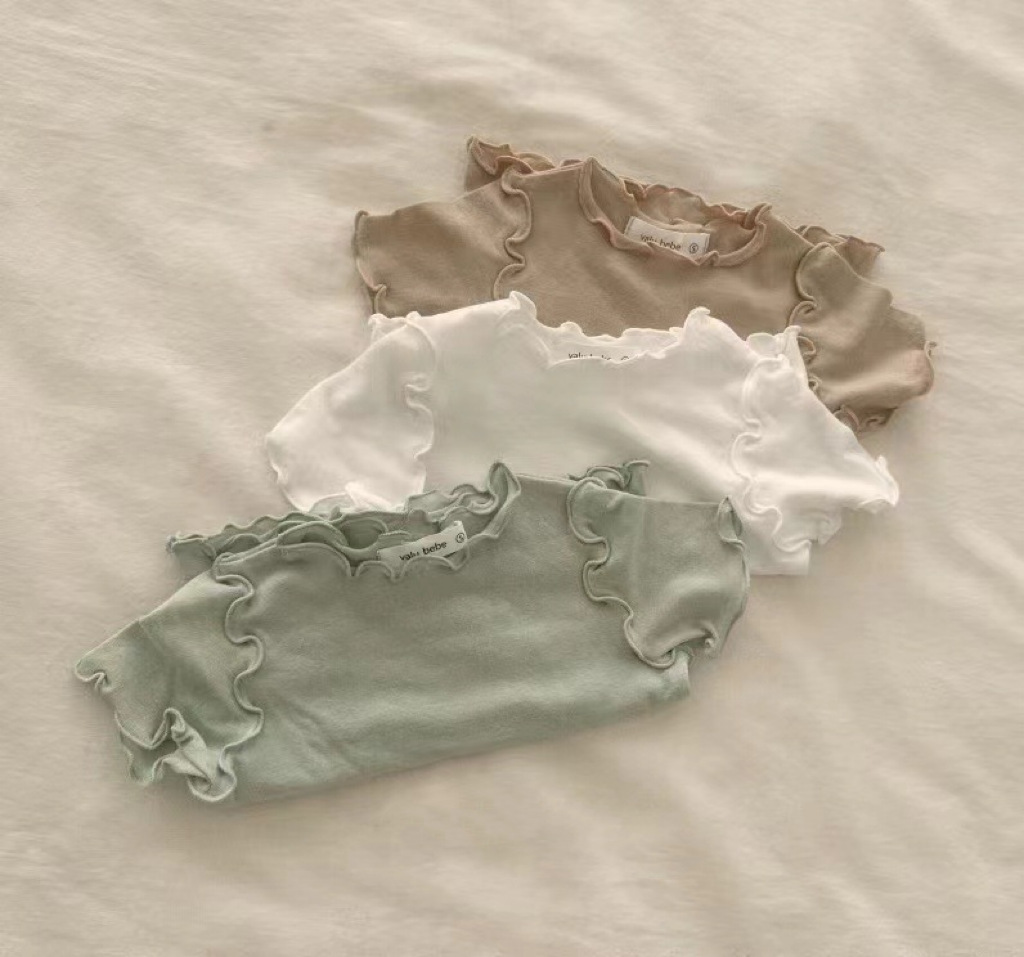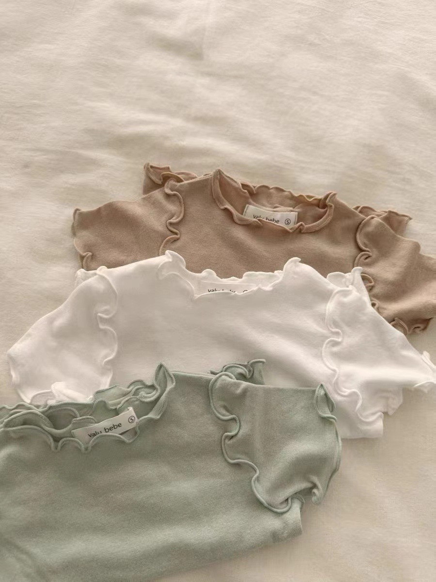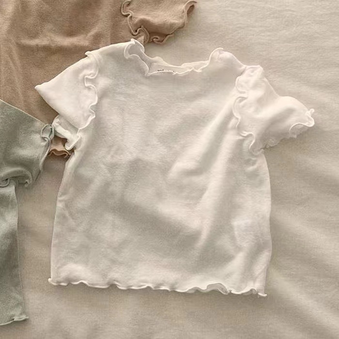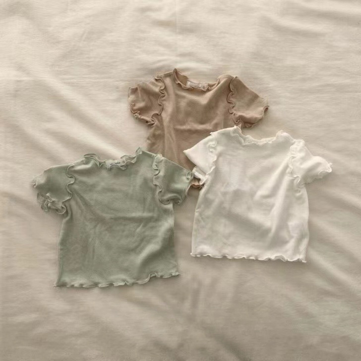 한국식 아기의 얇은 면 부드러운 반팔 티셔츠 여성 아기의 여름 귀 테두리 올 매치베이스 셔츠 솔리드 컬러 탑