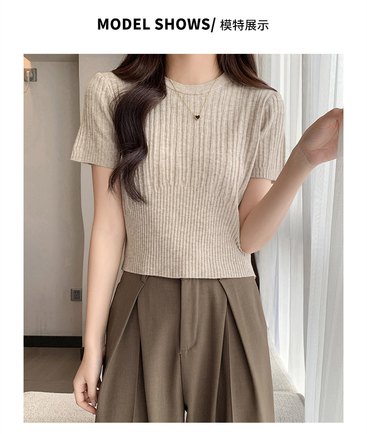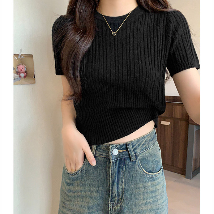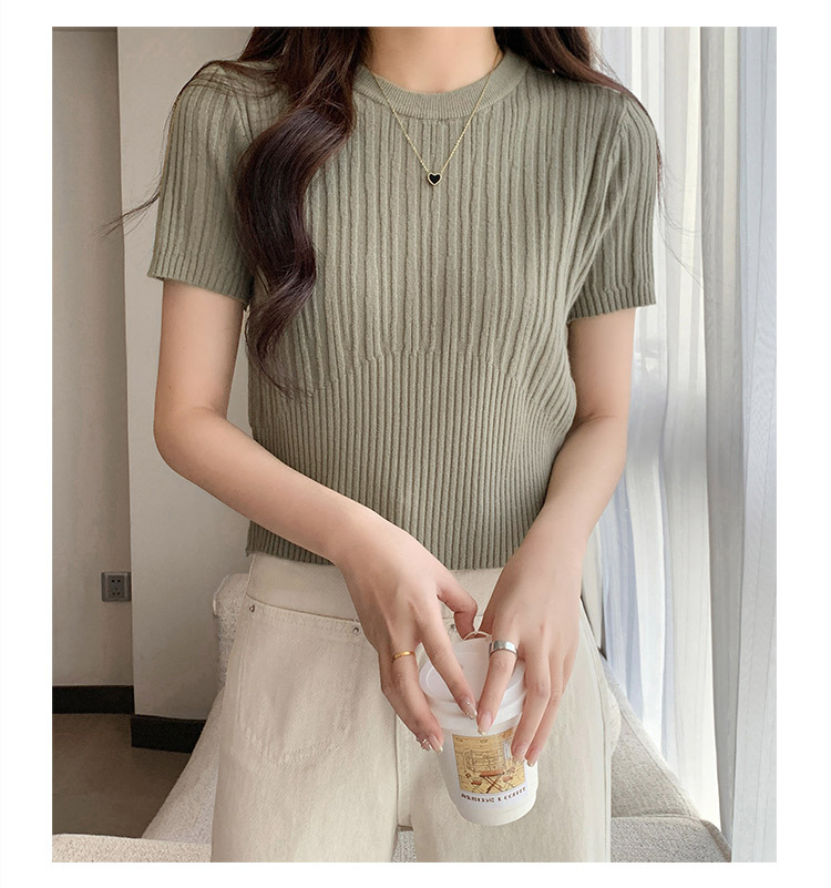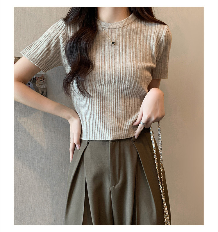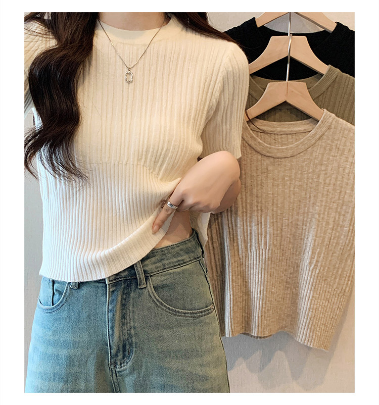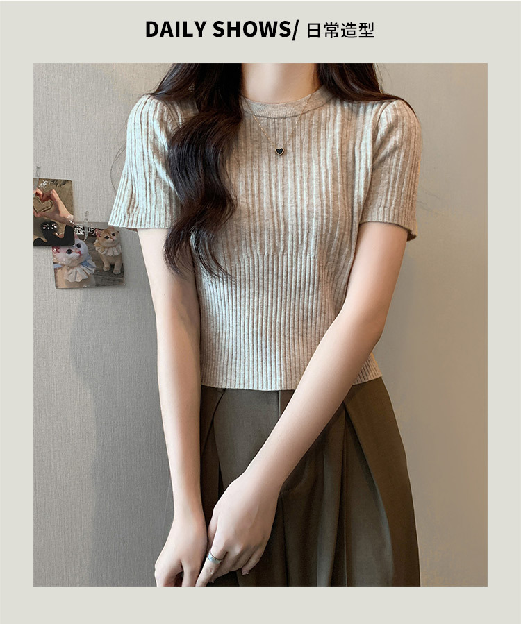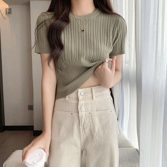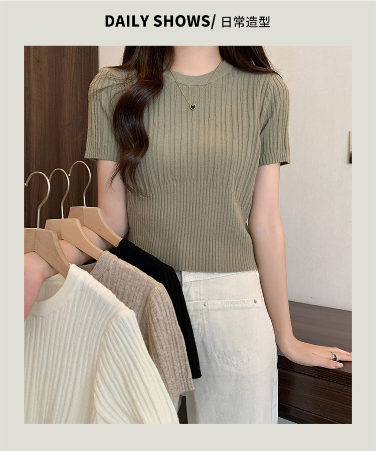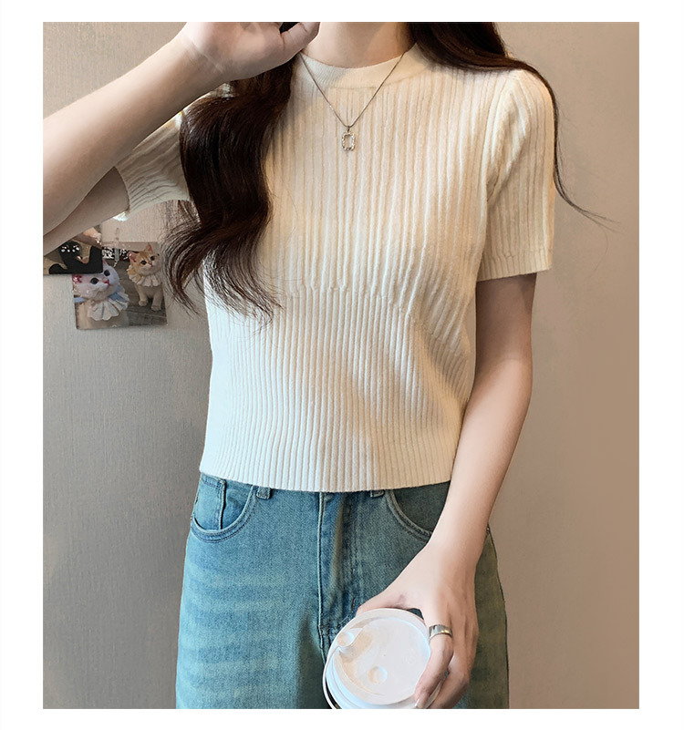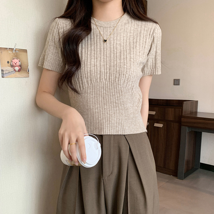 살구색 어깨 반팔 스웨터 티셔츠 여성용 봄과 여름 새로운 라운드 넥 슬림 핏 스파이스 걸 짧은 이너 탑