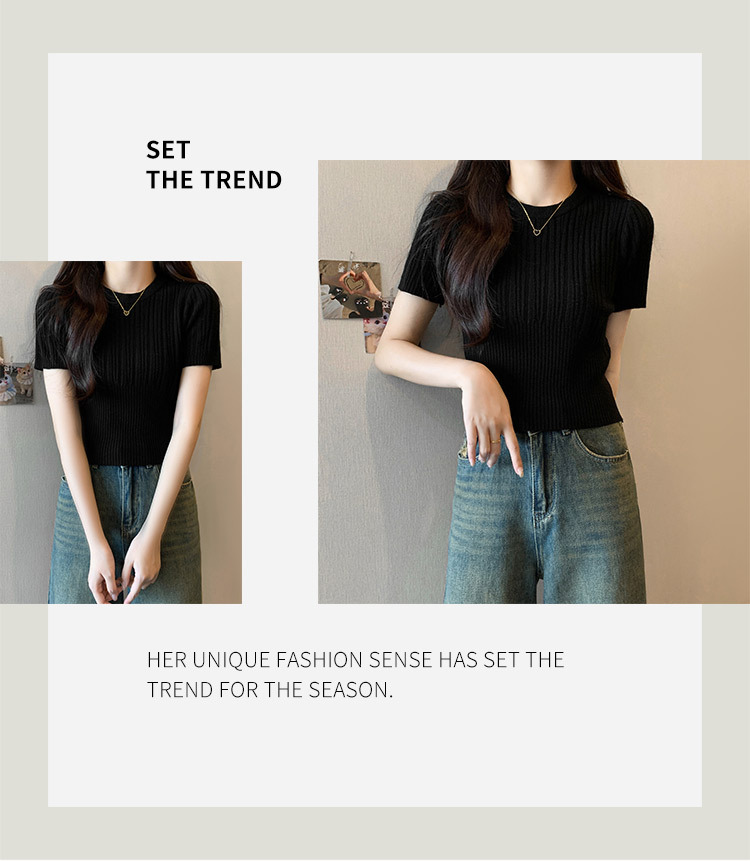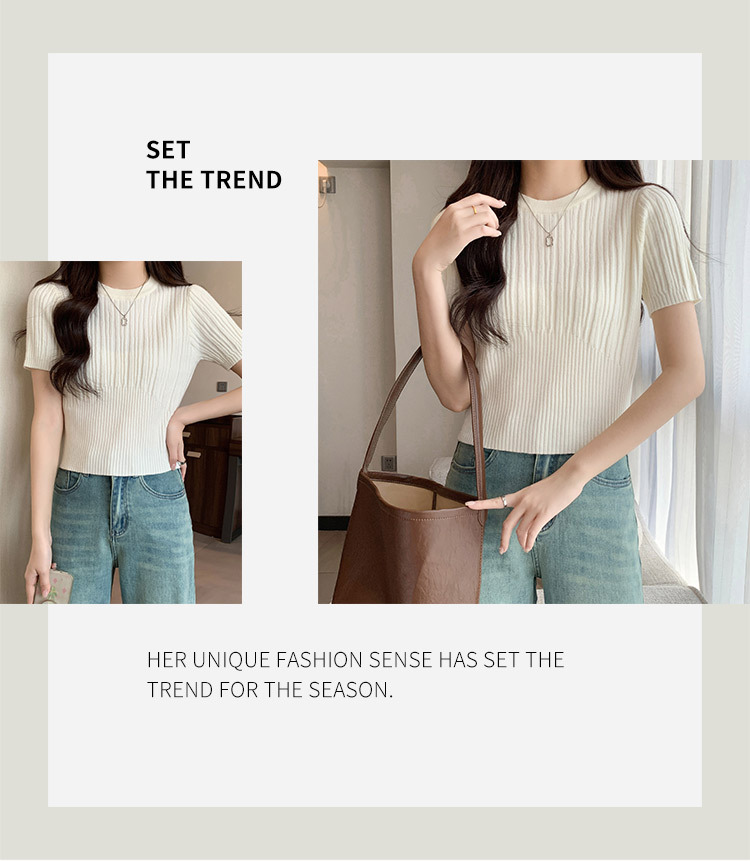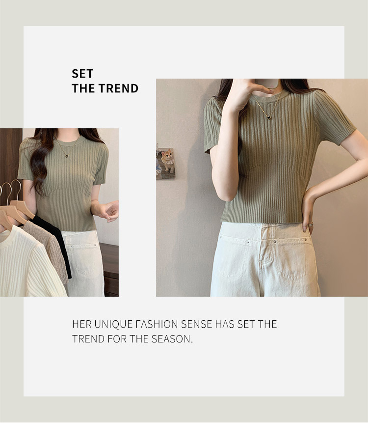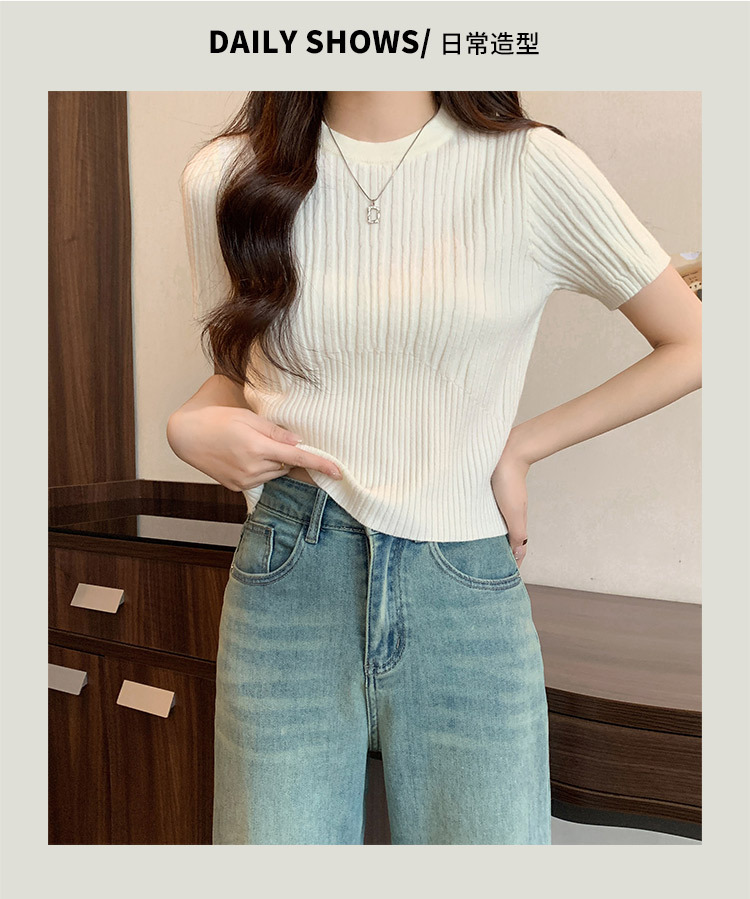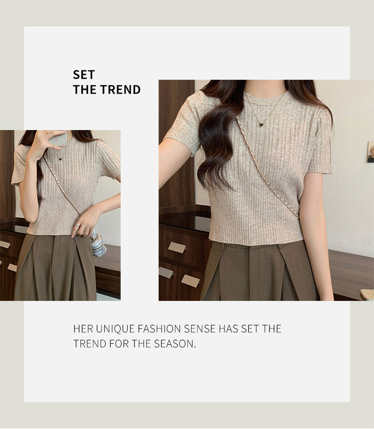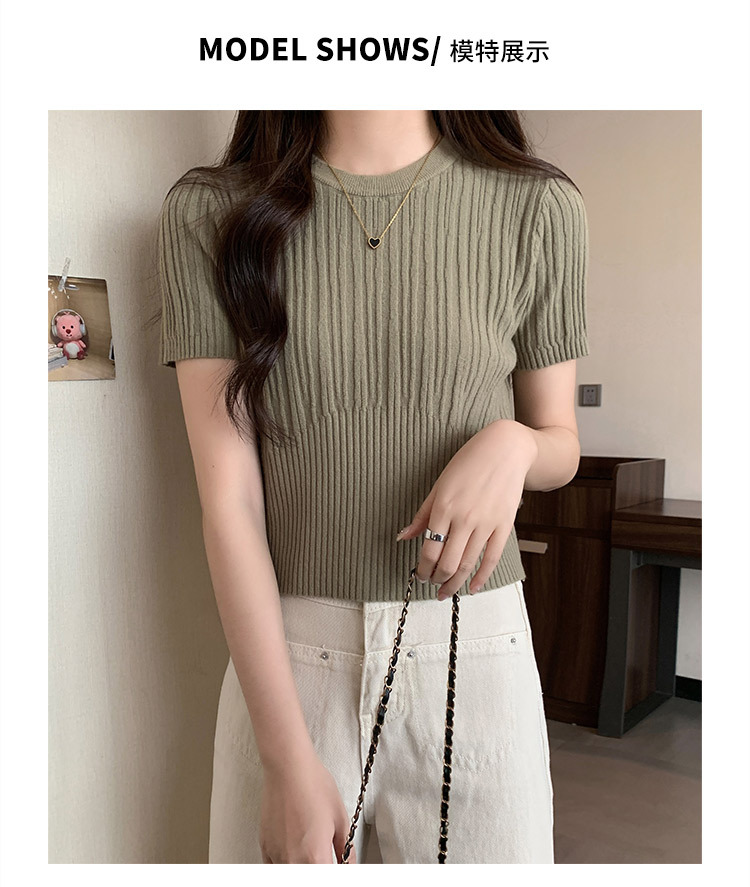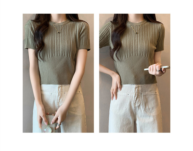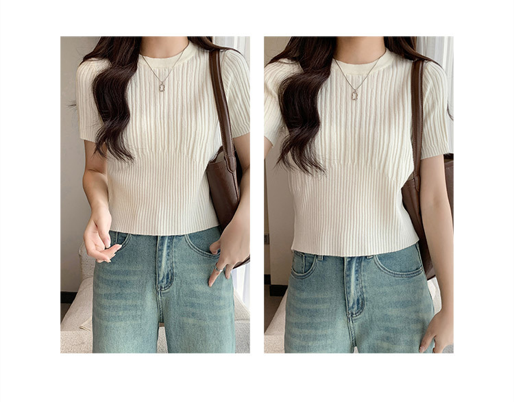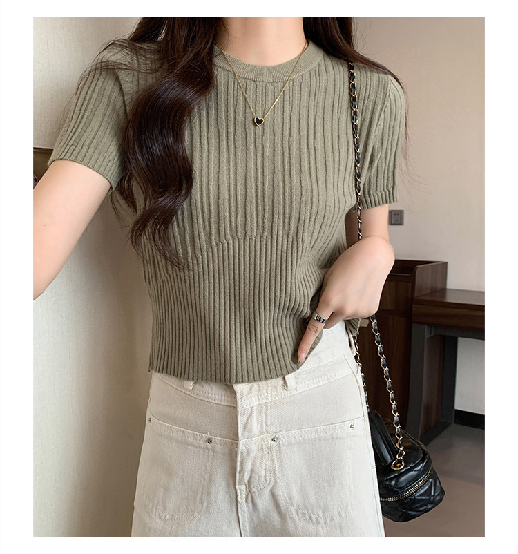 살구색 어깨 반팔 스웨터 티셔츠 여성용 봄과 여름 새로운 라운드 넥 슬림 핏 스파이스 걸 짧은 이너 탑