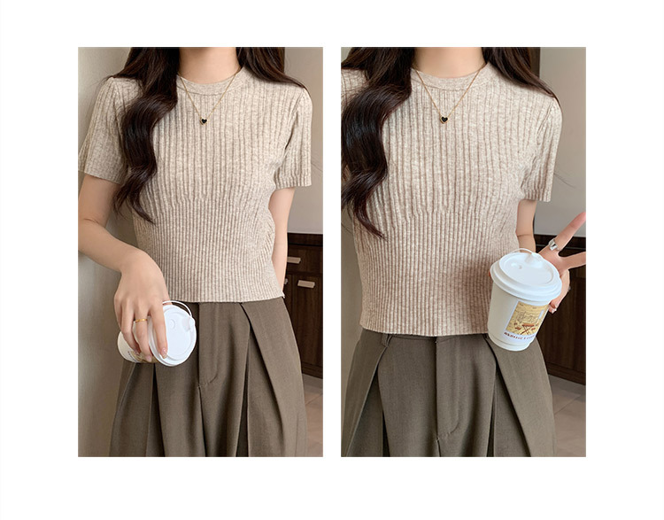 杏色正肩短袖针织衫t恤女春夏新款圆领收腰修身辣妹短款内搭上衣