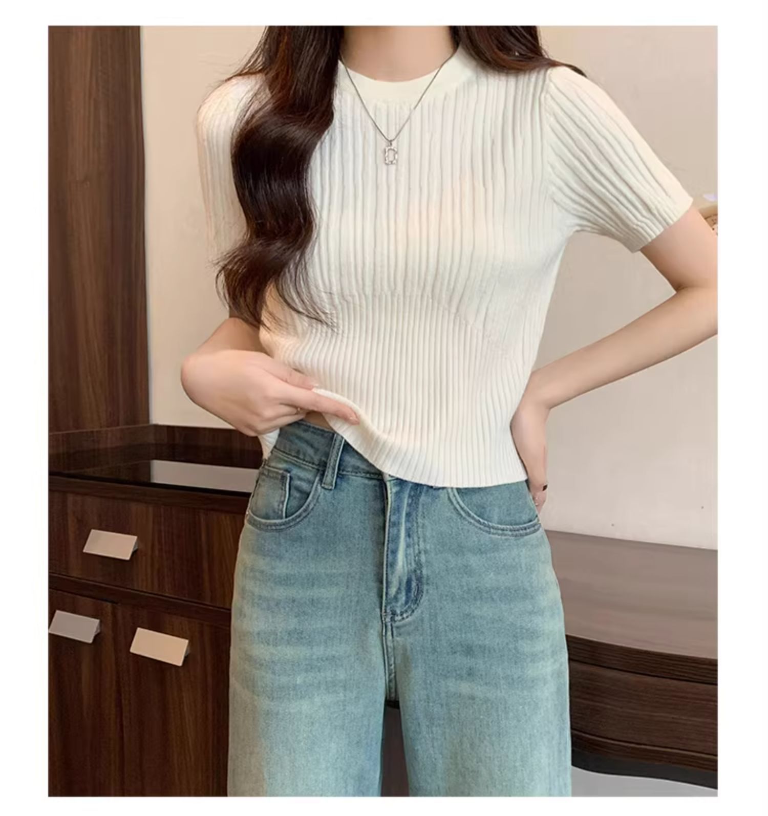 살구색 어깨 반팔 스웨터 티셔츠 여성용 봄과 여름 새로운 라운드 넥 슬림 핏 스파이스 걸 짧은 이너 탑스토어 가기