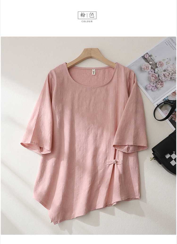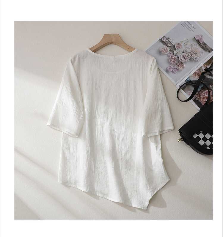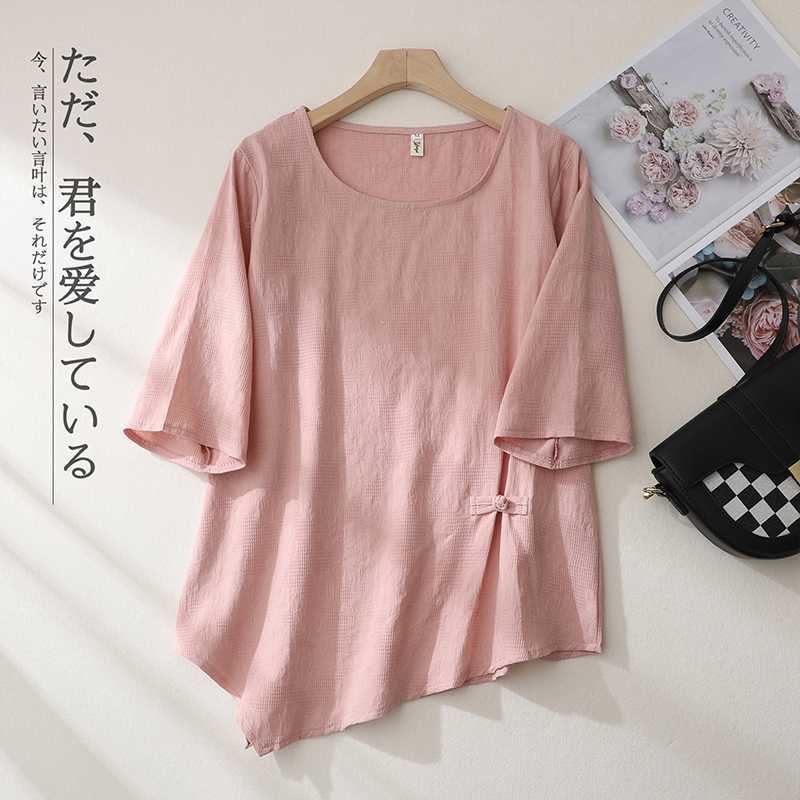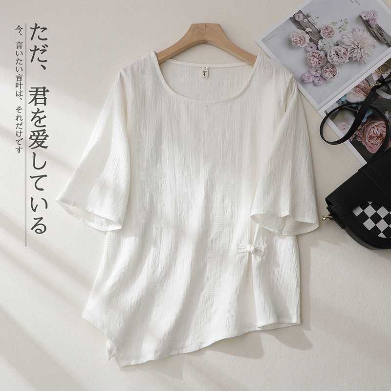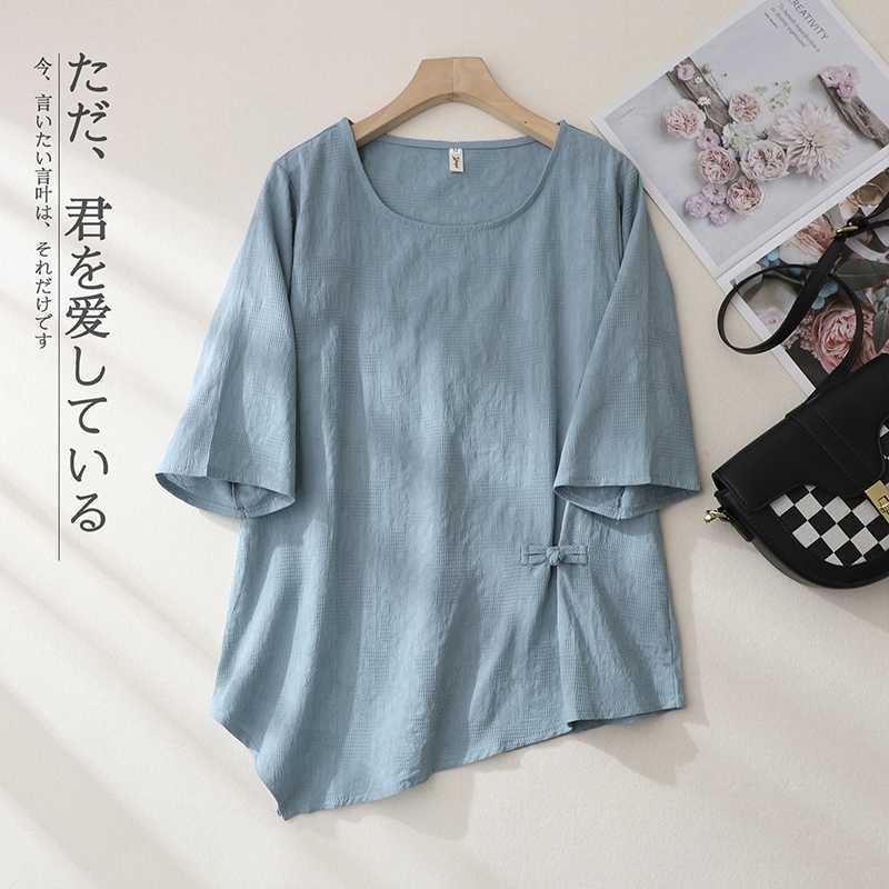 2025 새로운 예술 플러스 사이즈 코튼 리넨 버클 자카드 반팔 티셔츠 여성용 불규칙한 느슨한 슬림 탑
