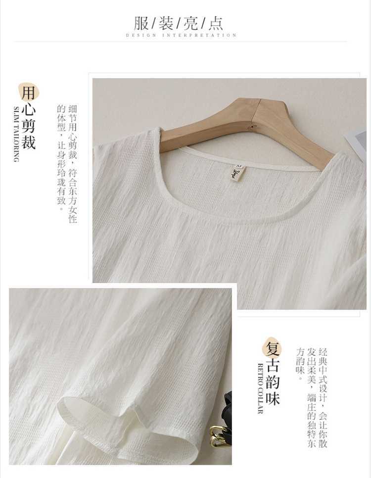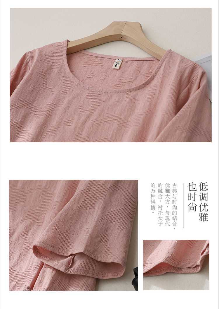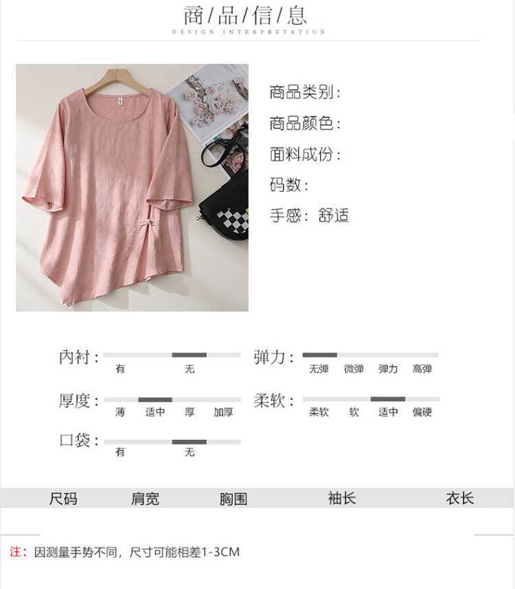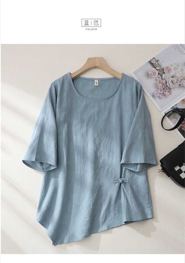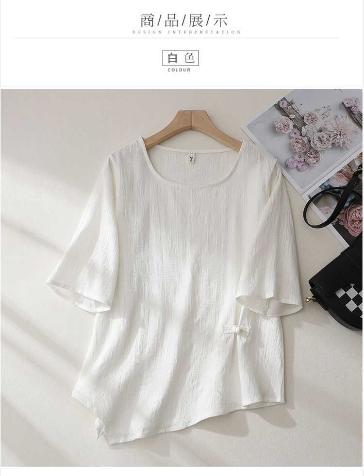 2025 새로운 예술 플러스 사이즈 코튼 리넨 버클 자카드 반팔 티셔츠 여성용 불규칙한 느슨한 슬림 탑