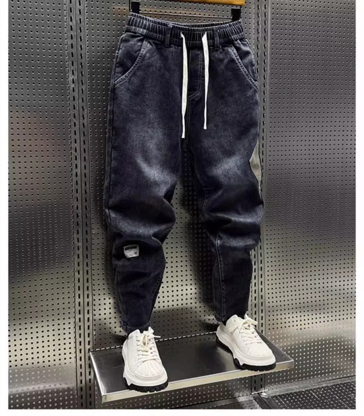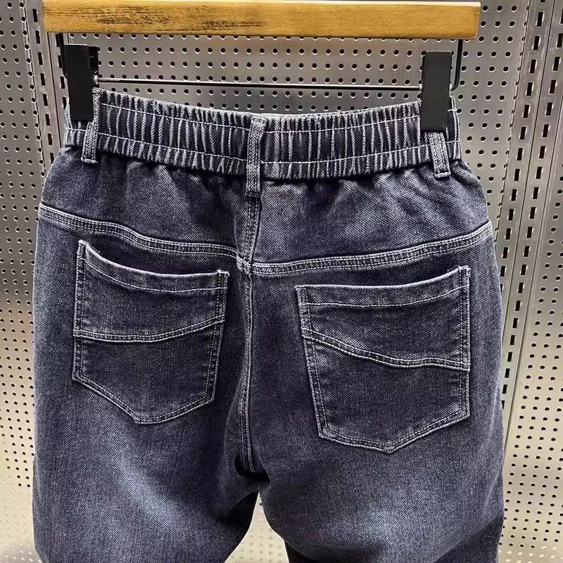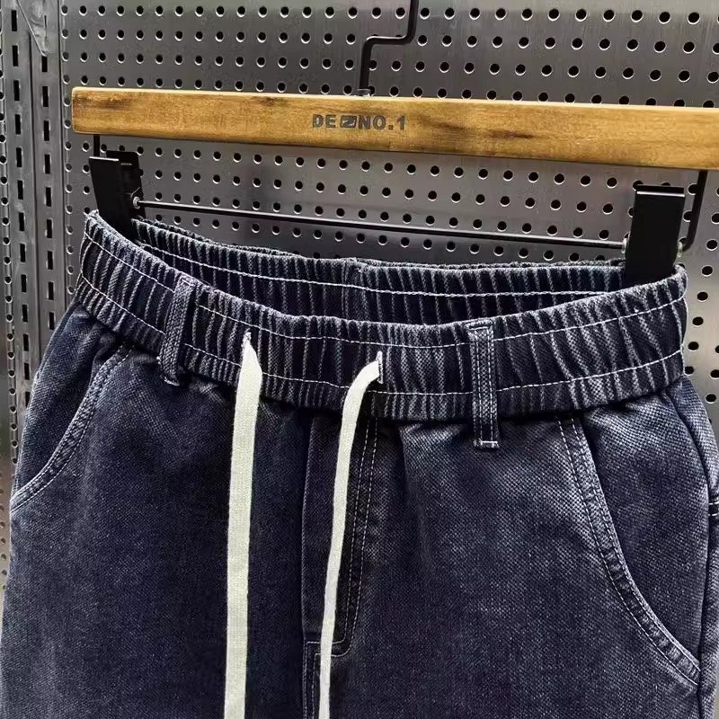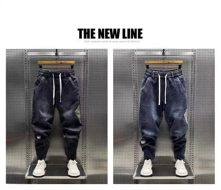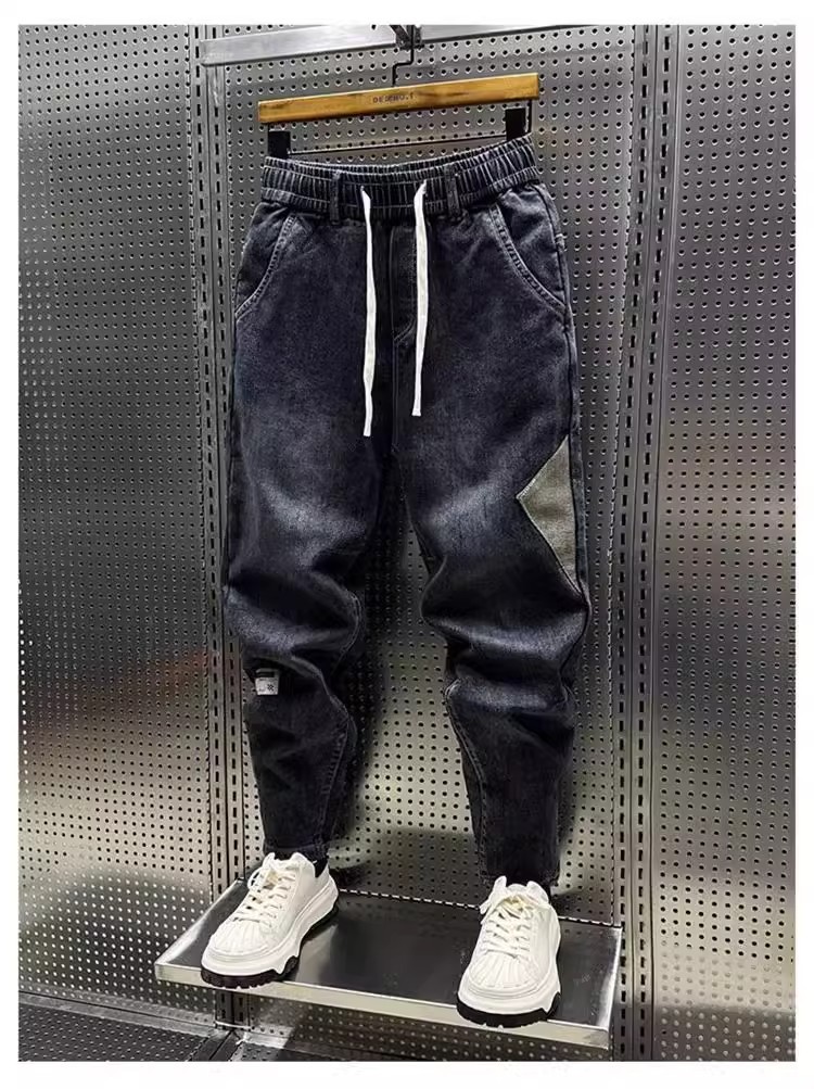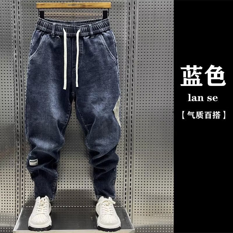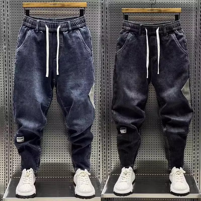 청바지 남성 트렌디 브랜드 탄성 허리 끈 스티칭 빈티지 구식 오버 사이즈 스트레치 슬리밍 하렘 바지스토어 가기