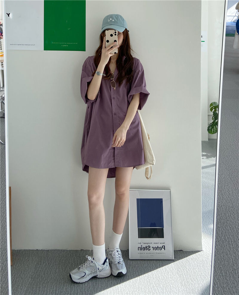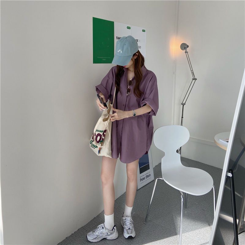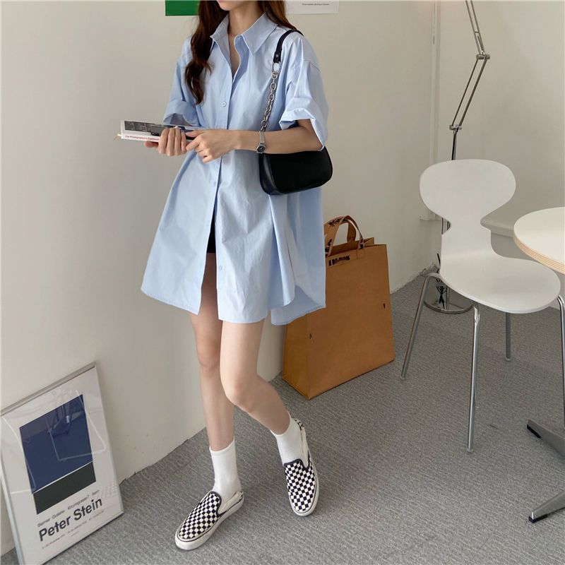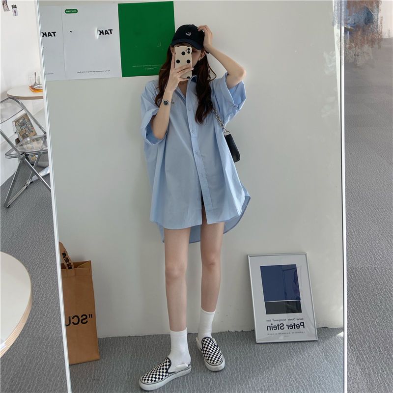 반소매 블루 셔츠 여성용 셔츠 코트 한국식 루즈 미드 길이 BF 스타일 탑 트렌디 셔츠 원피스
