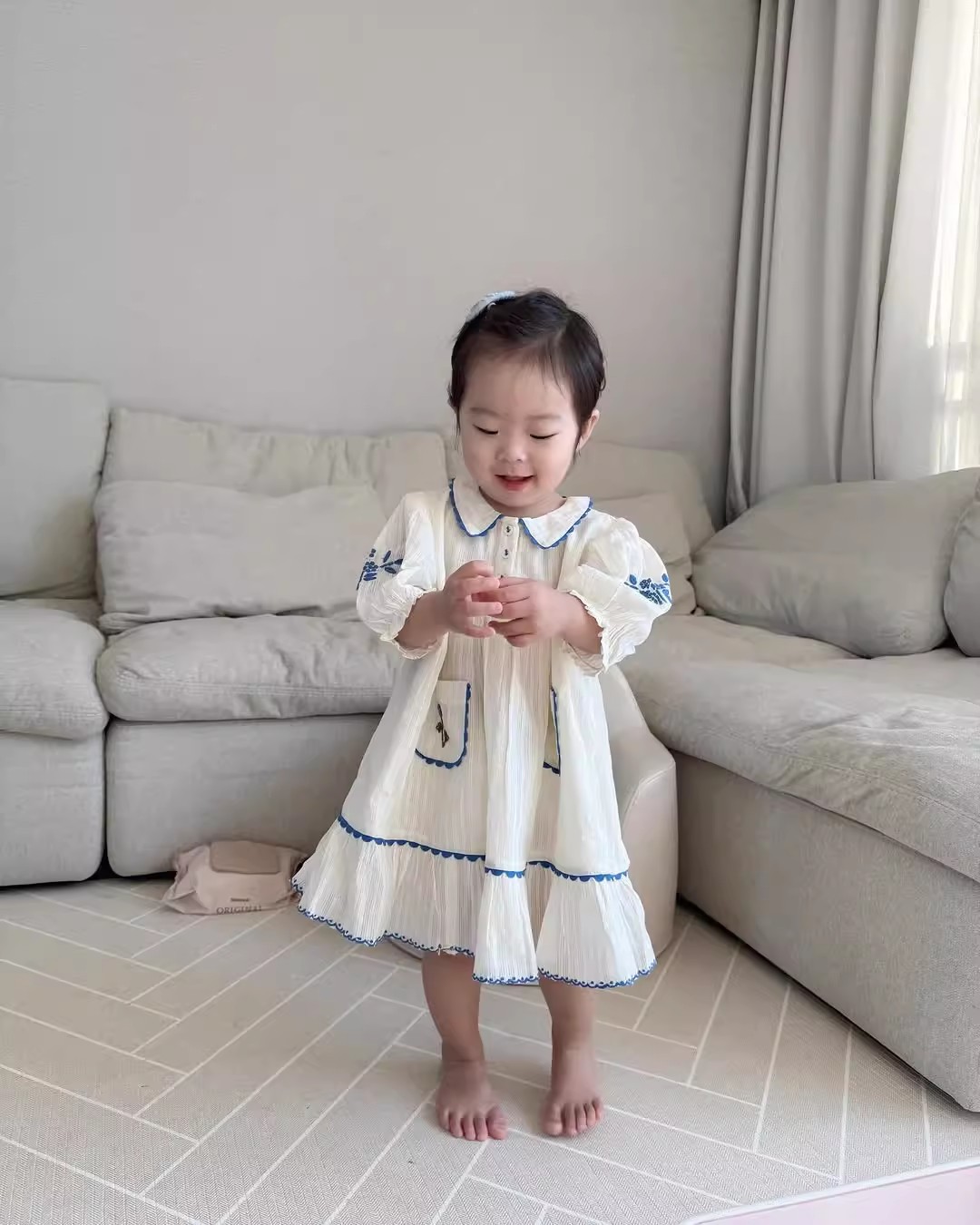 • 파란색과 흰색 줄무늬 자수 드레스 [재고 있음]