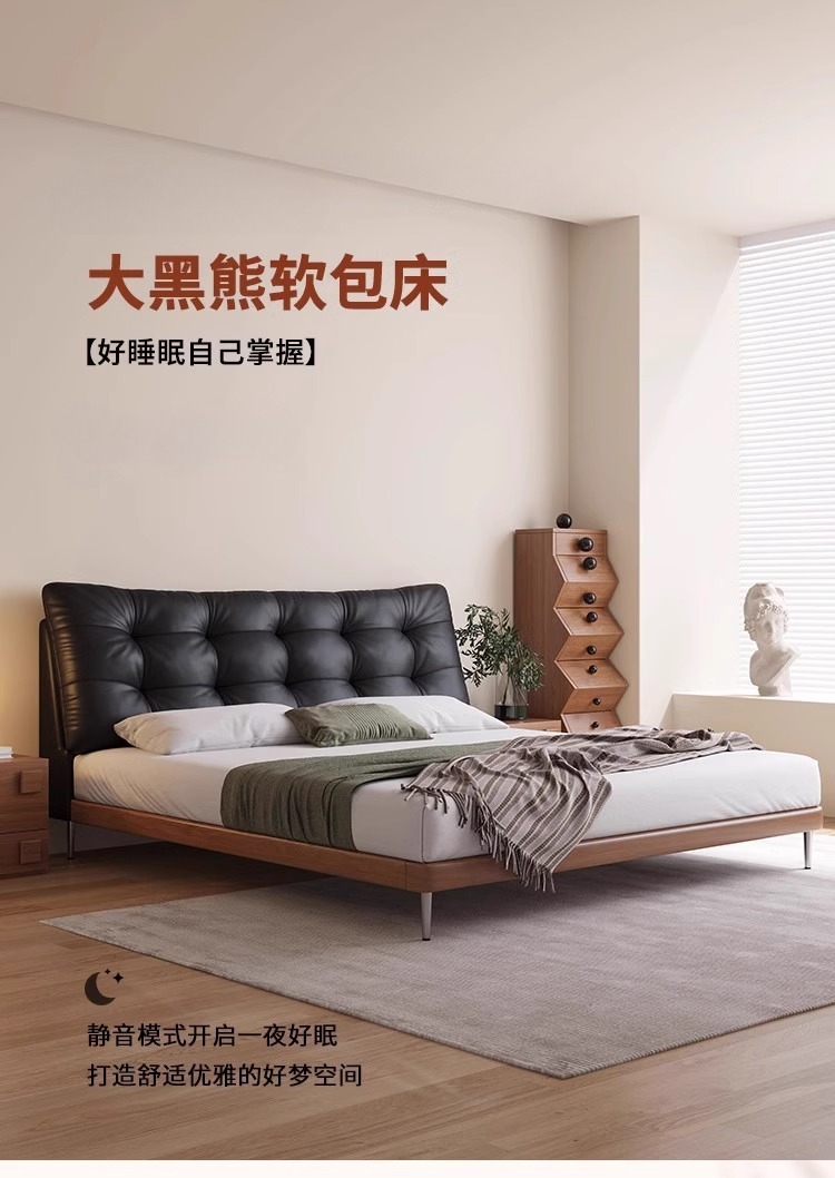 큰 검은 곰 중간 고대 이탈리아 스타일 미니멀리스트 머리 층 소 가죽 크림 스타일 더블 마스터 침실 진짜 가죽 침대 단단한 나무스토어 가기