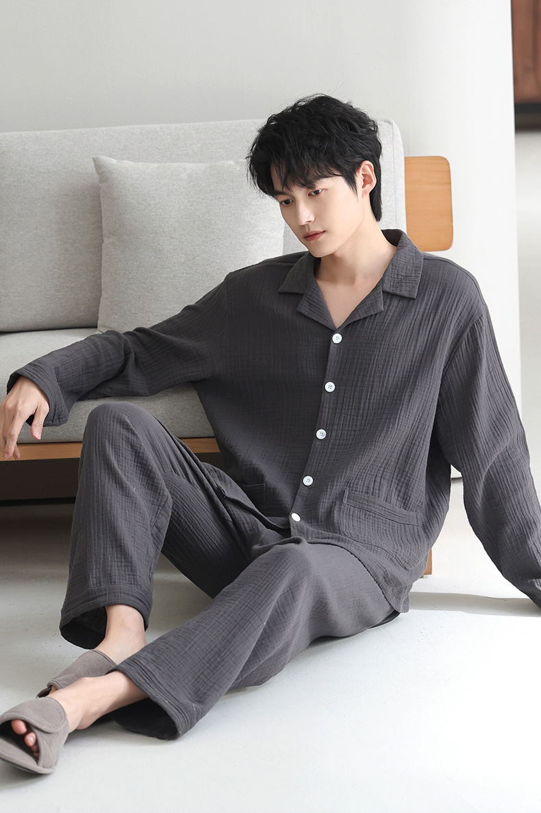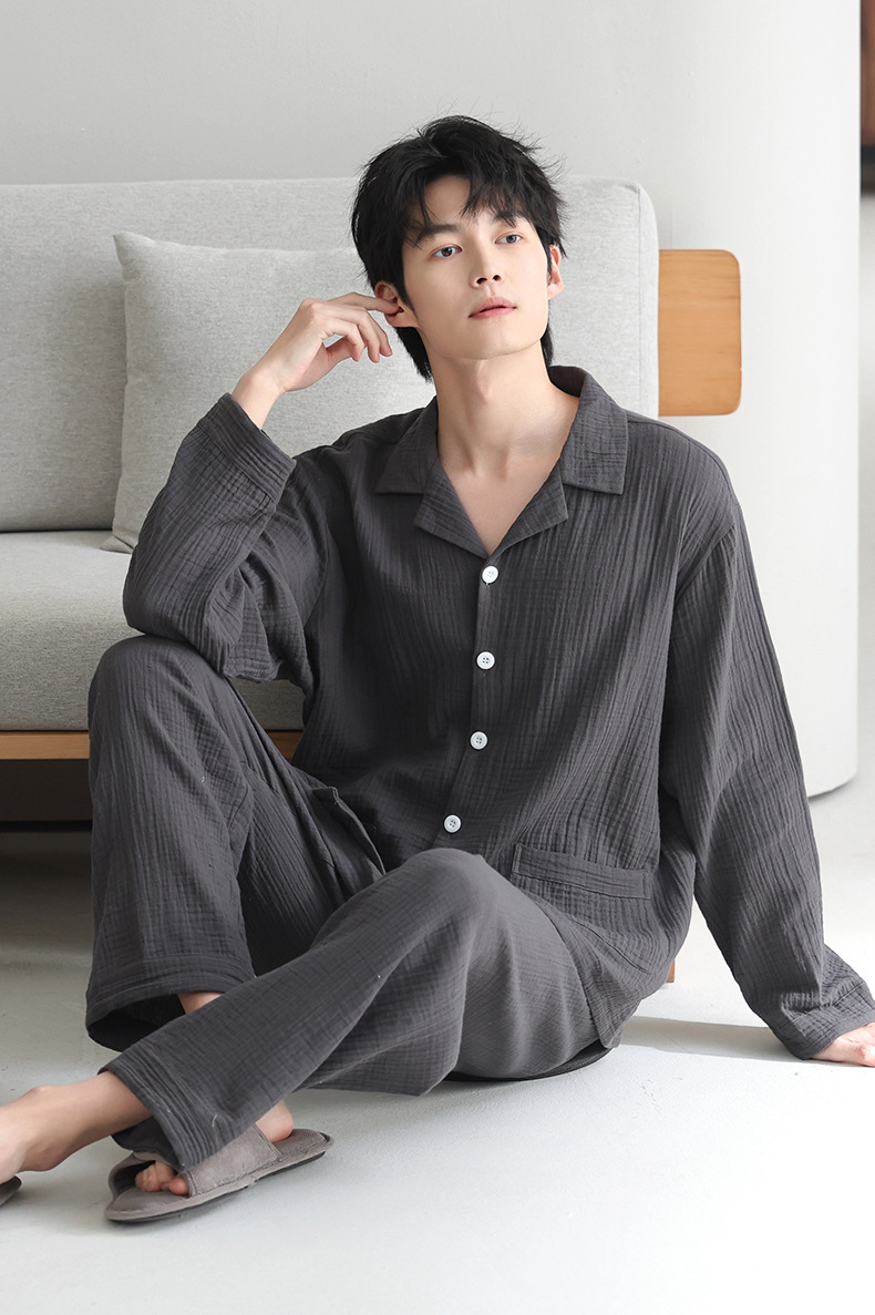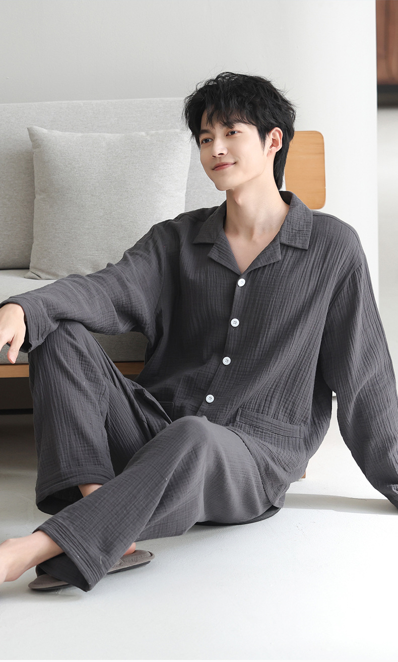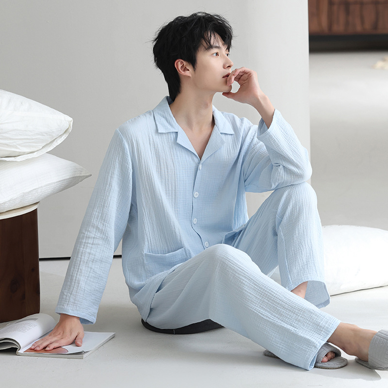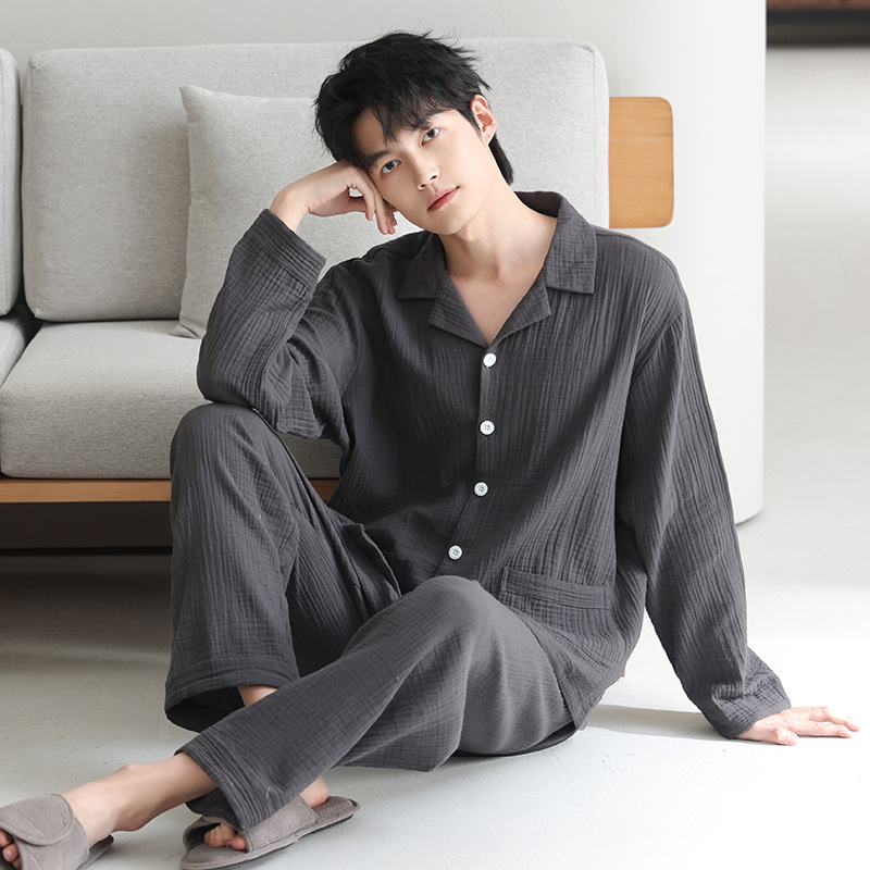 잠옷 남자의 봄과 가을 짠 코튼 거즈 캐주얼 긴 소매 아웃웨어 코튼 옷깃 홈 의류 세트