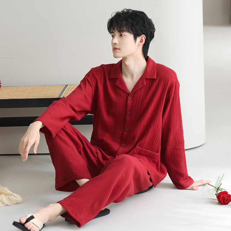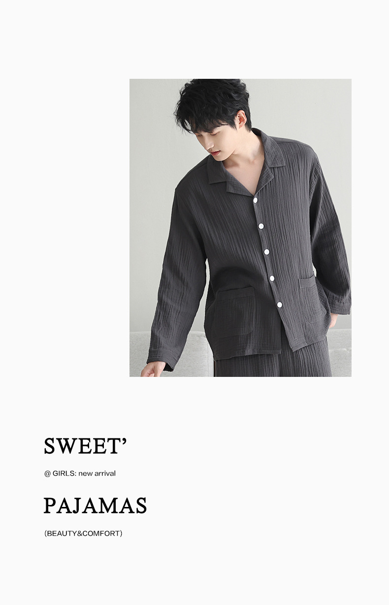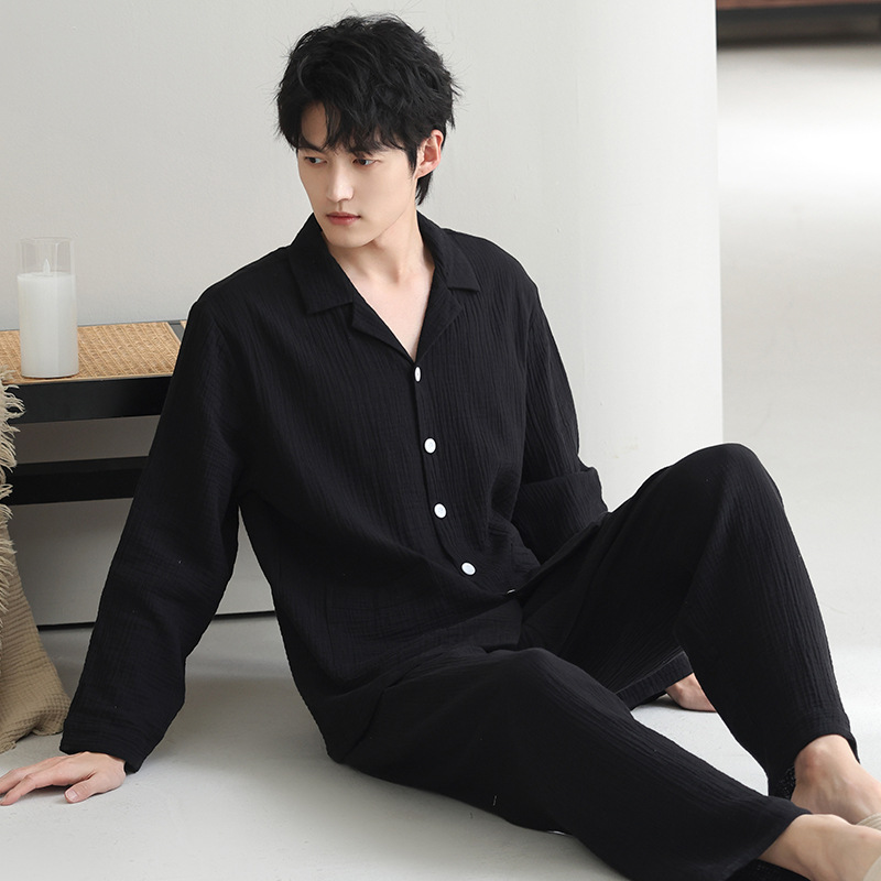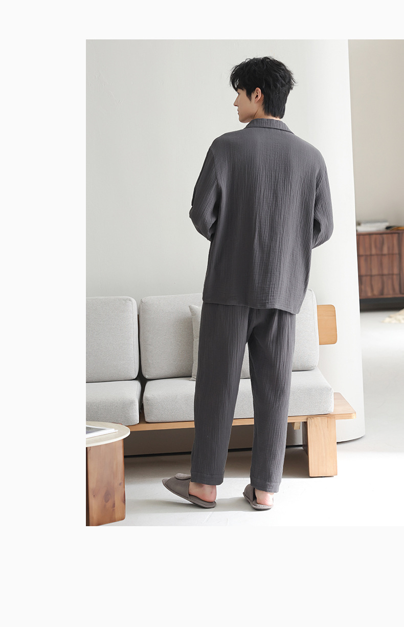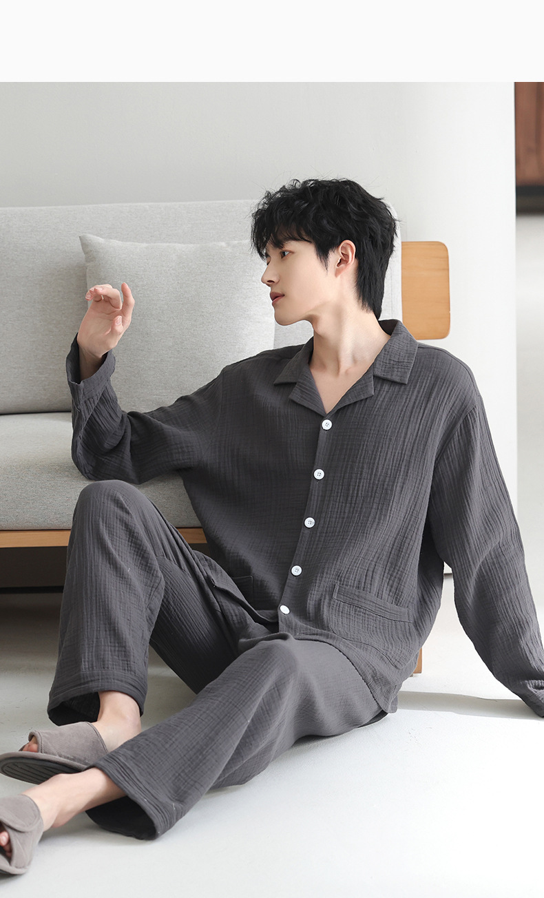 잠옷 남자의 봄과 가을 짠 코튼 거즈 캐주얼 긴 소매 아웃웨어 코튼 옷깃 홈 의류 세트