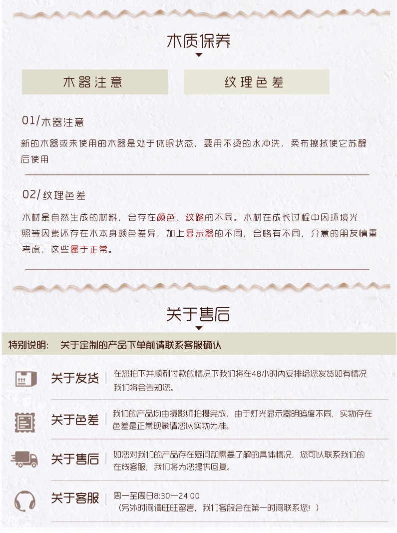 备注:实木产品由于材料的特性,颜色深浅,树结,纹路等差异无法避免,手工打磨,如果个别砂痕属正常现象。