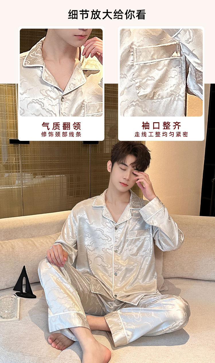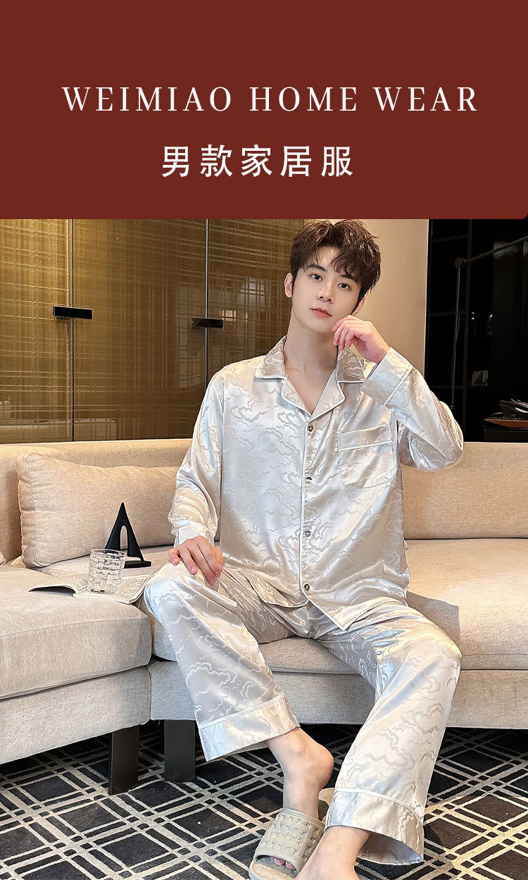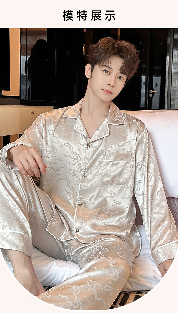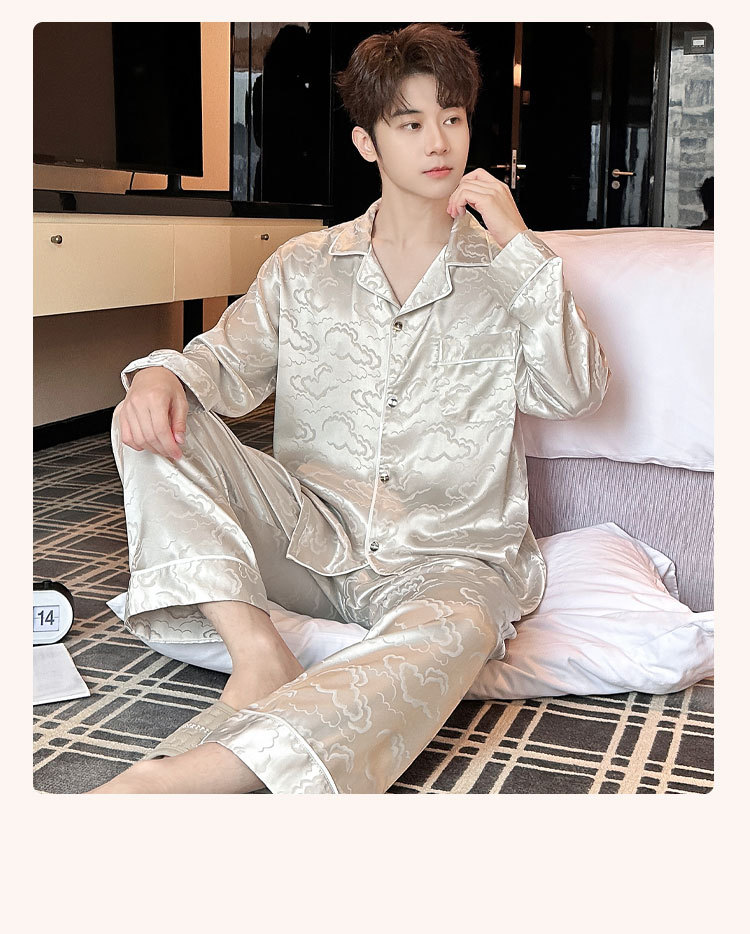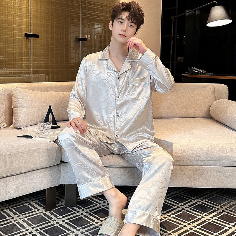 2025 새로운 도착 아이스 실크 파자마 남자 자카드 긴팔 바지 플러스 사이즈 유행 느슨한 홈 의류 세트스토어 가기