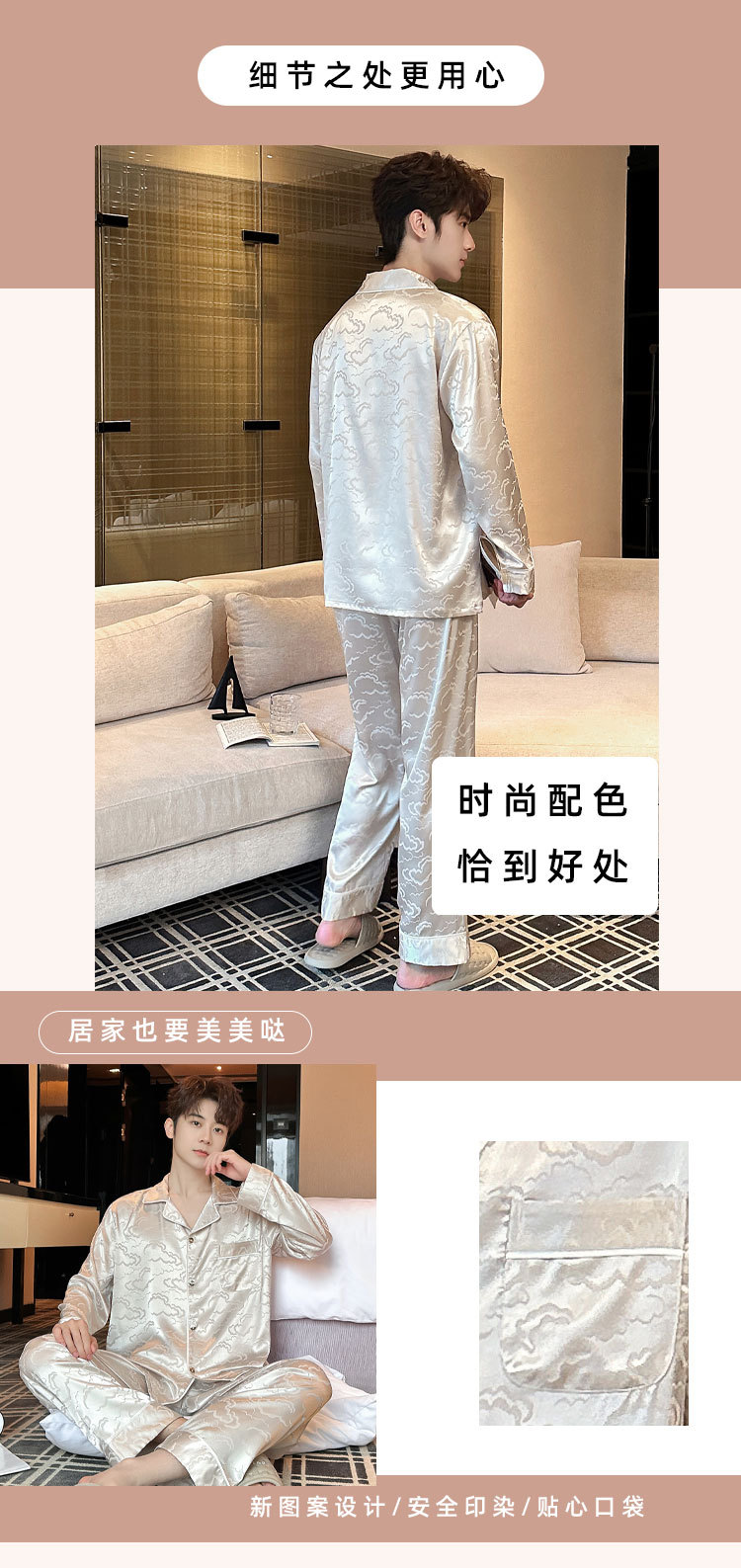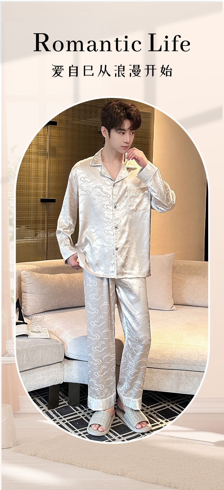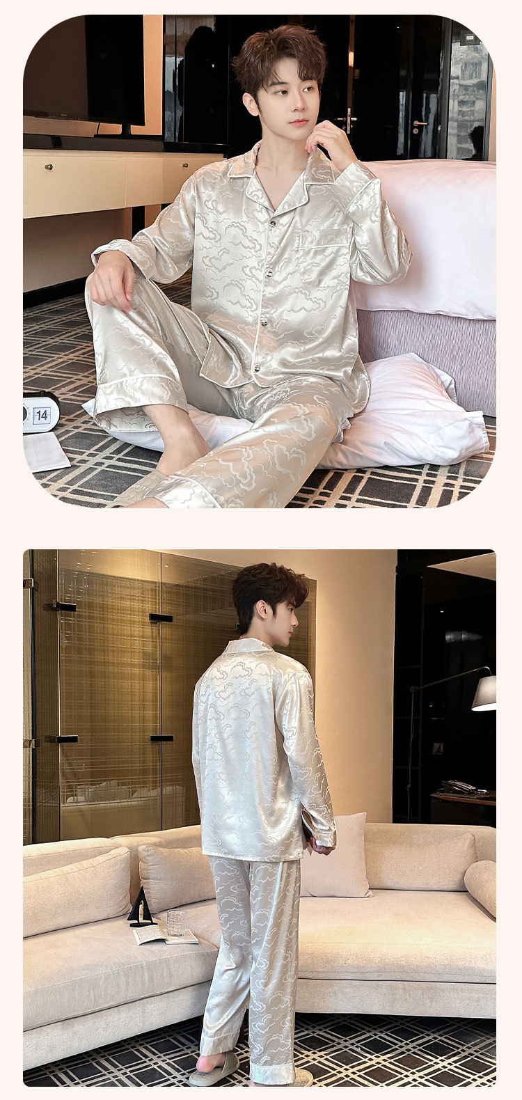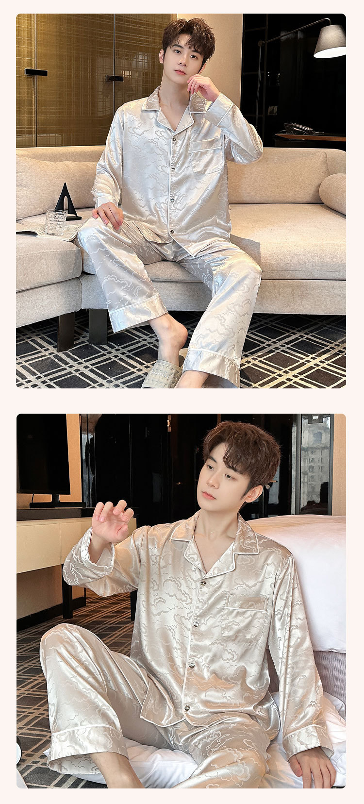 2025 새로운 도착 아이스 실크 파자마 남자 자카드 긴팔 바지 플러스 사이즈 유행 느슨한 홈 의류 세트스토어 가기