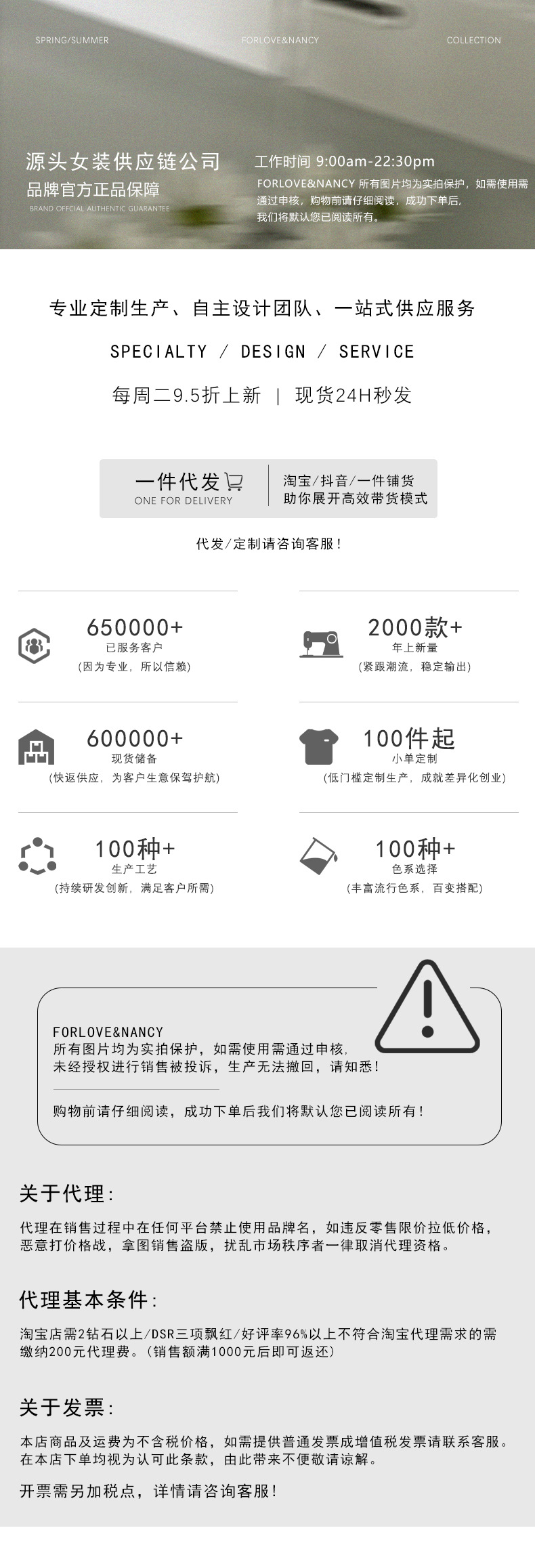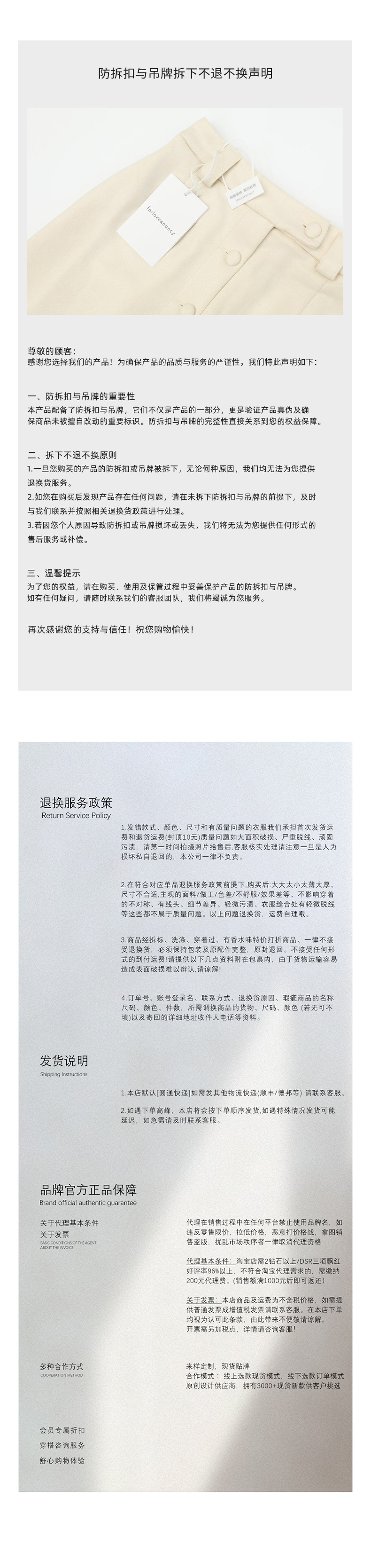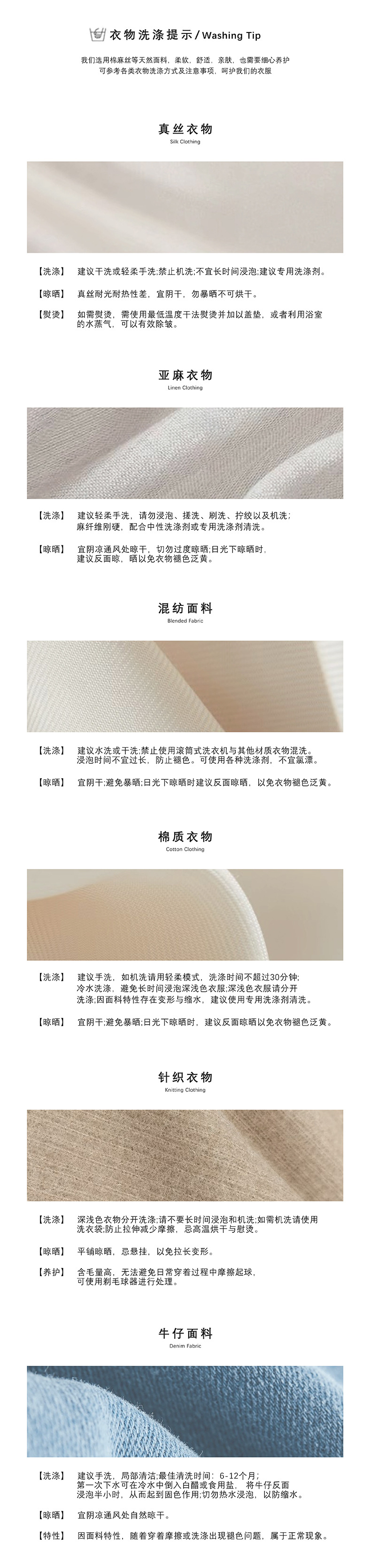 | 注意:毛衣掉毛属正常现象!并非质量问题!不可机洗!下单默认已读。 工厂在加工毛衣时,为了追求更好的外观和手感,会进行一定的处理,这也会导致在毛衣表面留有少许浮毛。这些浮毛在后续的穿着过程中,通过摩擦和洗涤会逐渐脱落。并不会影响毛衣的质量。对于掉毛问题可以尝试一些简单的处理方法。例如,使用透明胶或者粘毛器将浮毛清除,或者选择使用抗静电洗衣液清洗毛衣,以减少掉毛的情况。通过适当的处理和保养,可以大大减轻这种现象。 毛衣购前须知:关于缩水的贴心提示 亲爱的顾客,感谢您选择我们的毛衣产品!为了确保您购买到称心如意的衣物,请在选购前仔细阅读以下关于毛衣缩水的须知事项: 1. 缩水是天然面料的常见特性 羊毛、羊绒、棉等天然材质因纤维特性,在洗涤或受热时可能出现轻微缩水(约3%-5%),这属于正常现象,并非质量问题。 合成纤维(如涤纶、腈纶)缩水率较低,但透气性和保暖性相对较弱。 2. 选购时建议“留有余地” 若喜欢合身效果,可按正常尺码选择;若担心缩水,建议选大1码(尤其是高羊毛含量款式)。 参考商品详情页的「面料成分」和「洗涤建议」,高比例羊毛(>50%)更需注意护理方式。 3. 正确的护理能减少缩水风险 洗涤方式:建议手洗或选择洗衣机的“羊毛模式”,水温≤30℃,避免长时间浸泡。 晾晒方法:平铺阴干,切勿悬挂或暴晒,防止变形。 熨烫技巧:中低温隔布熨烫,避免直接接触纤维。 |