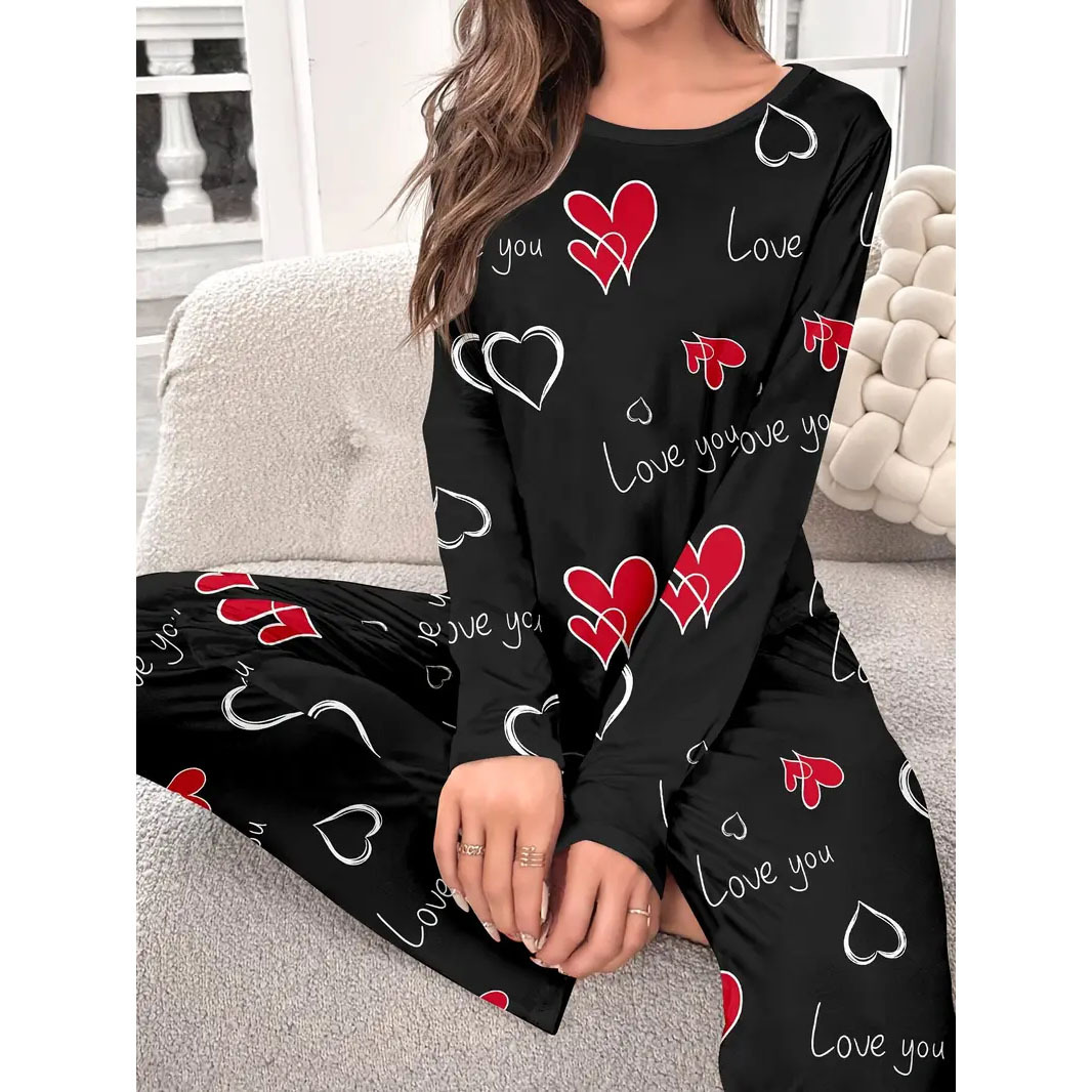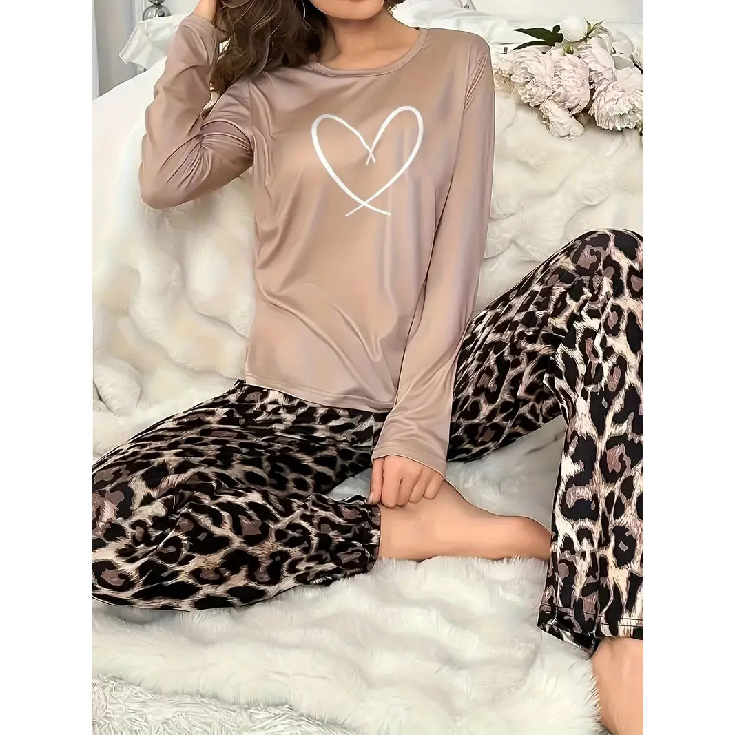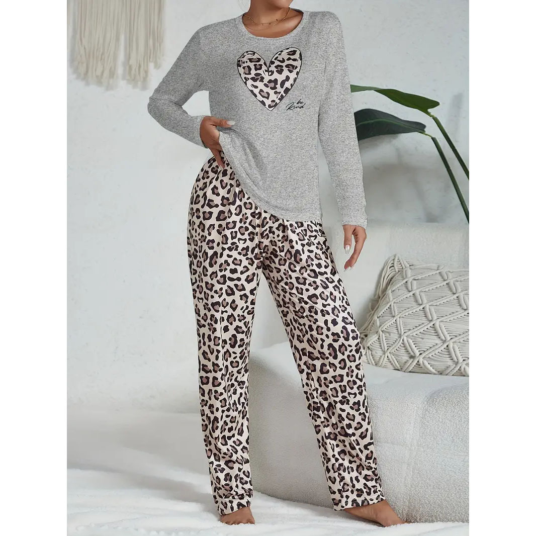 국경을 넘는 캐주얼 러브 레오파드 파자마, 유럽과 미국의 편안한 느슨한 긴팔 여성용 홈 의류 세트 캐주얼 세트