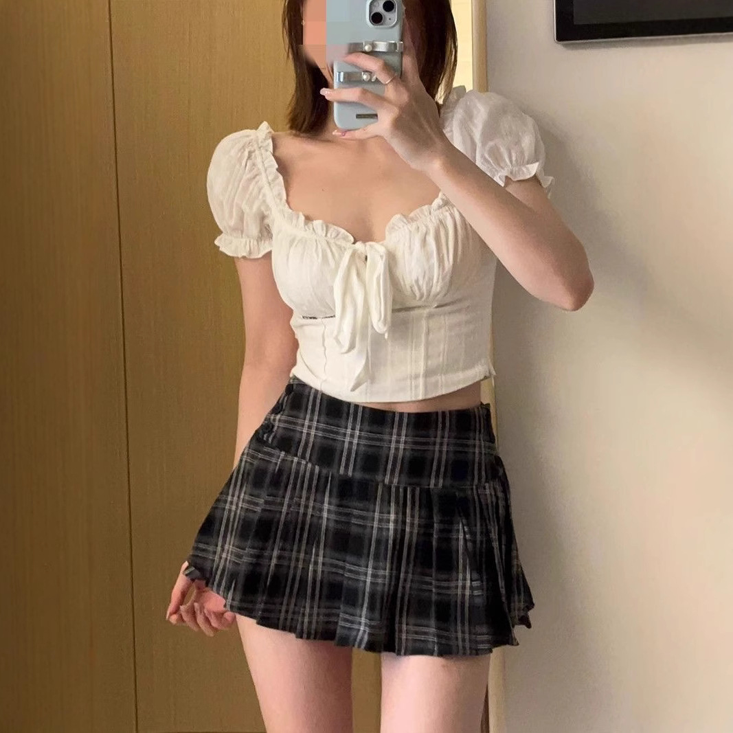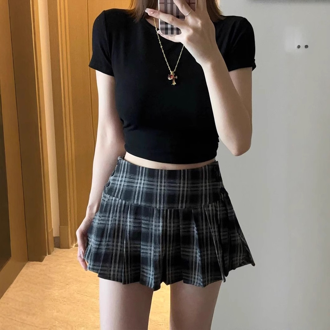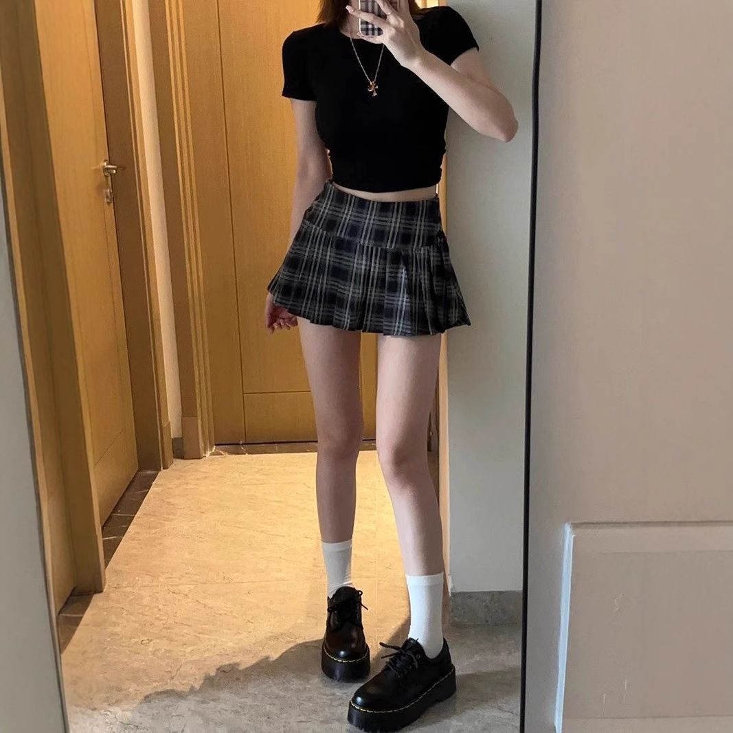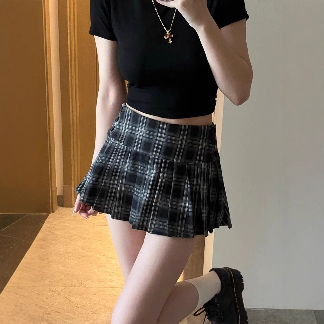 미국 스타일 레트로 격자 무늬 스커트 여성 여름 새로운 스타일 체크 무늬 스커트 뜨거운 소녀 낮은 허리 주름 스커트 짧은 A 라인 스커트