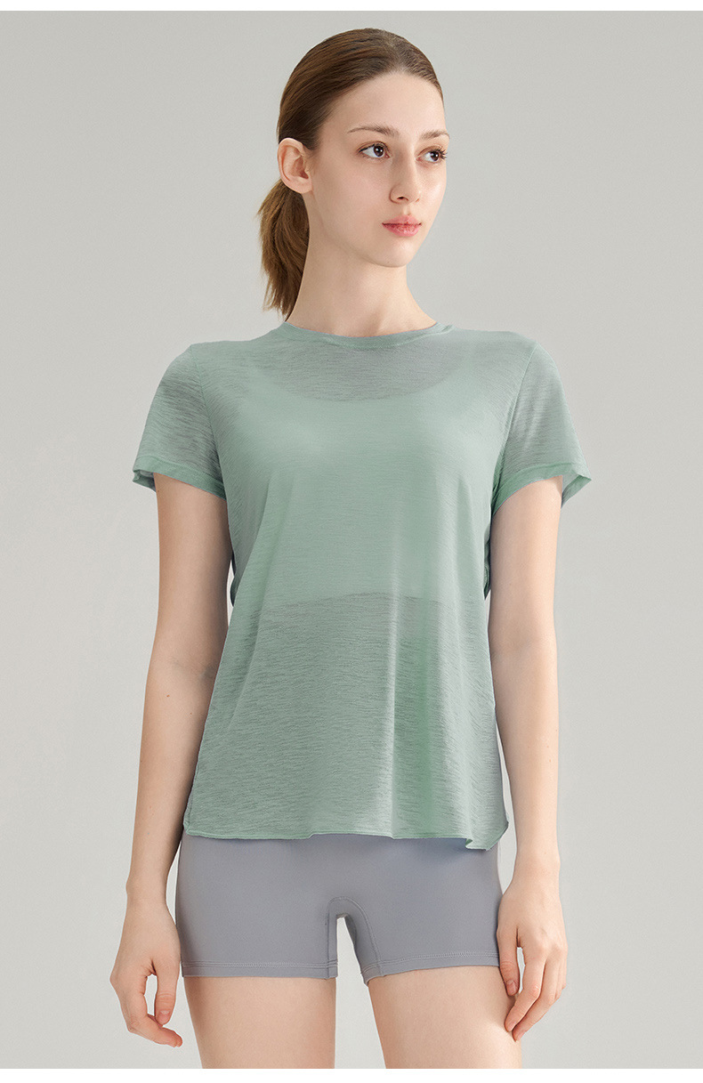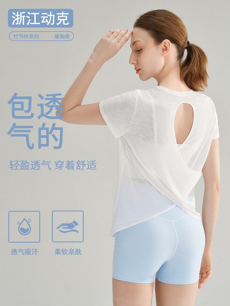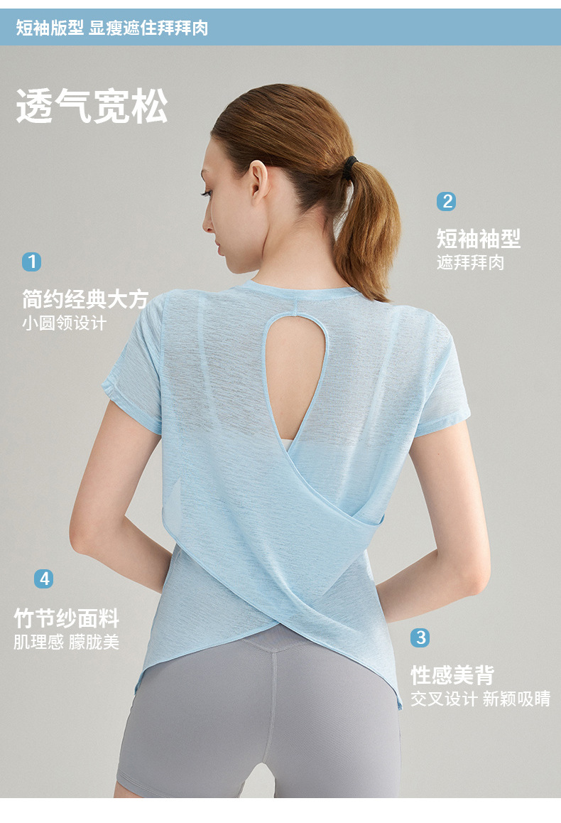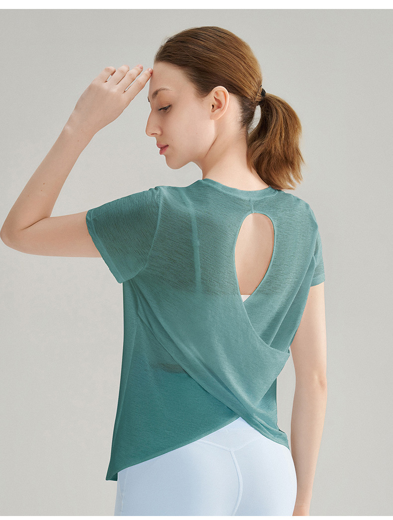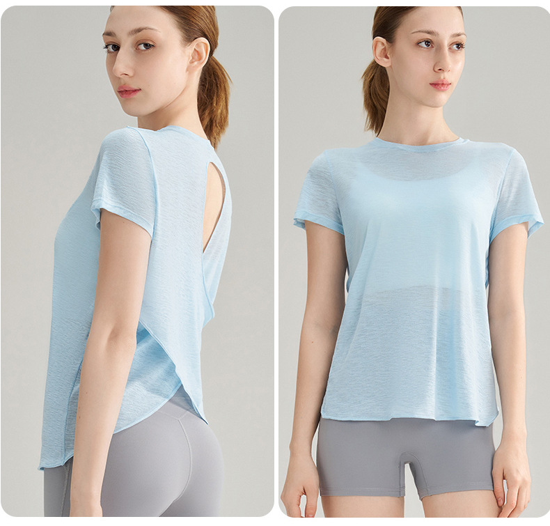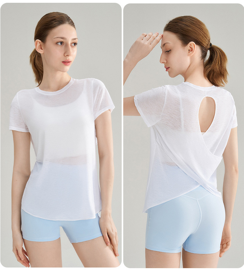 대나무 섬유로 만든 속이 비치는 등 부분이 돋보이는 야외 스포츠 반팔 상의, 통기성 좋은 라운드넥 피트니스 크로스 밑단 요가 커버업 여성용스토어 가기
