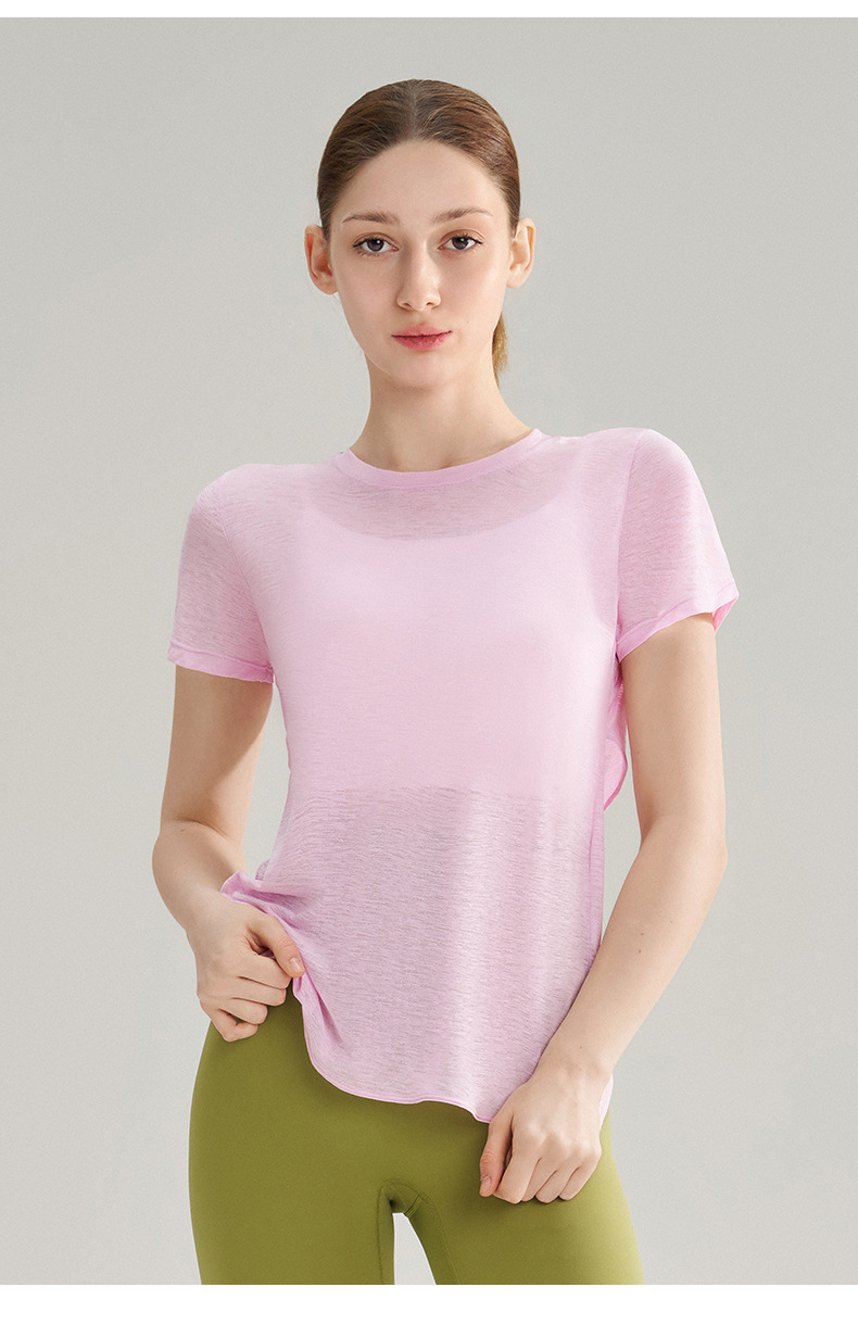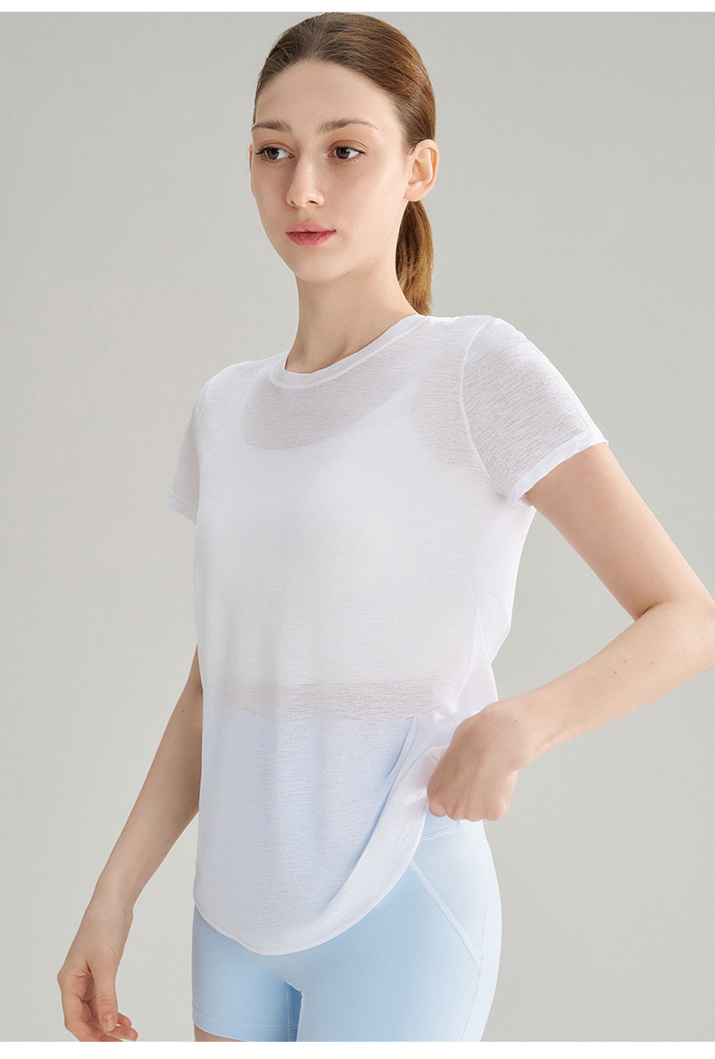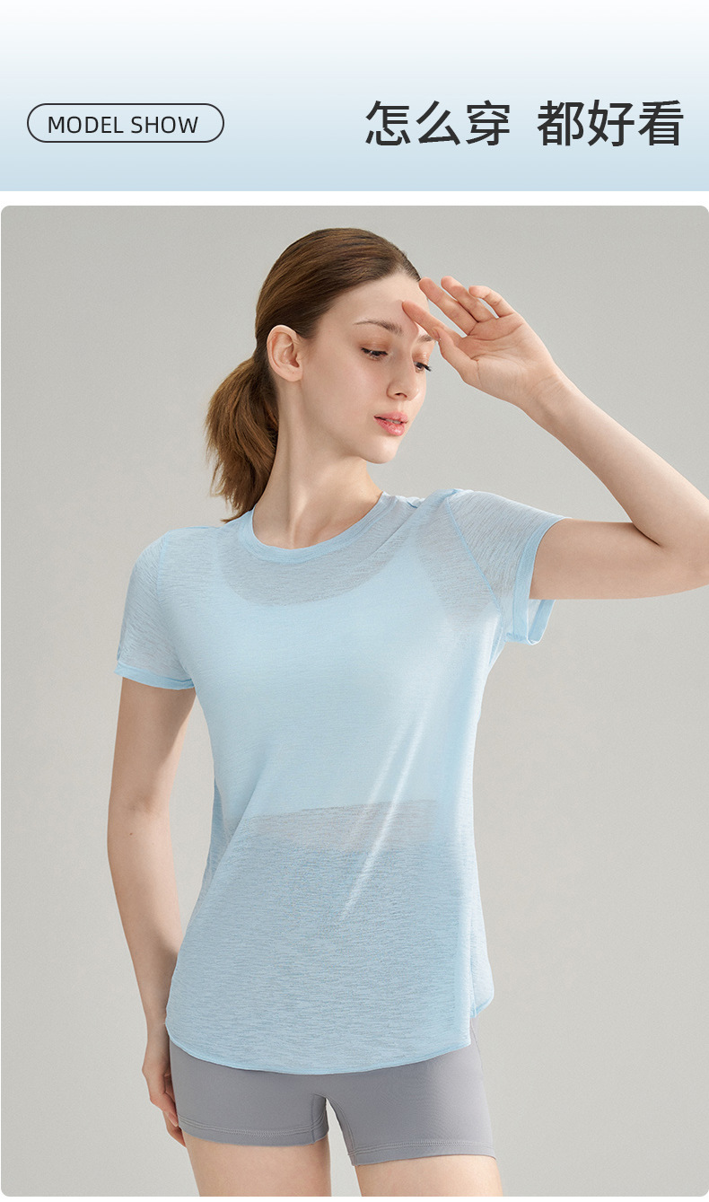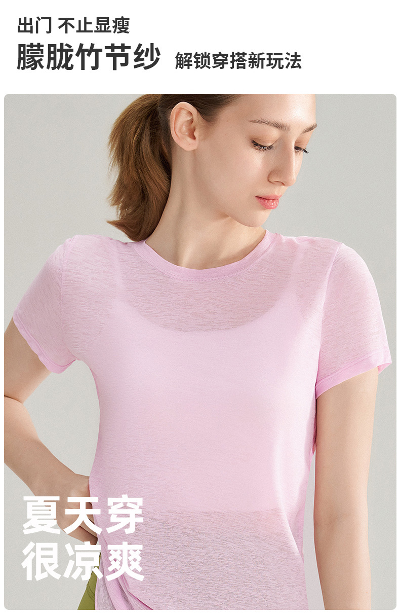 대나무 섬유로 만든 속이 비치는 등 부분이 돋보이는 야외 스포츠 반팔 상의, 통기성 좋은 라운드넥 피트니스 크로스 밑단 요가 커버업 여성용스토어 가기