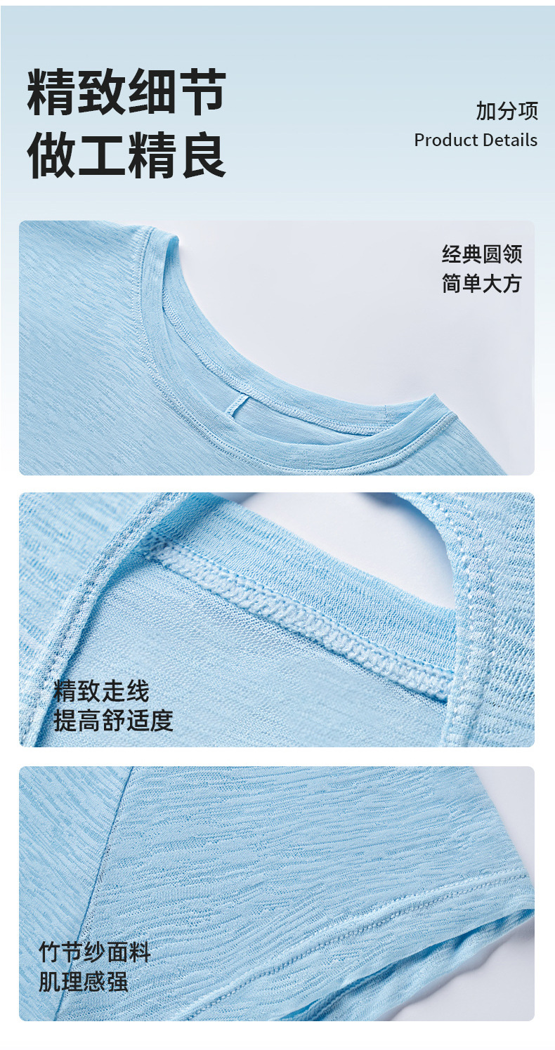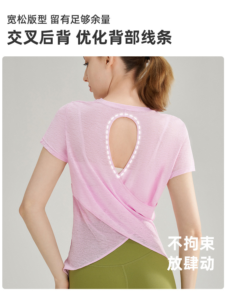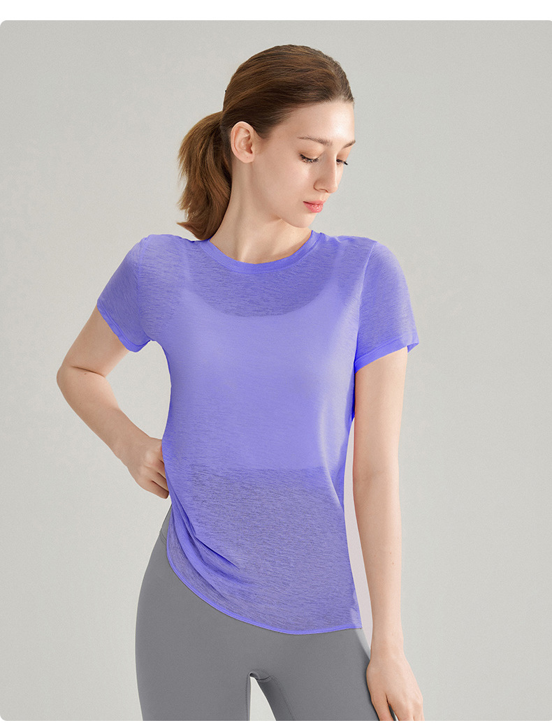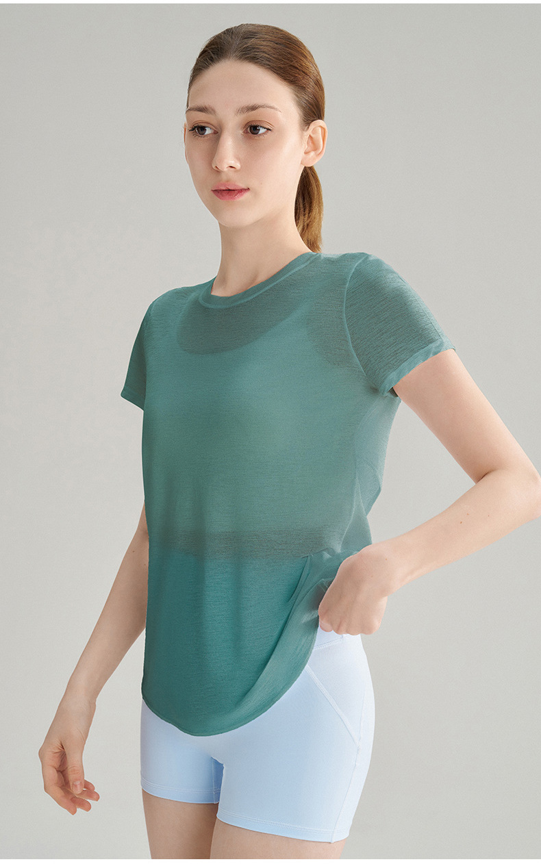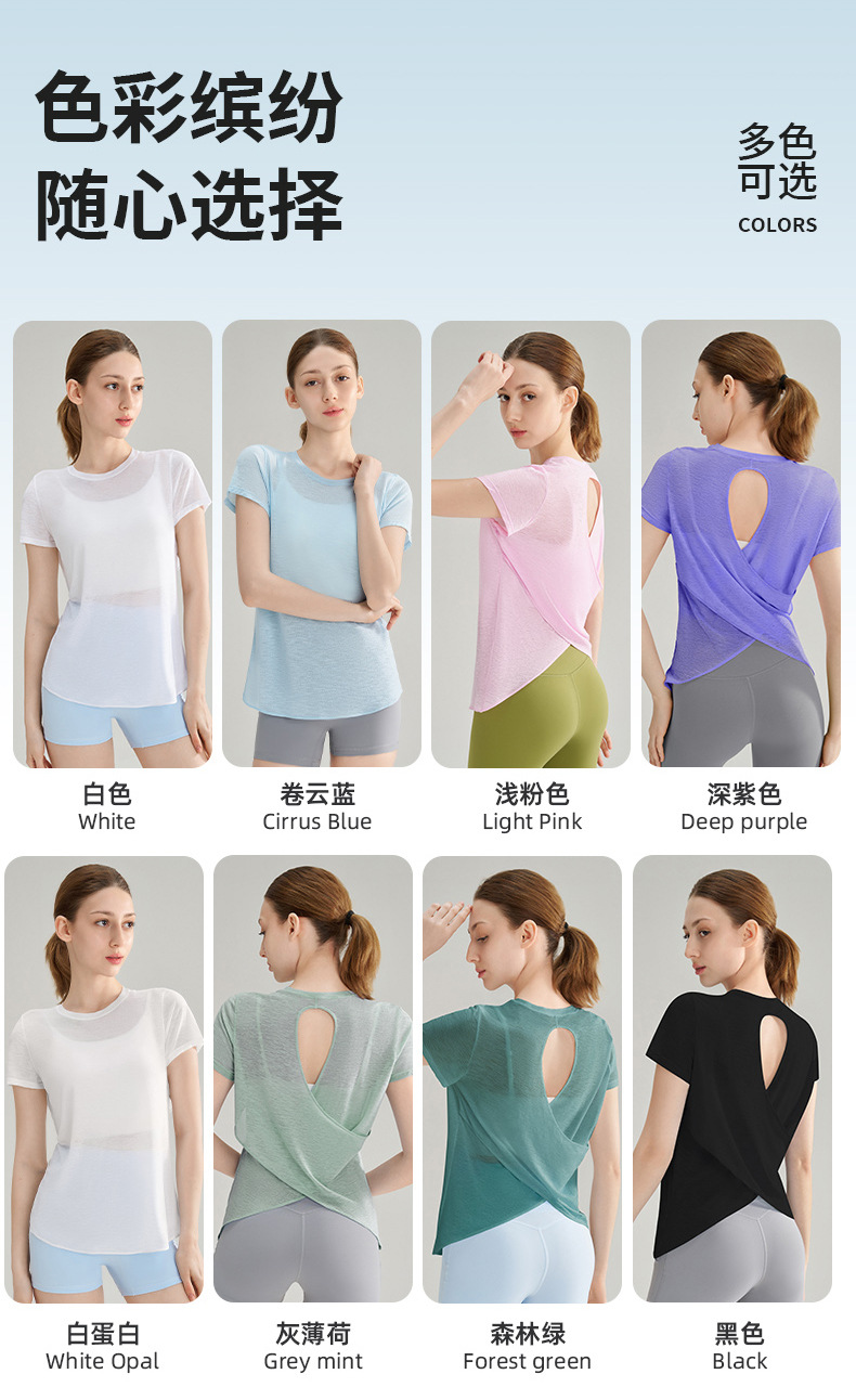 대나무 섬유로 만든 속이 비치는 등 부분이 돋보이는 야외 스포츠 반팔 상의, 통기성 좋은 라운드넥 피트니스 크로스 밑단 요가 커버업 여성용스토어 가기