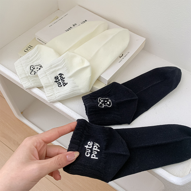 봄과 여름 양말 여성 한국 스타일 바람 자수 강아지 문자 AB 짧은 튜브 양말 메쉬 통기성 흰색 여성 양말