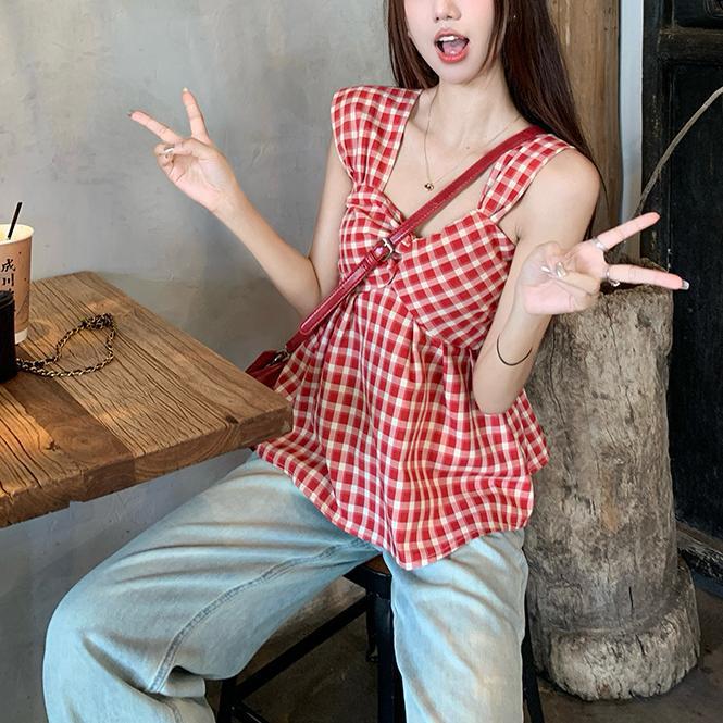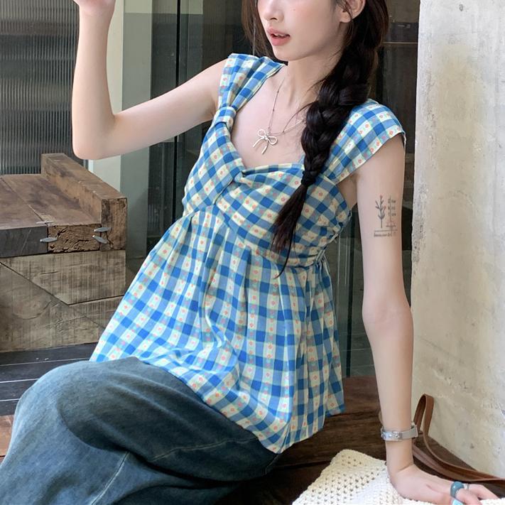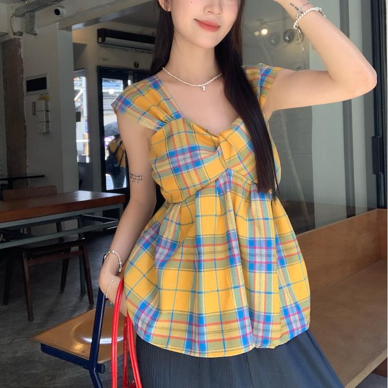 2025 빈티지 한국식 콘트라스트 플레이드 스트랩리스 스웨터 반팔 여름 불규칙한 높은 허리 주름 슬림 핏 슬리밍스토어 가기