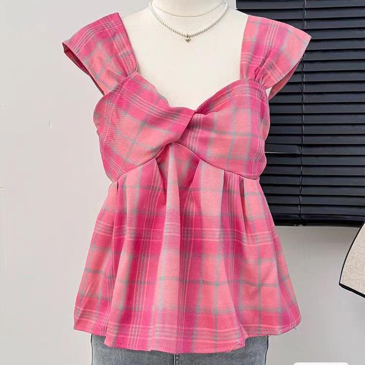 2025 빈티지 한국식 콘트라스트 플레이드 스트랩리스 스웨터 반팔 여름 불규칙한 높은 허리 주름 슬림 핏 슬리밍