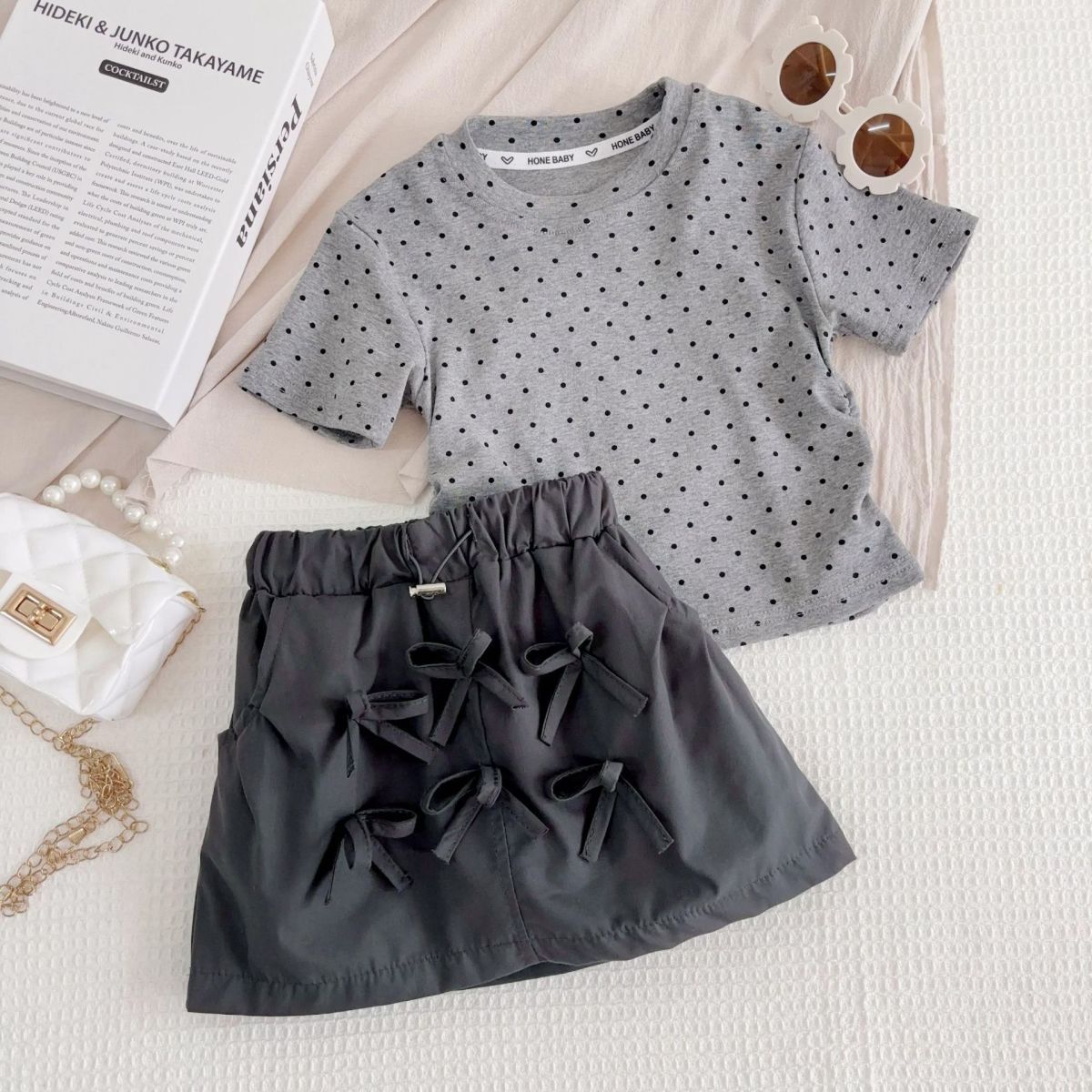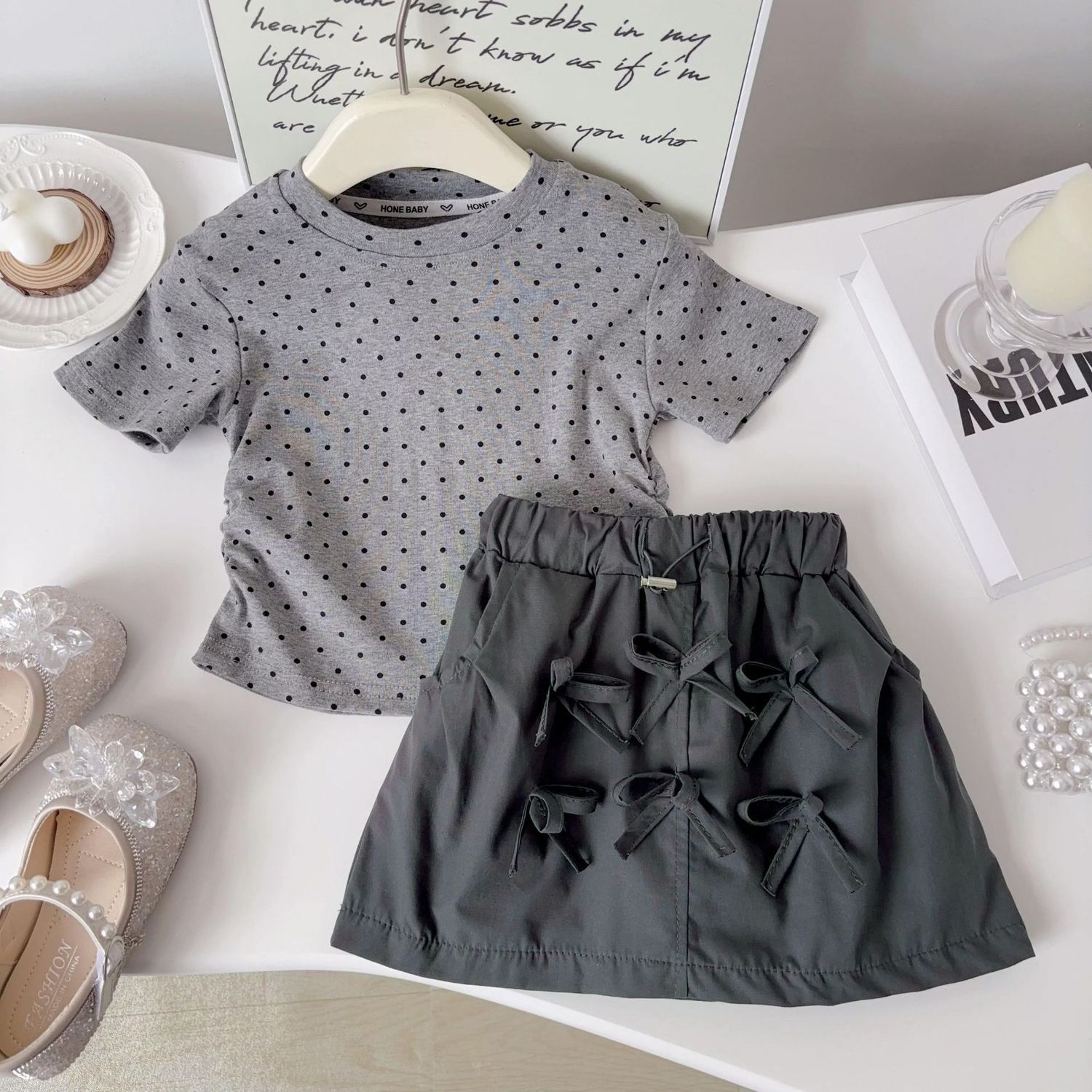 한국 아동복 2025 새로운 소녀 여름 세트 어린이 서양식 반팔 탑 티셔츠 활 치마스토어 가기