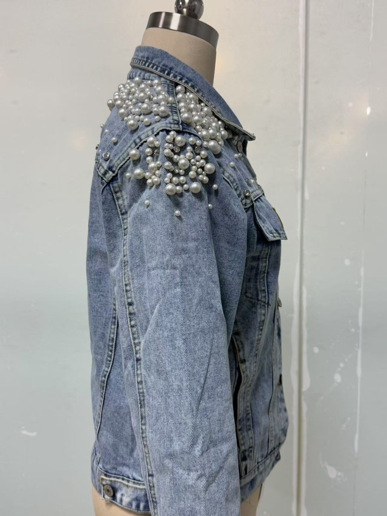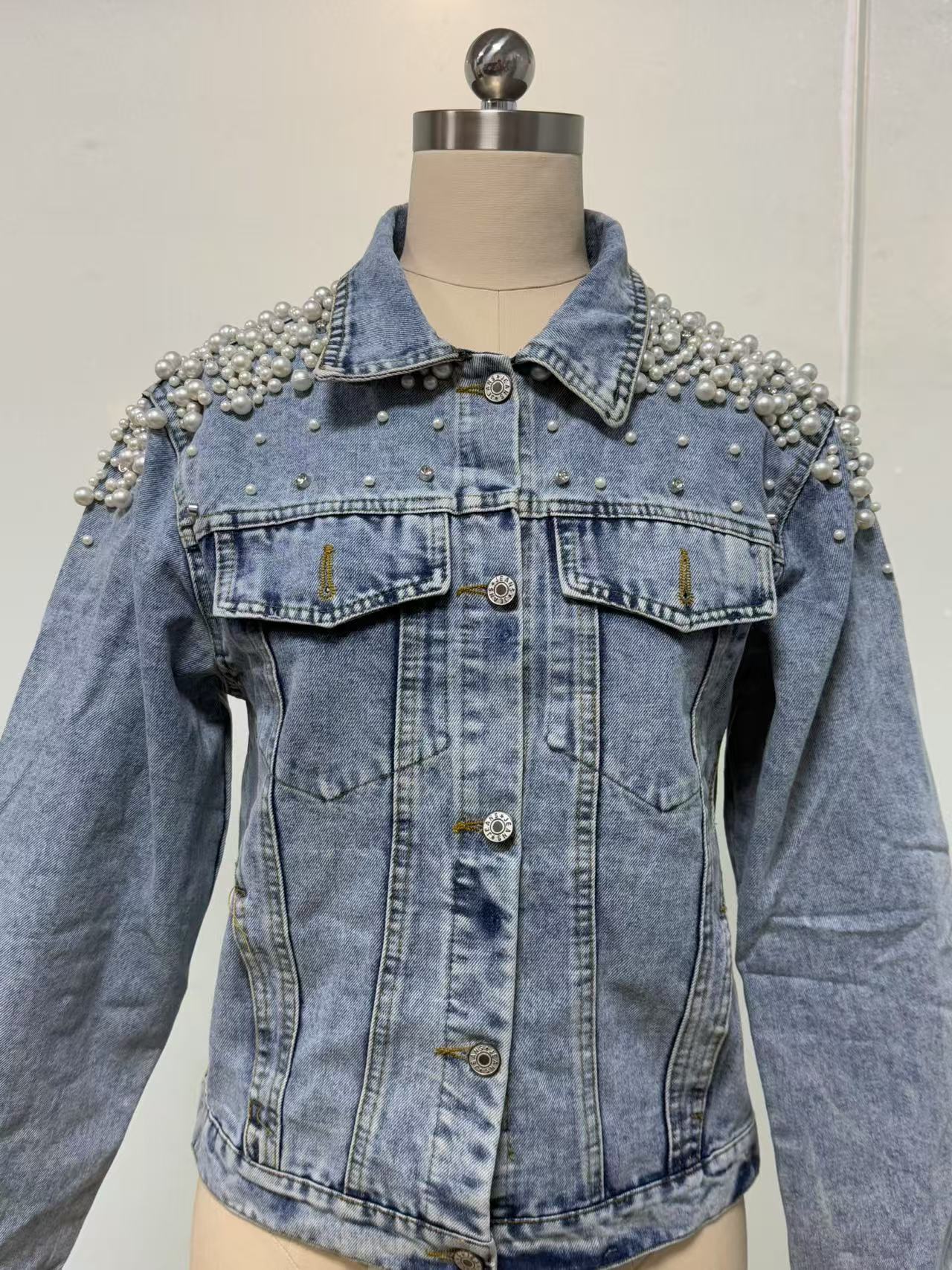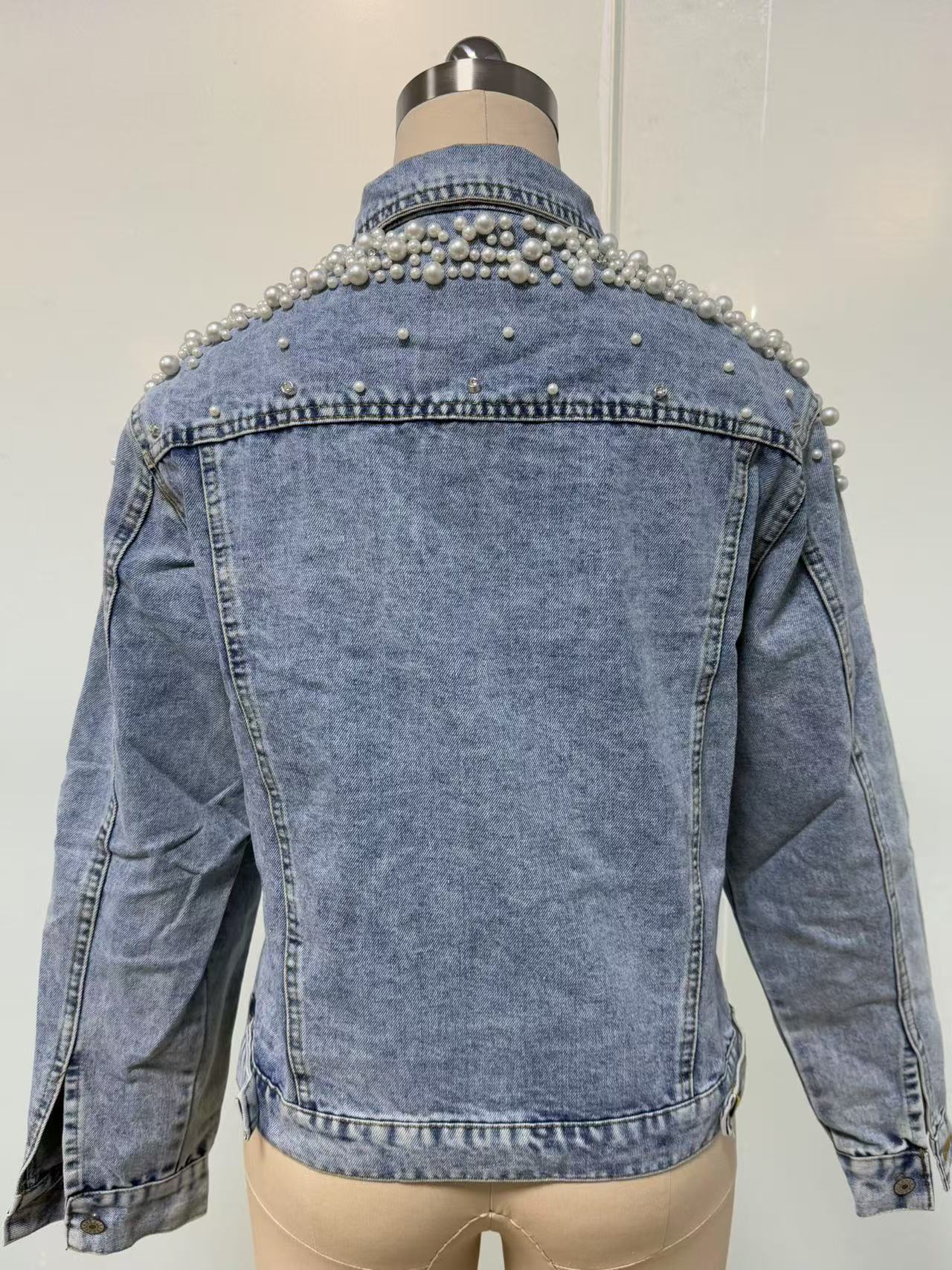 아마존 폭발은 새로운 무거운 작업 네일 비드 느슨한 데님 코트 여성의 새로운 봄 긴 소매 패션 대외 무역 재킷을 기원합니다
