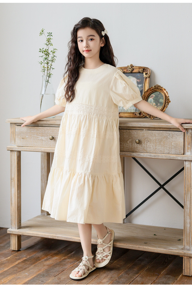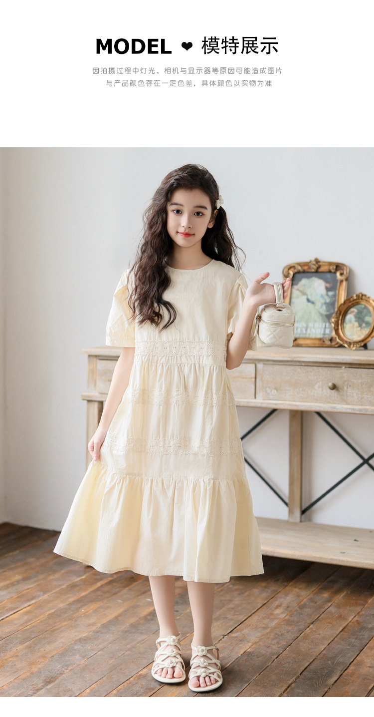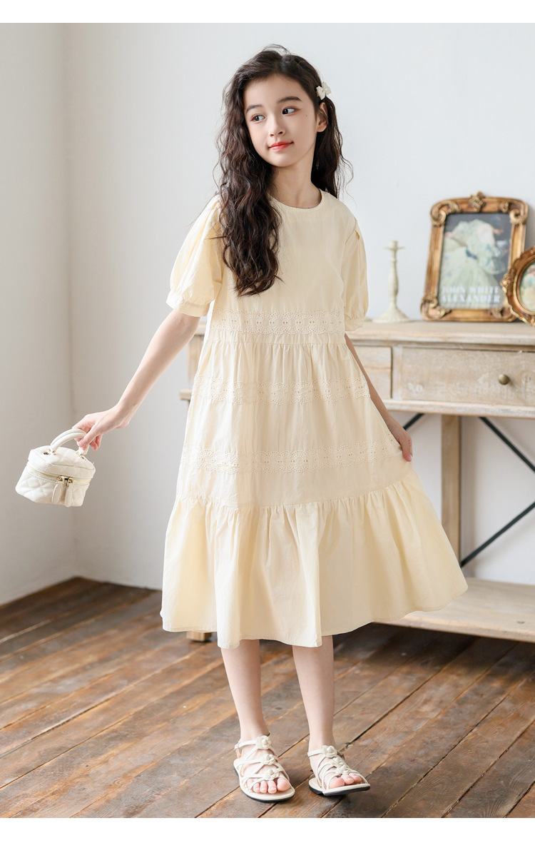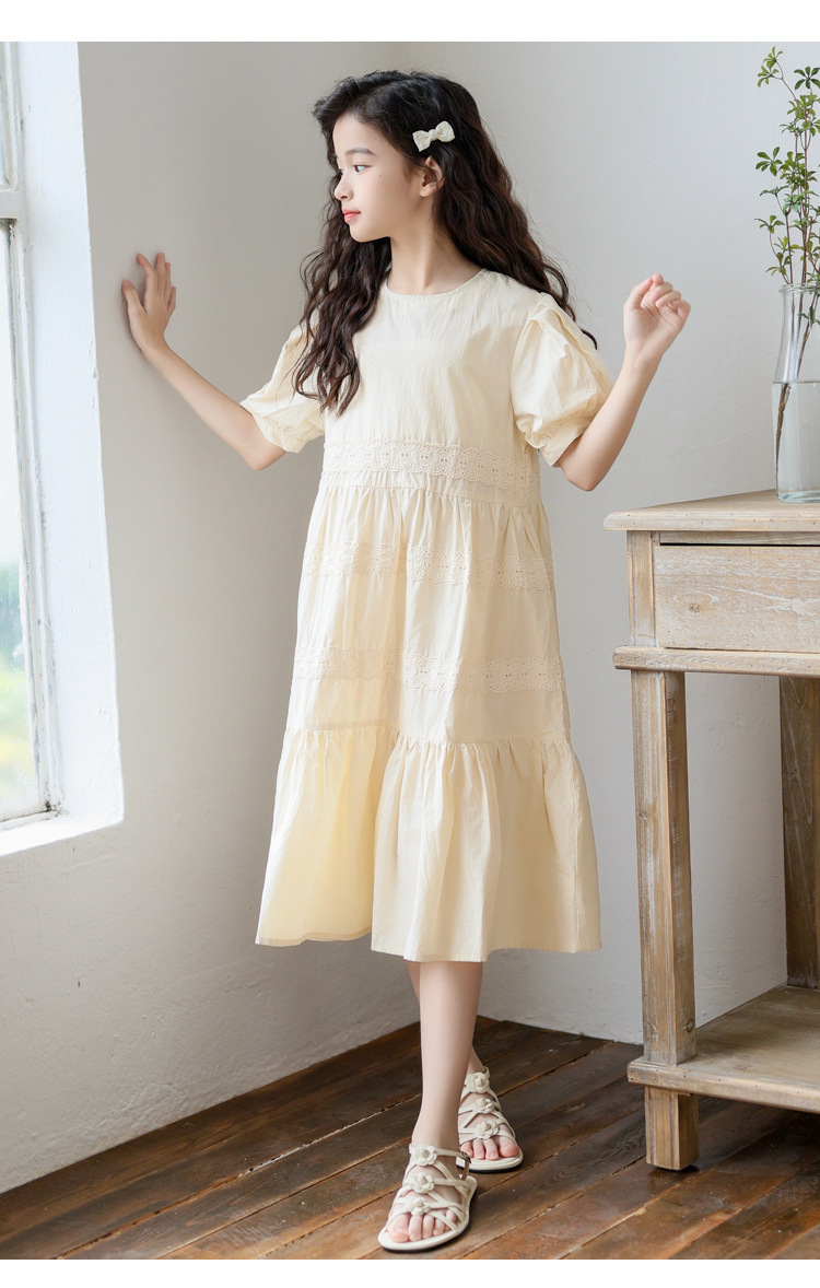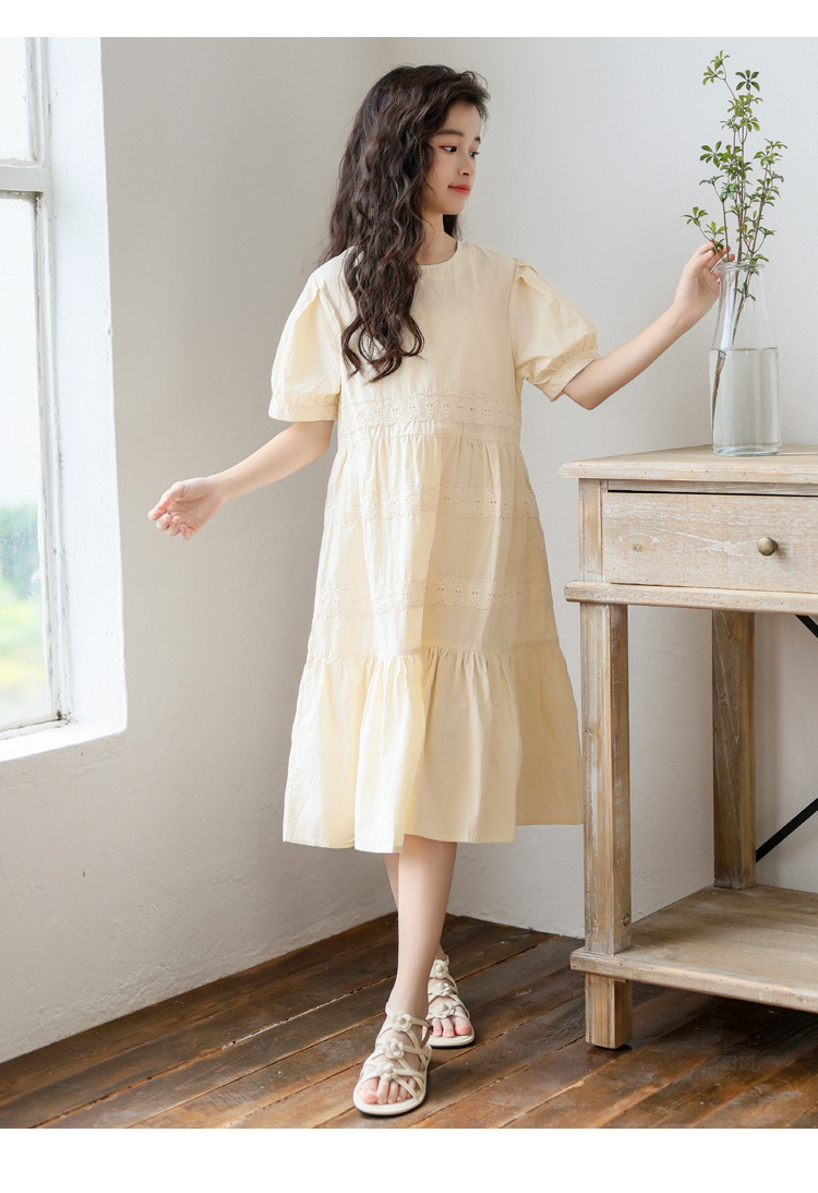 소녀 원피스 여름 새로운 스타일 2025 중 큰 아이 버블 슬리브 중간 길이의 모리 러플 솔리드 컬러 원피스