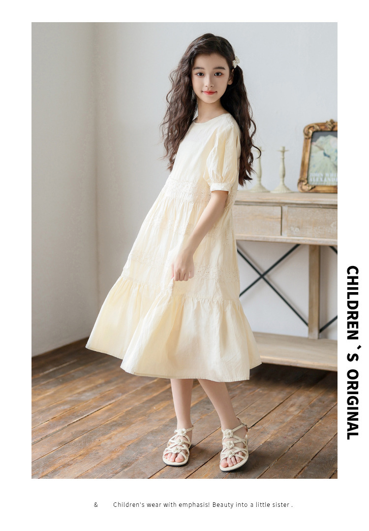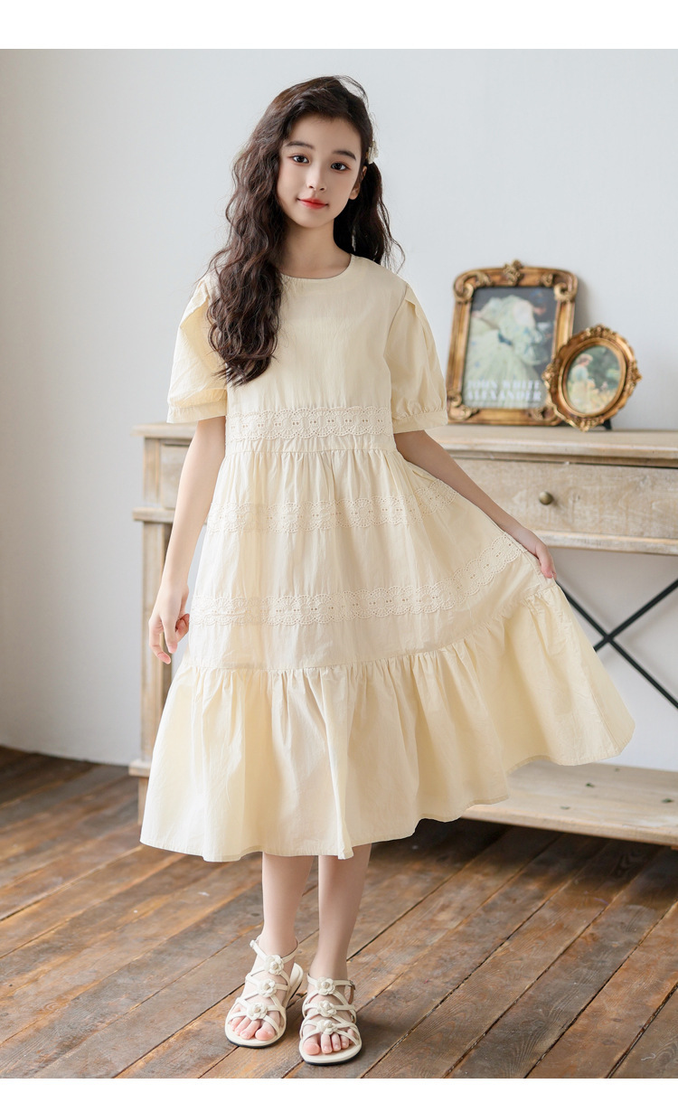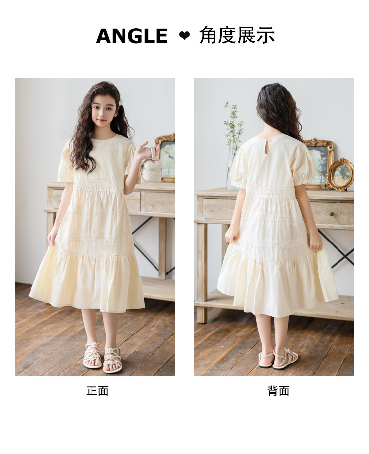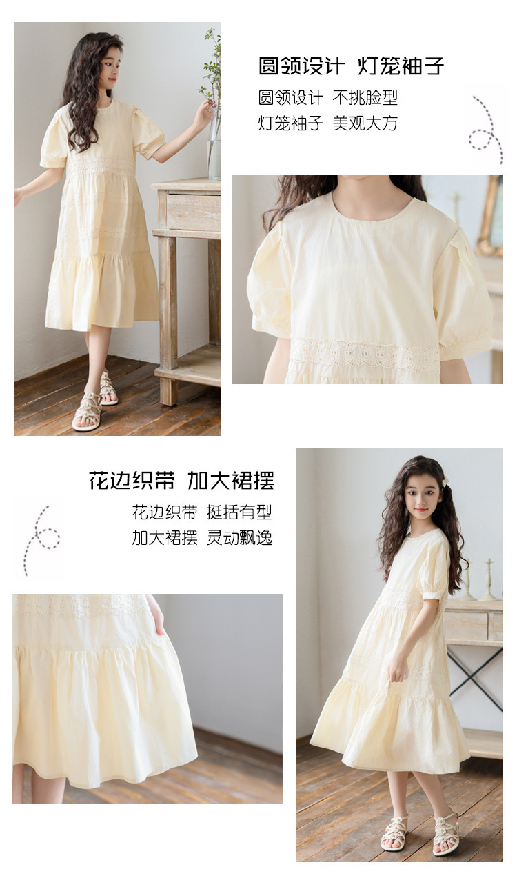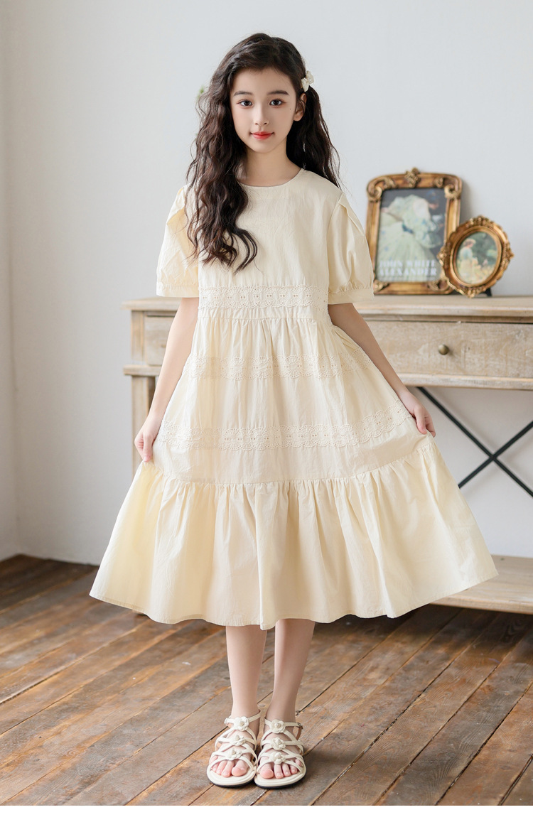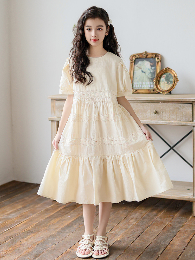 소녀 원피스 여름 새로운 스타일 2025 중 큰 아이 버블 슬리브 중간 길이의 모리 러플 솔리드 컬러 원피스