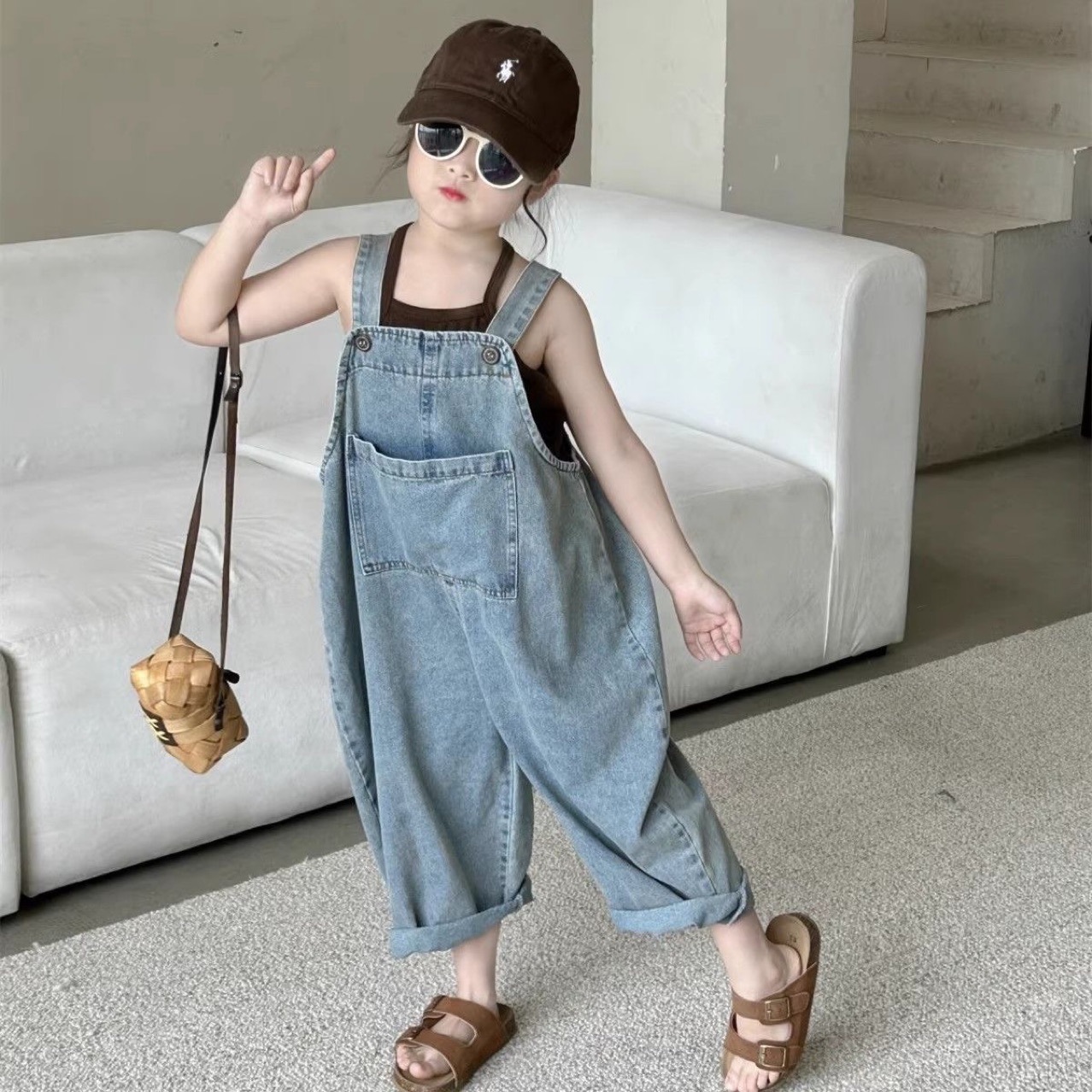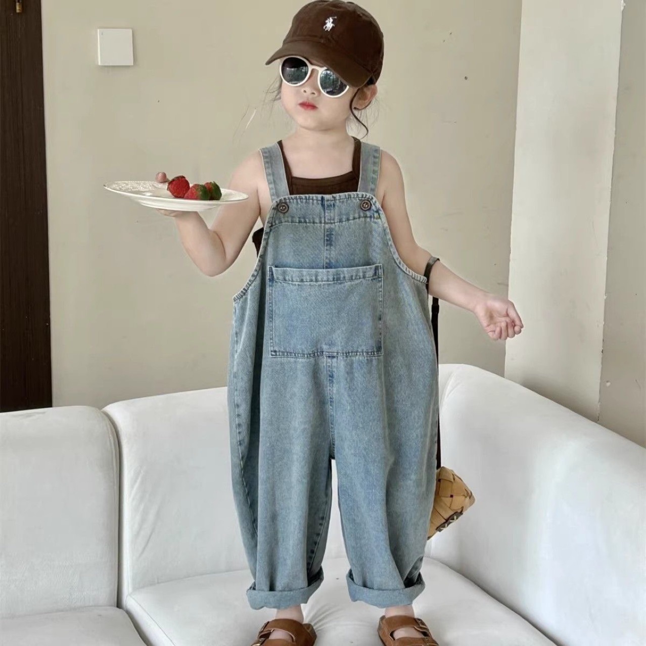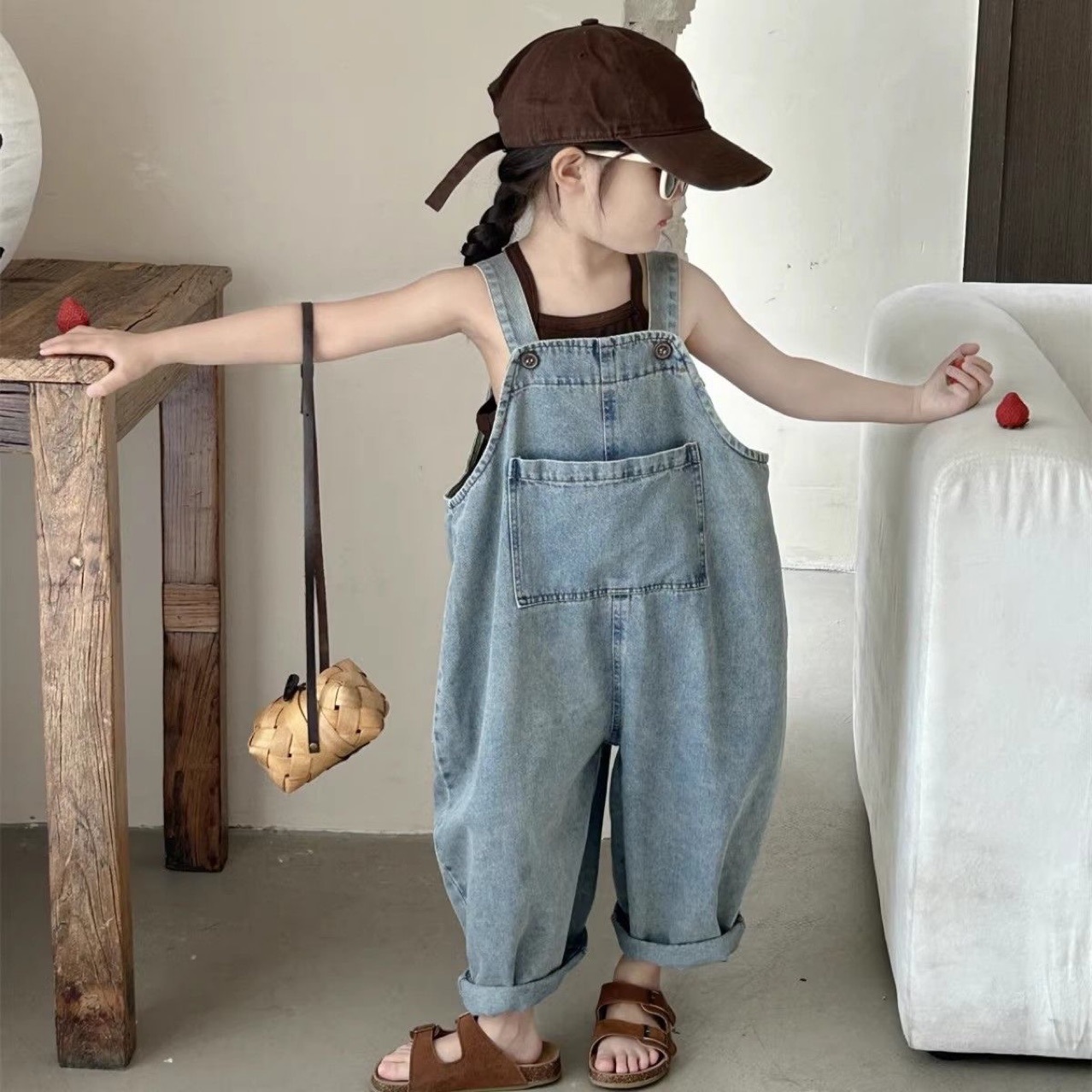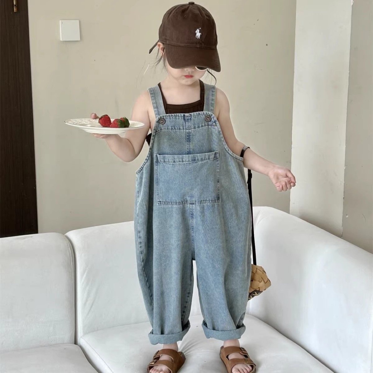 어린이 데님 서스펜더 바지 소녀의 봄과 가을 간단한 서스펜더 바지 어린이 한국식 포켓 캐주얼 바지 소년 느슨한 바지스토어 가기