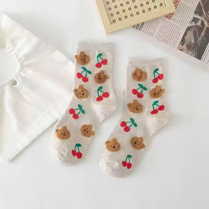한국 귀여운 일본풍 마시멜로 체크무늬 곰돌이 중목 양말, 달콤하고 부드러운 여성용 짧은 양말, 중간 길이 여성용 양말, 버블 양말
