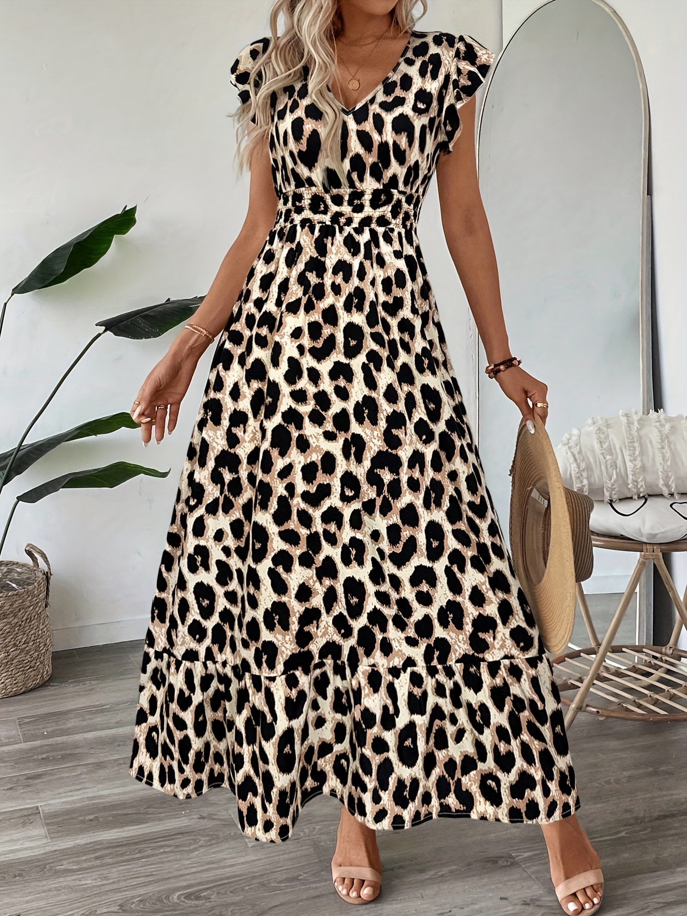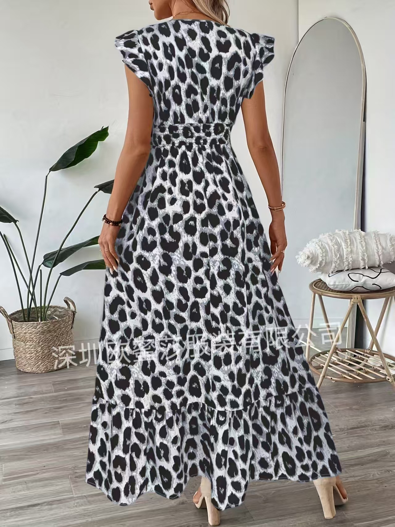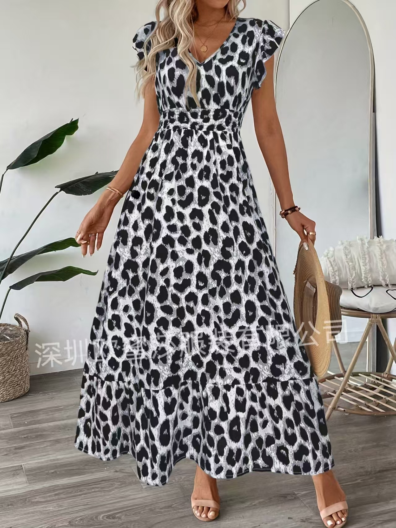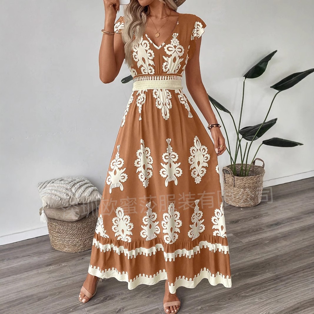 2025 국경 유럽 및 미국 봄과 여름 새로운 대외 무역 여성 휴가 비치 스커트 인쇄 V 칼라 대형 원피스