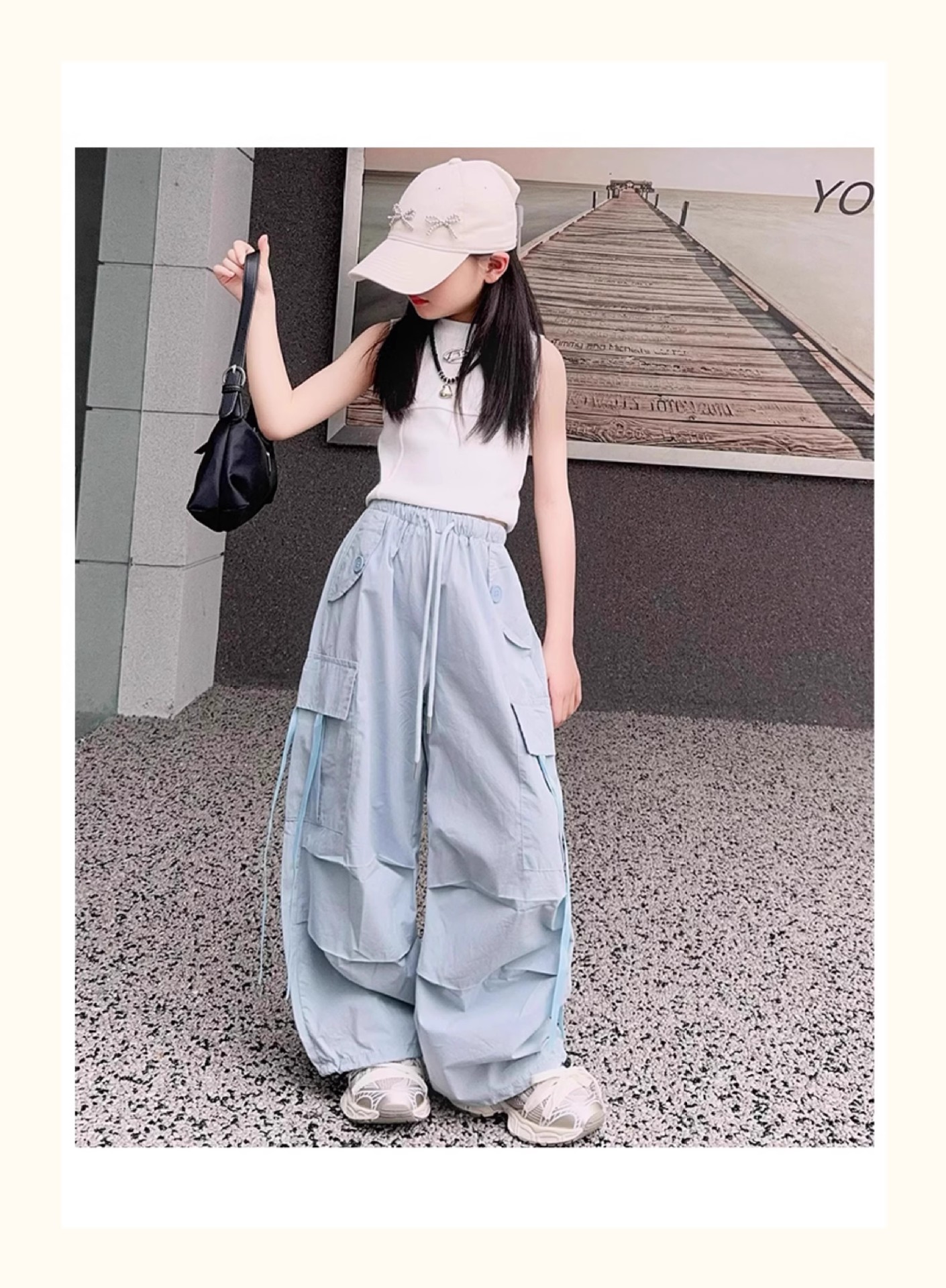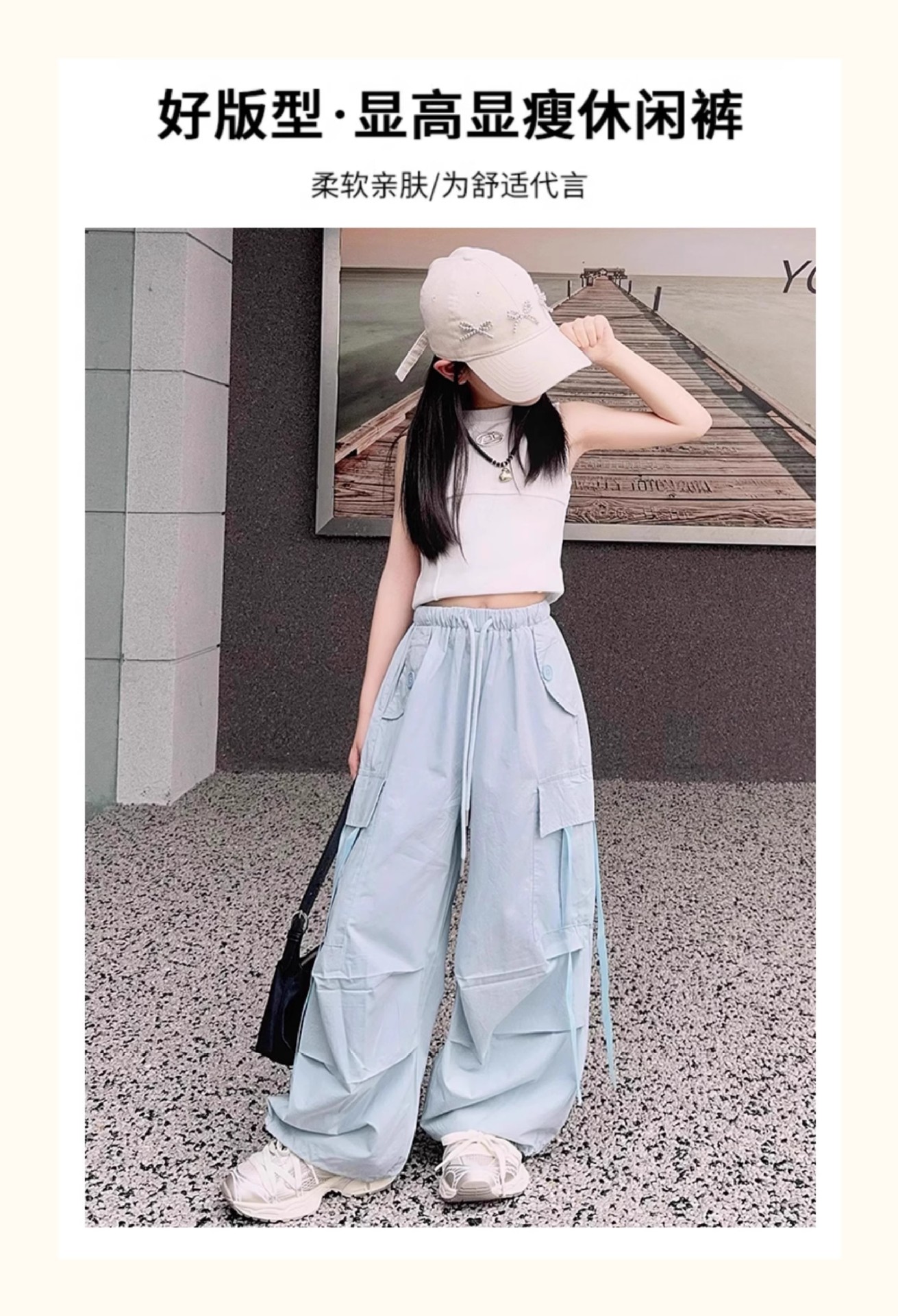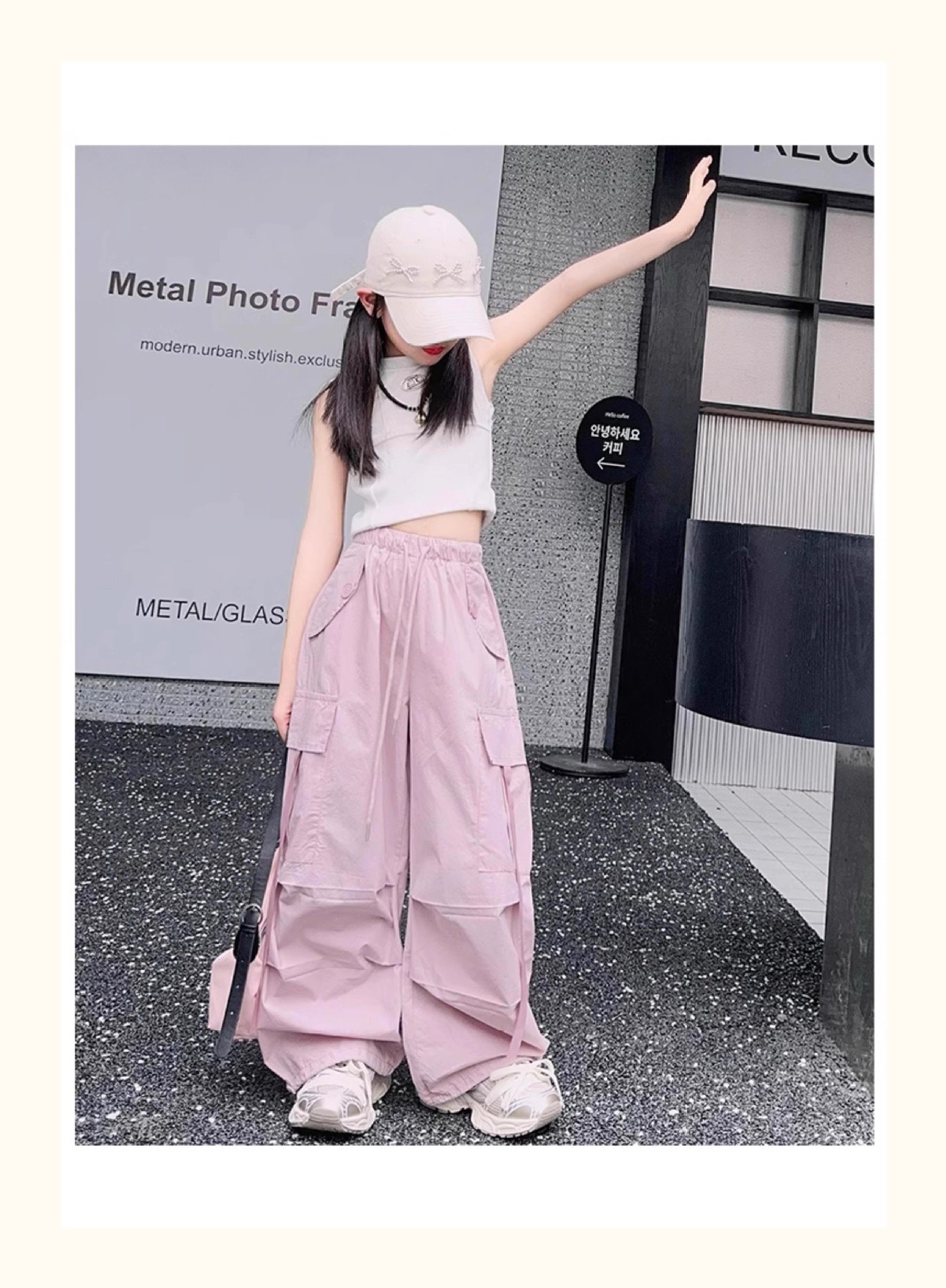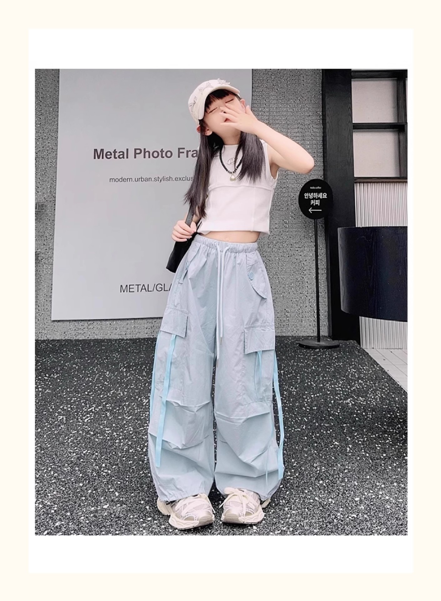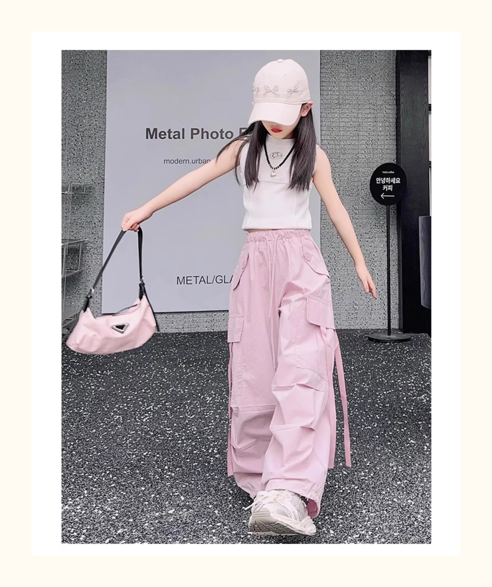 소녀 작업복 여름 새로운 도착 2025 새로운 도착 소녀 유행 루즈 스파이스 소녀 스타일 리본 캐주얼 바지