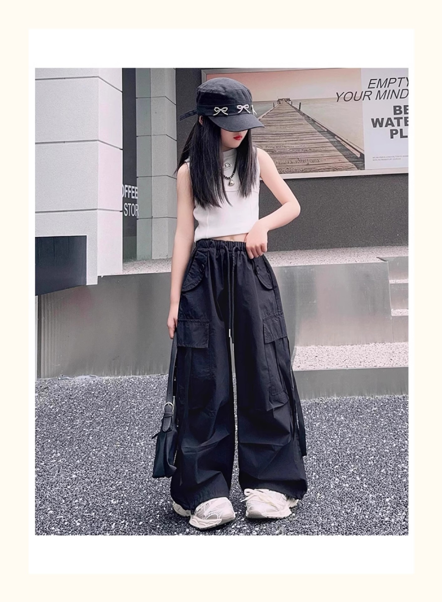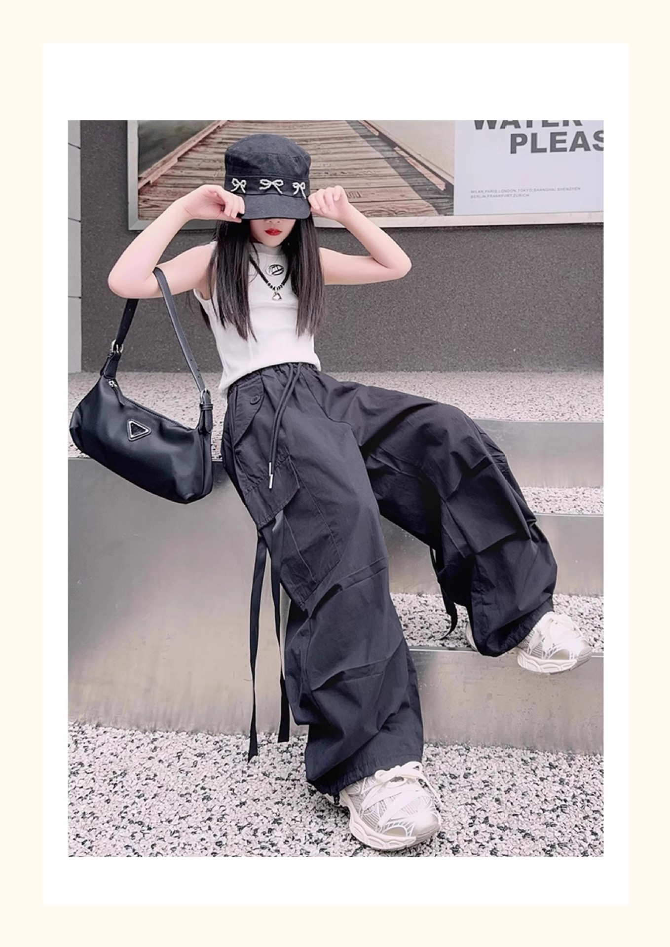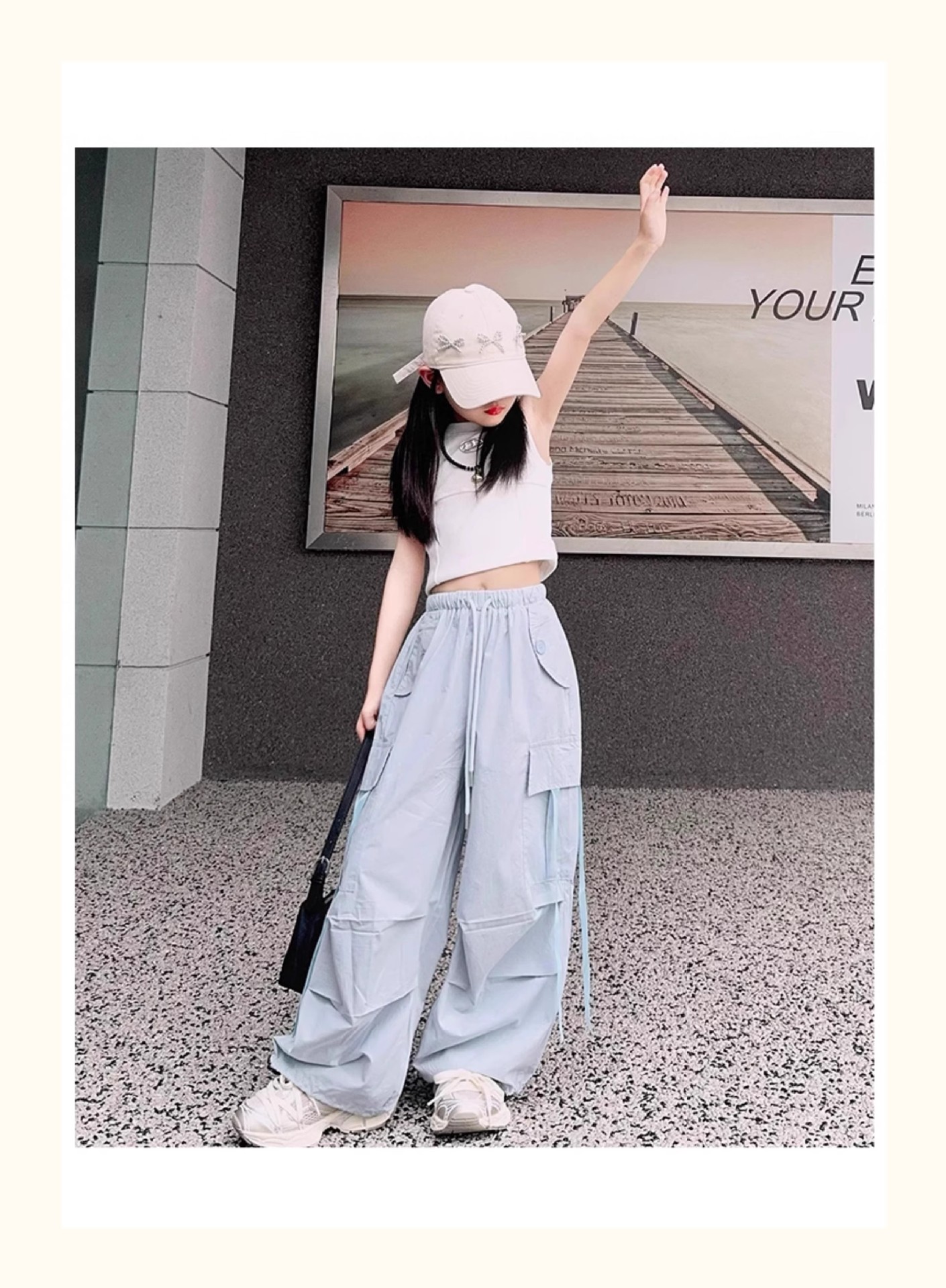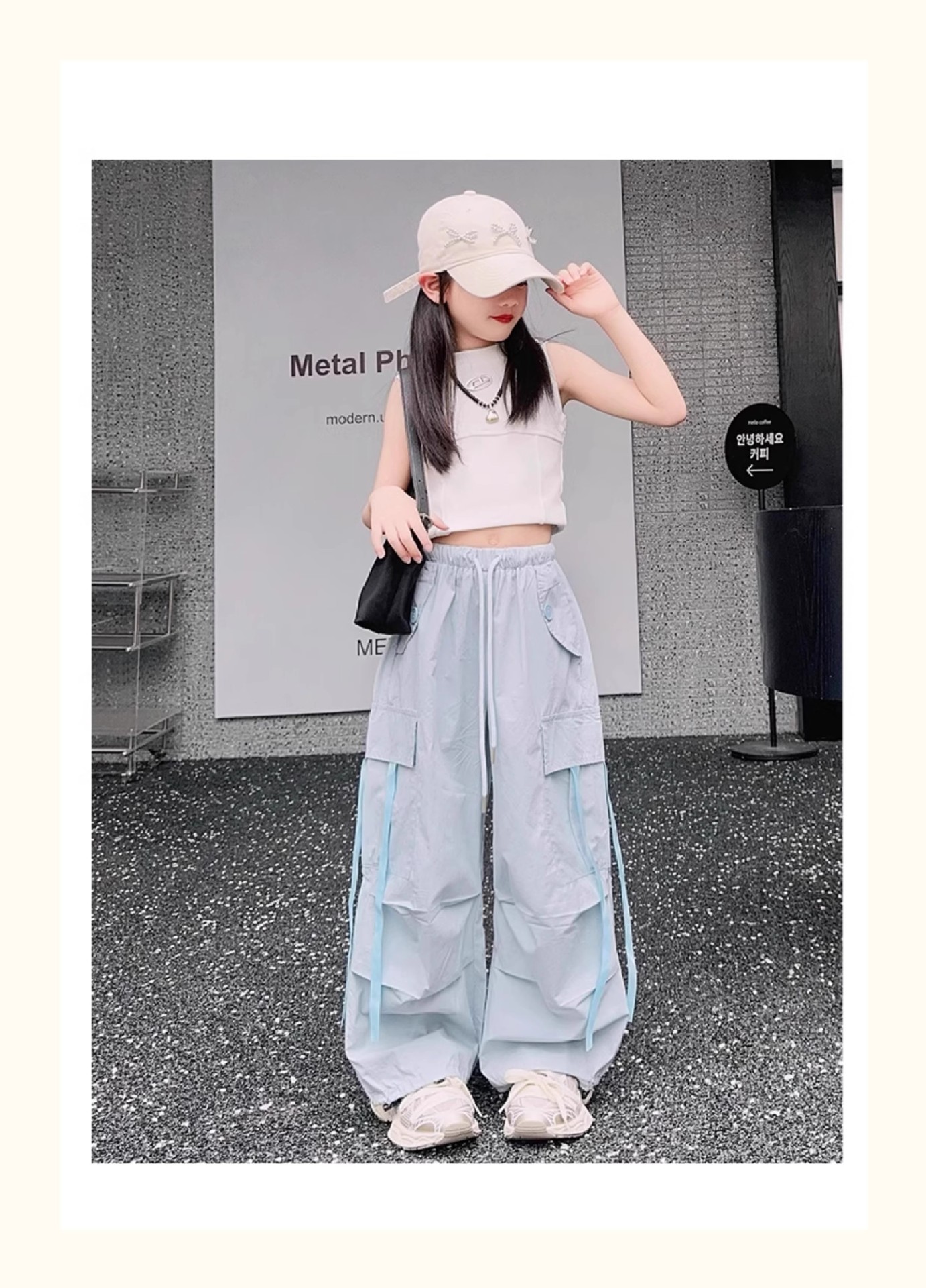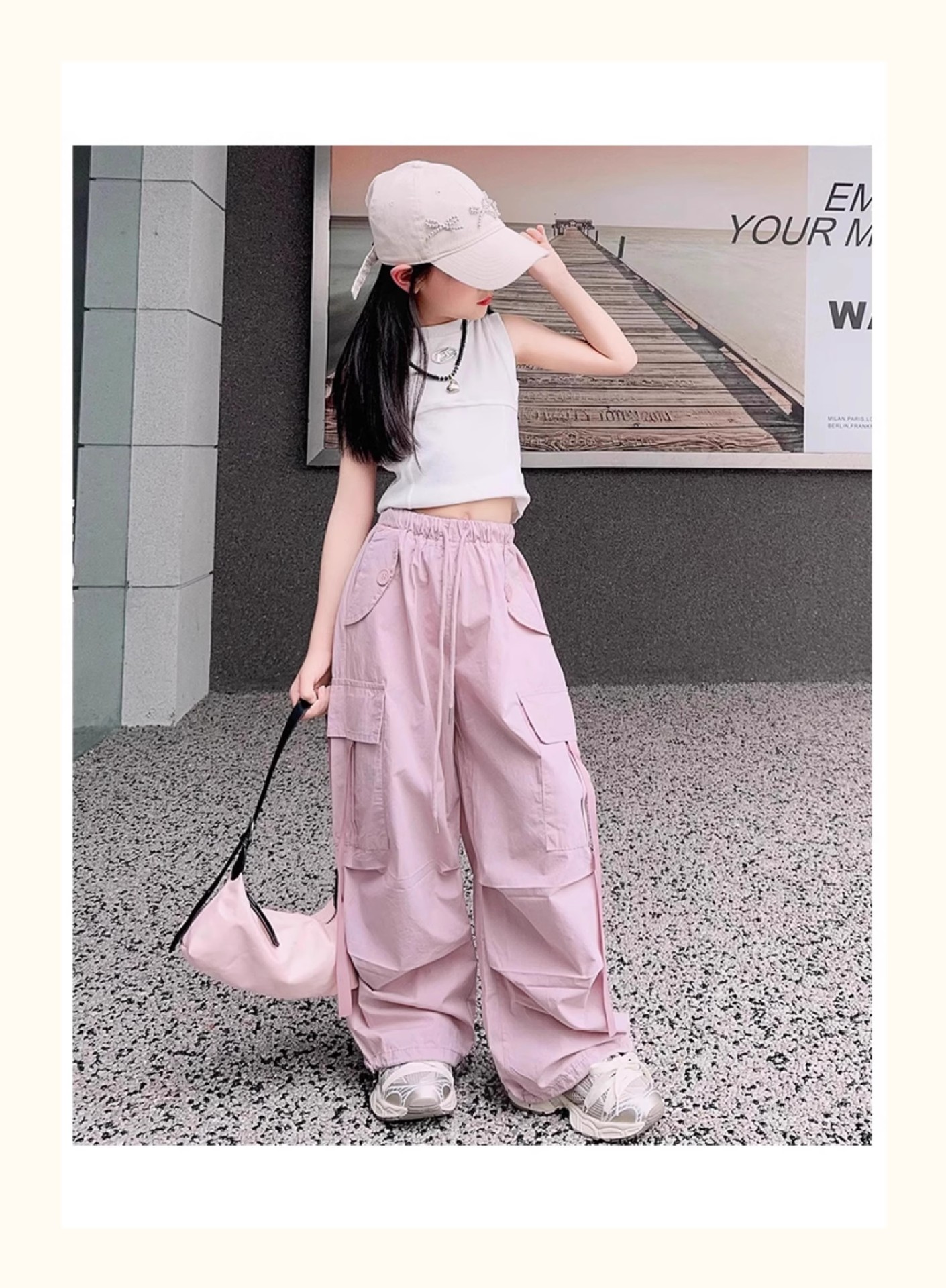 소녀 작업복 여름 새로운 도착 2025 새로운 도착 소녀 유행 루즈 스파이스 소녀 스타일 리본 캐주얼 바지