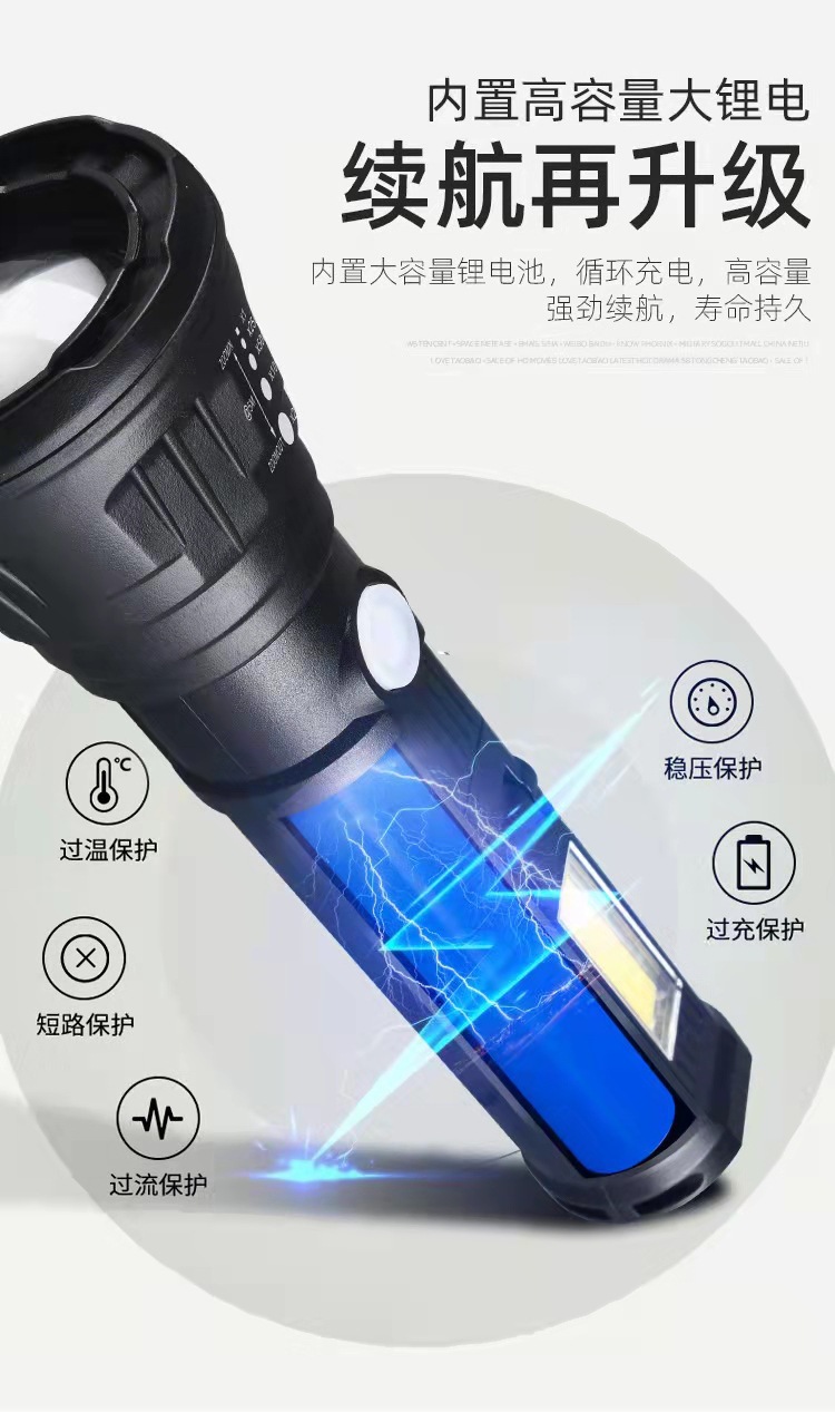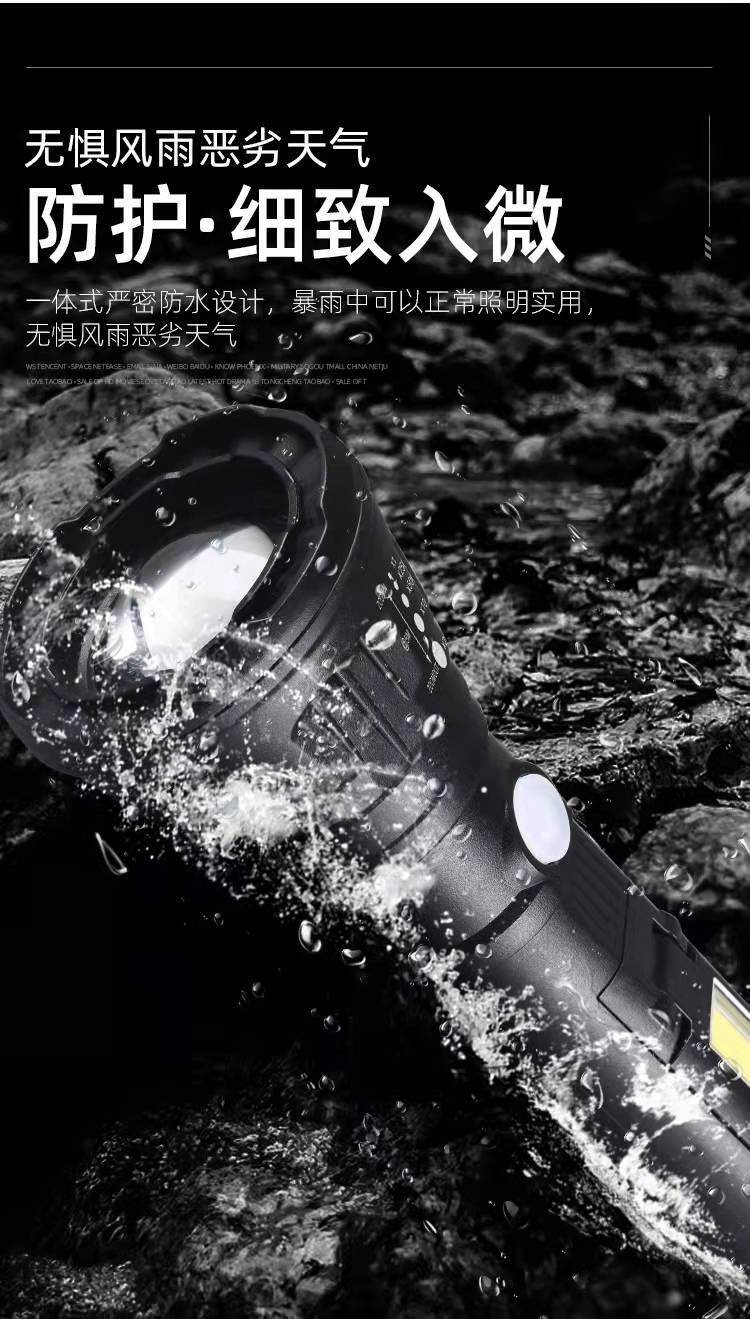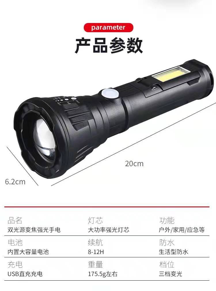 듀얼 광원 줌 강한 빛 손전등 야외 방수 USB 충전 텔레스코픽 줌 다기능 손전등 LED