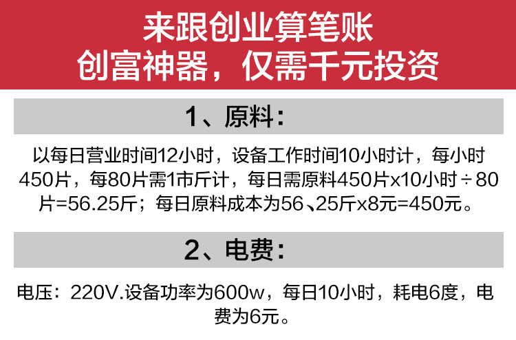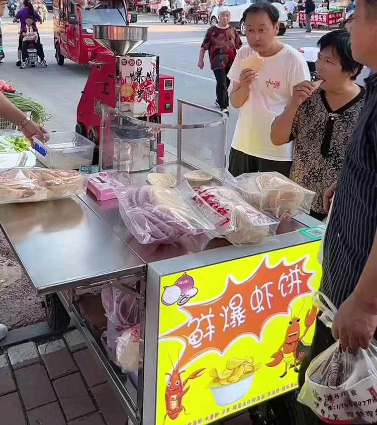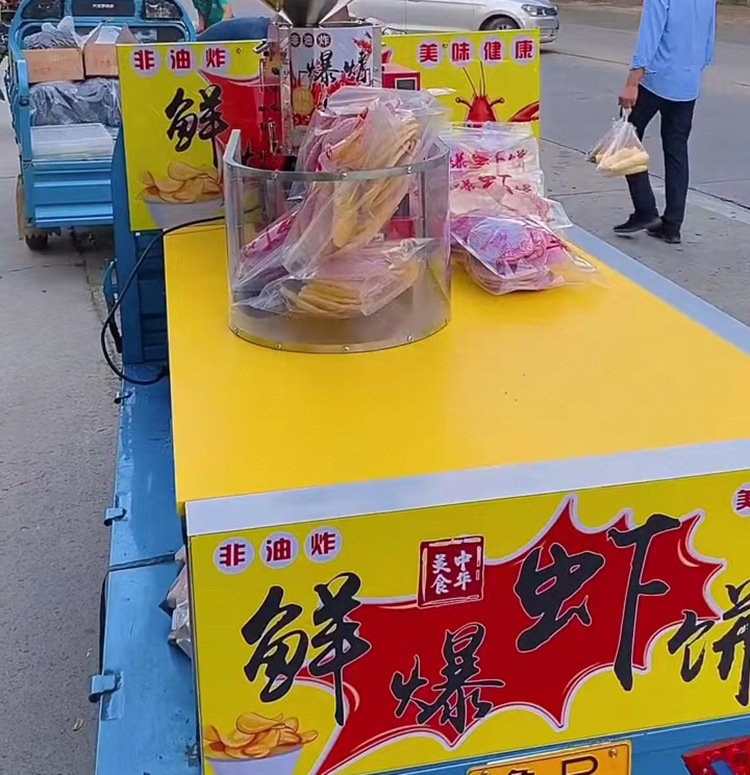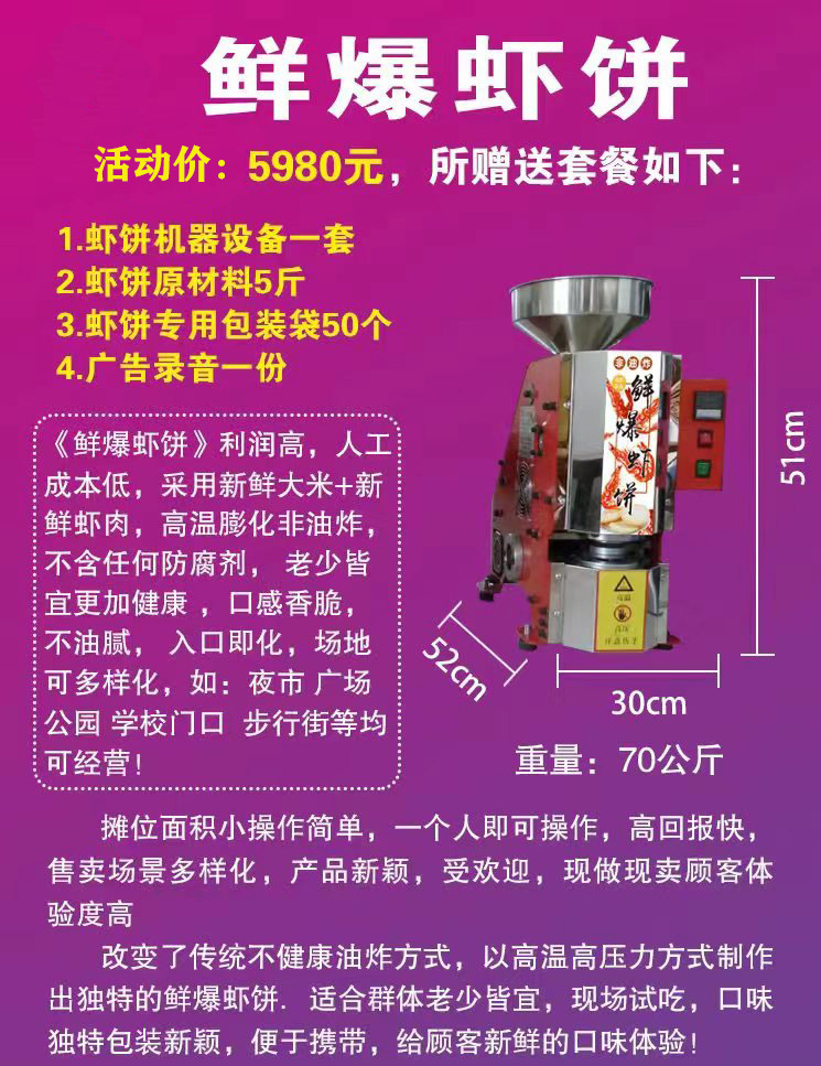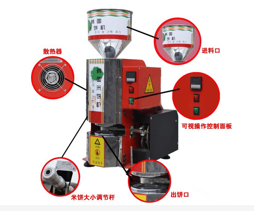 本机采用的是多味进口的营养米(小麦、大豆粉、米粉)为原料,爆出直径120-150毫米、厚5毫米的饼,是一种低脂肪健康即食的当前绝顶的时尚休闲食品。爆出的饼口味多样化、功能化;口感酥脆、咸、香、辣味食足;有助于营养的吸收和消化,深受广大青年人、中年人、老年人、特别是儿童的喜爱。即是低热量食品,也是减肥食品,市场潜力巨大,充满诱惑感;非常适合小型投资者经营,投资小,见效快,高利润。本机采用国际先进技术,外观色泽鲜艳,造形美观,豪华、高雅,使用方便,省电、耐用等特点。视觉冲击效果很吸引人群、聚人快、随时可提升消费者的购买欲望,快速形成销售的氛围。