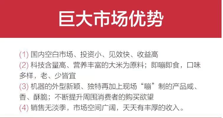 3、科技含量高、专利技术、专用进口营养米为原料;即嘣即食;口味多样,入口即化; 老、少皆宜