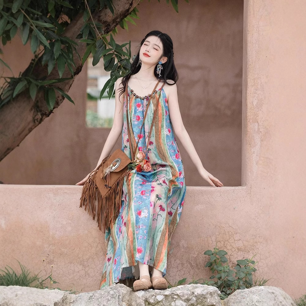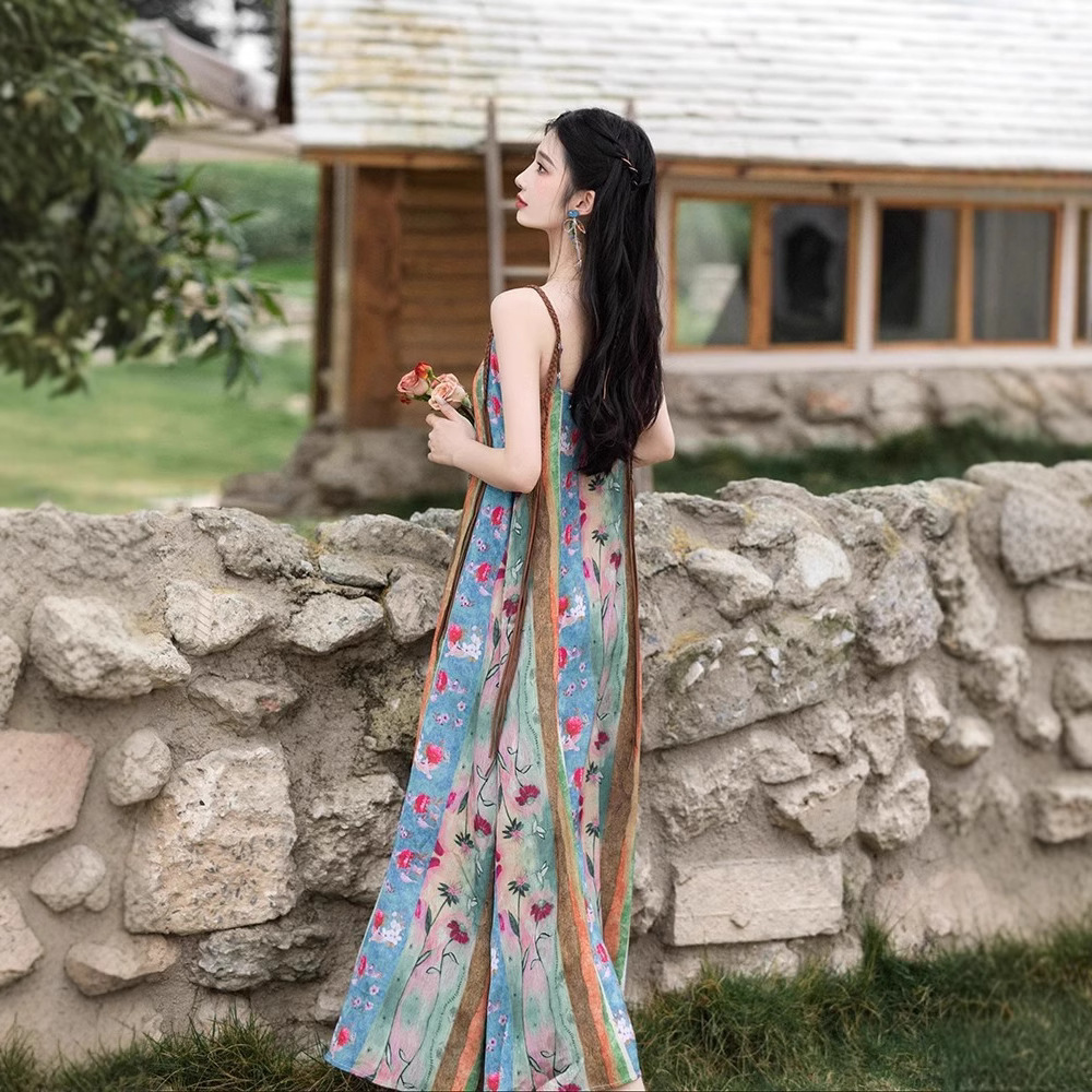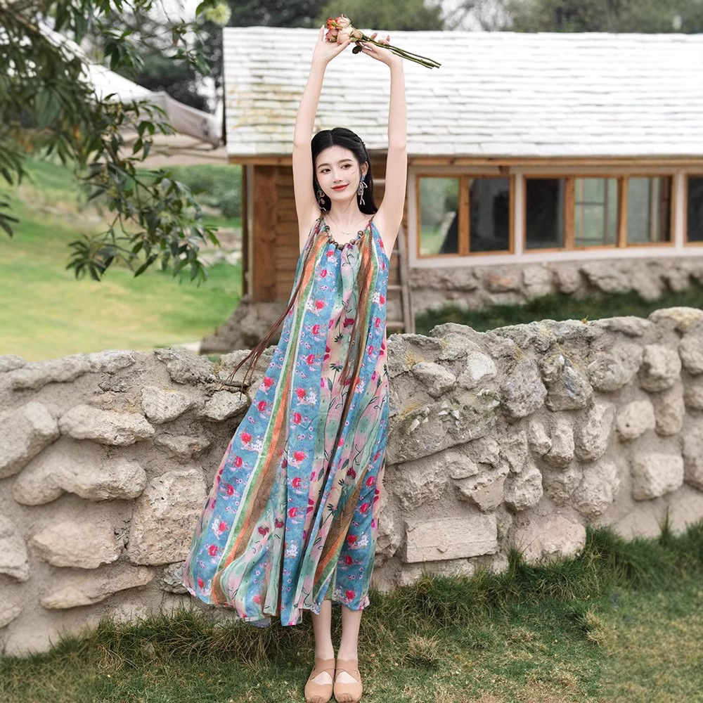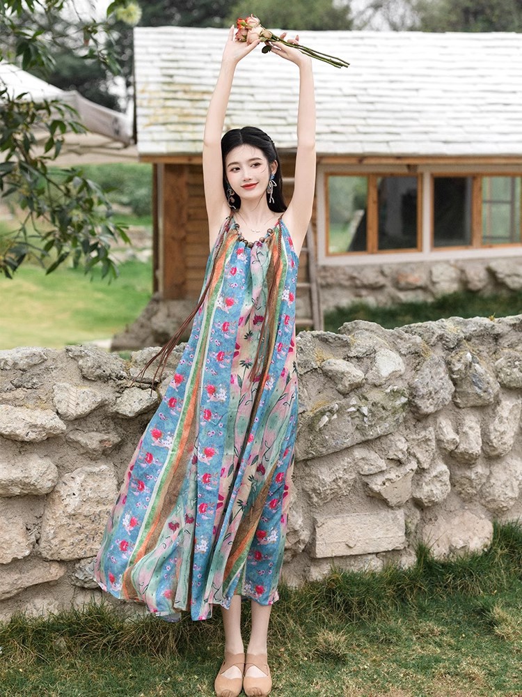 새로운 중국 스타일 국가 스타일 세트 윈난 여행복 여성복 민족 스타일 사진 유화 슬링 원피스 카디건스토어 가기