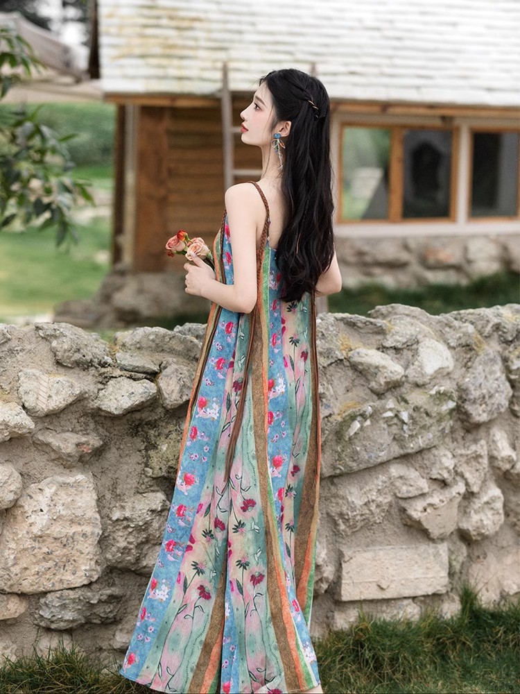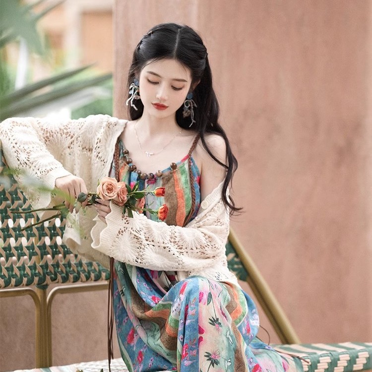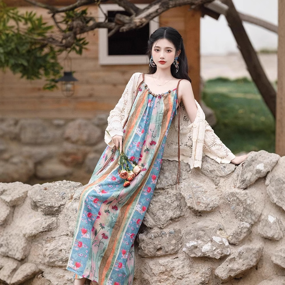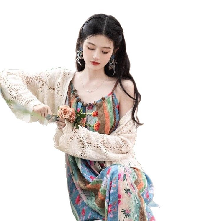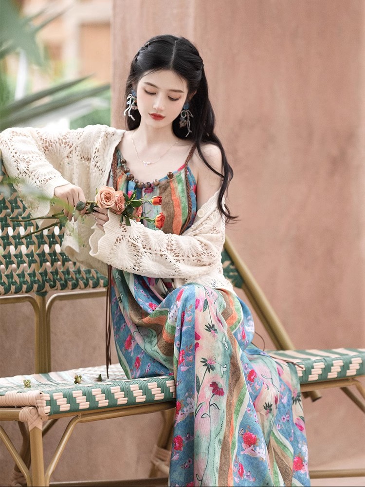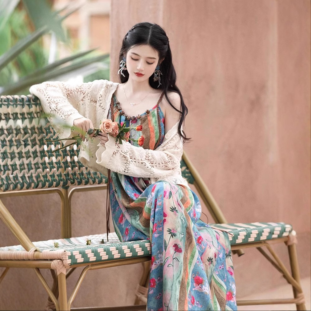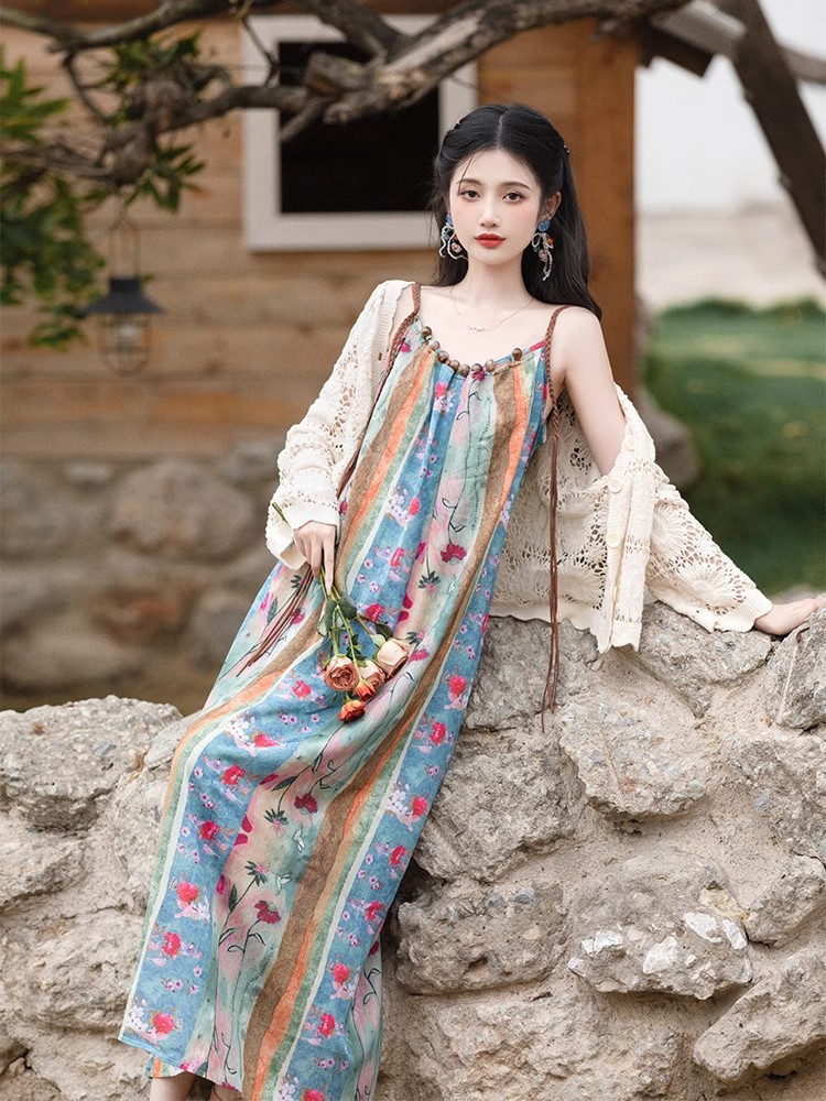 새로운 중국 스타일 국가 스타일 세트 윈난 여행복 여성복 민족 스타일 사진 유화 슬링 원피스 카디건