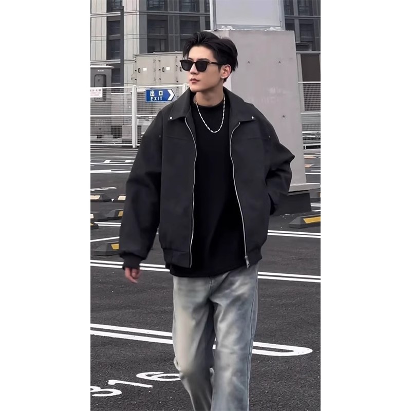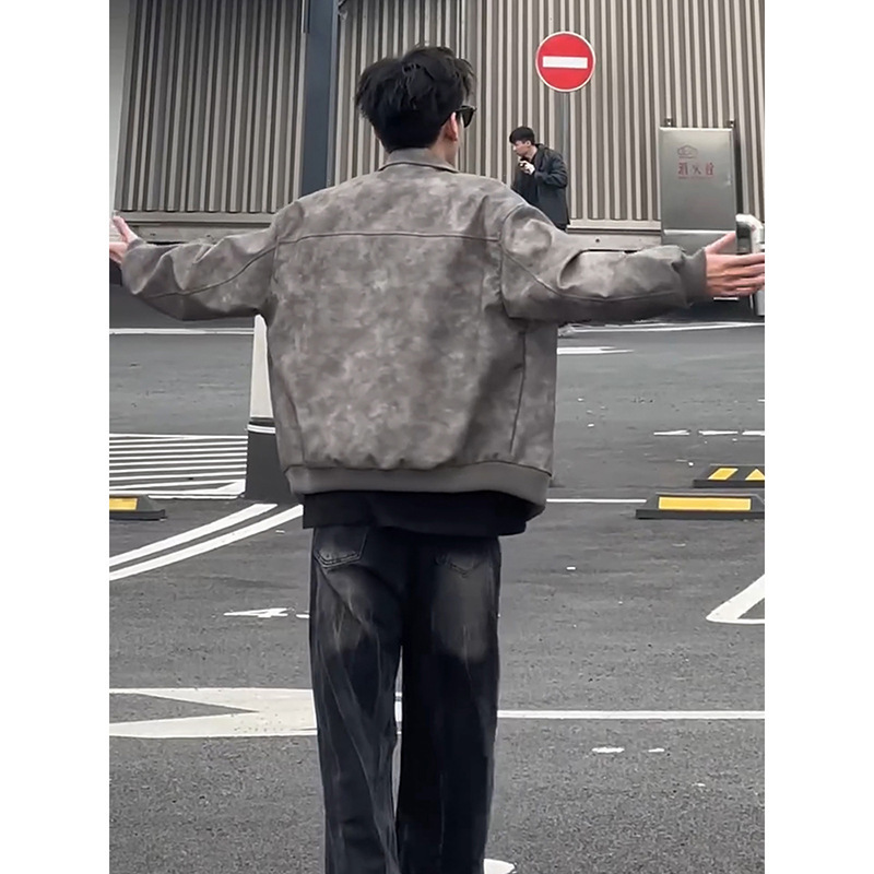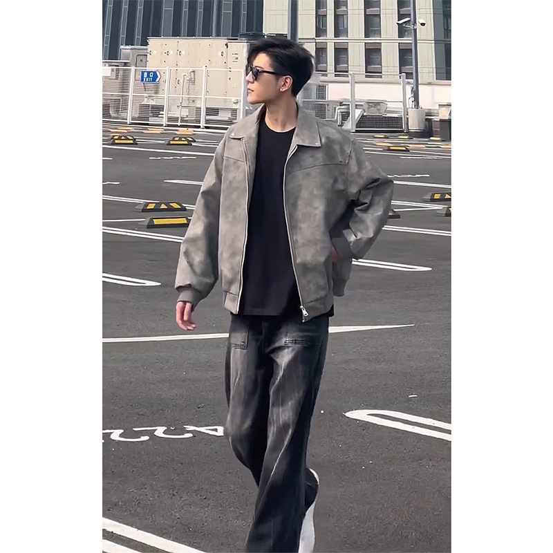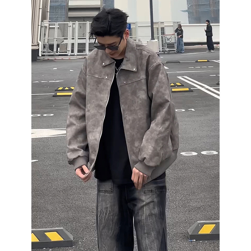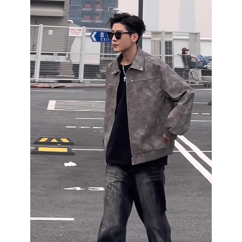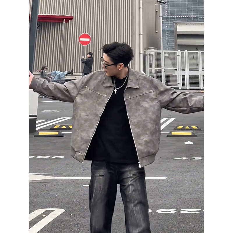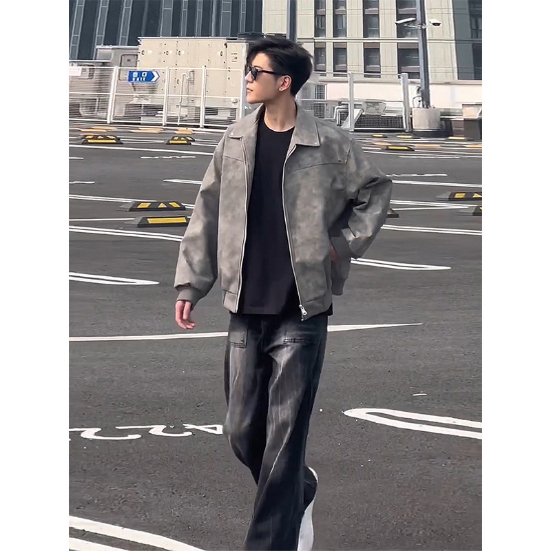 클린 핏 그레이 짧은 가죽 자켓 아메리칸 스타일 리퍼 잘 생긴 남성용 레트로 옷깃 오토바이 가죽 자켓스토어 가기
