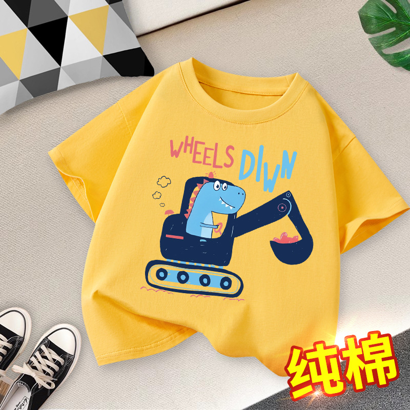• 【순면 반팔 티셔츠】 굴삭기 공룡/노란색
