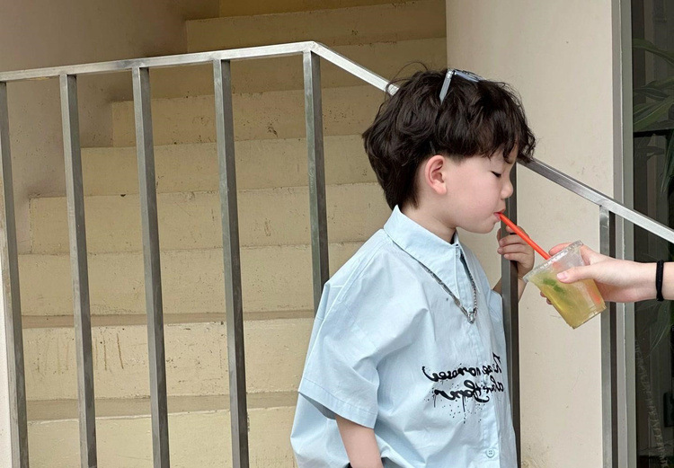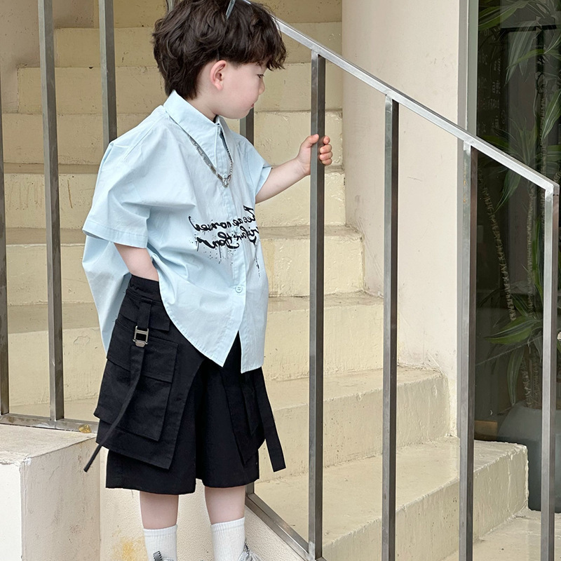 소년 '2025 여름 새로운 어린이 편지 인쇄 랩 블루 셔츠 어린이 유행 탑스토어 가기